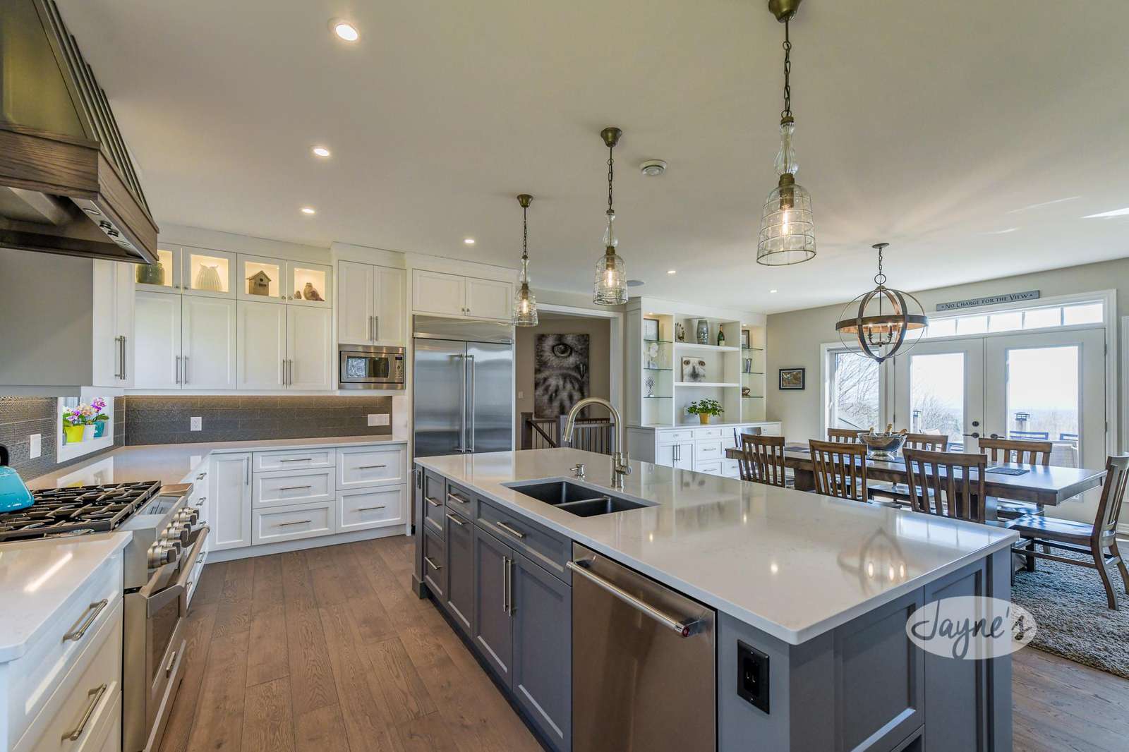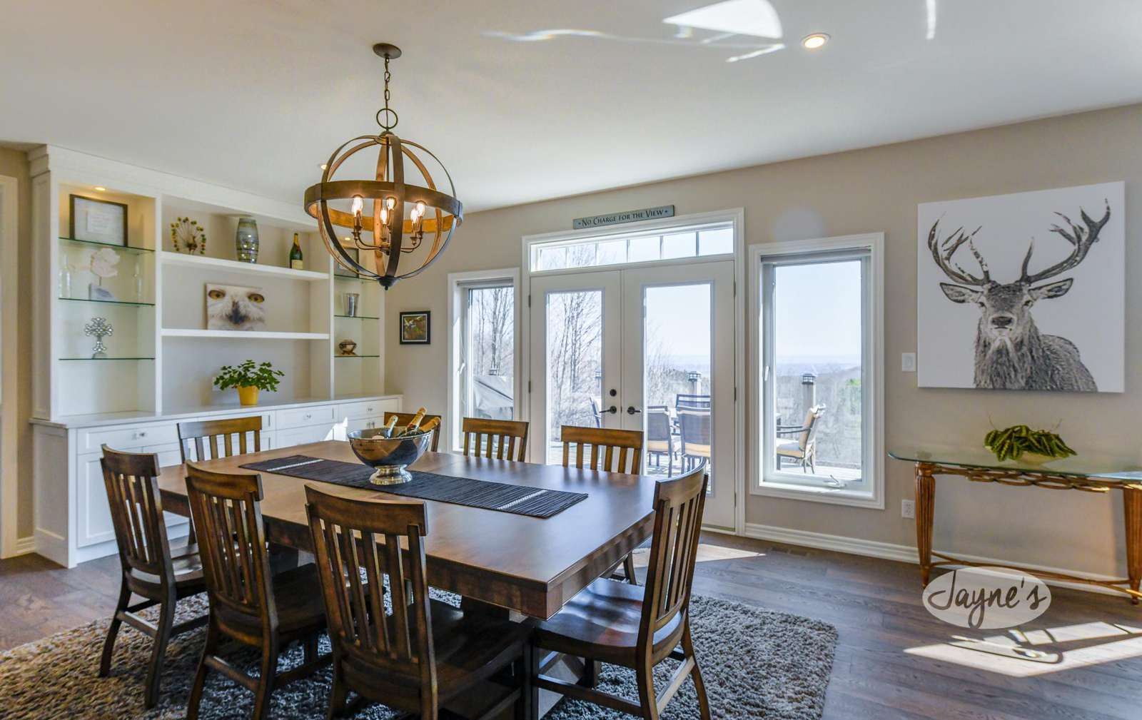 Open-concept dining room with seating for 8 with a walkout to the back deck.