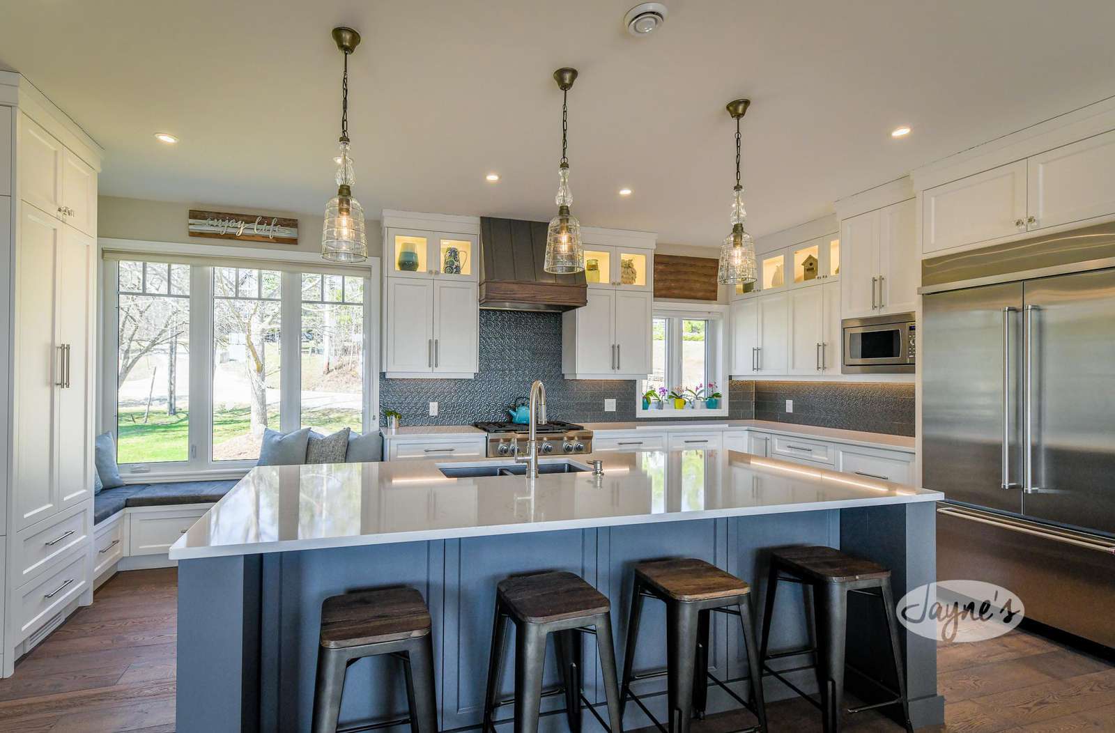 The big, bright and fully equipped kitchen boasts high-end appliances, a kitchen island with seating for 4 and an oversized fridge/freezer with an ice maker.