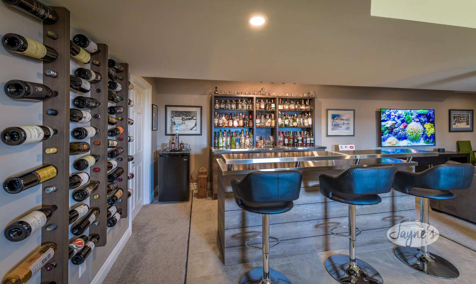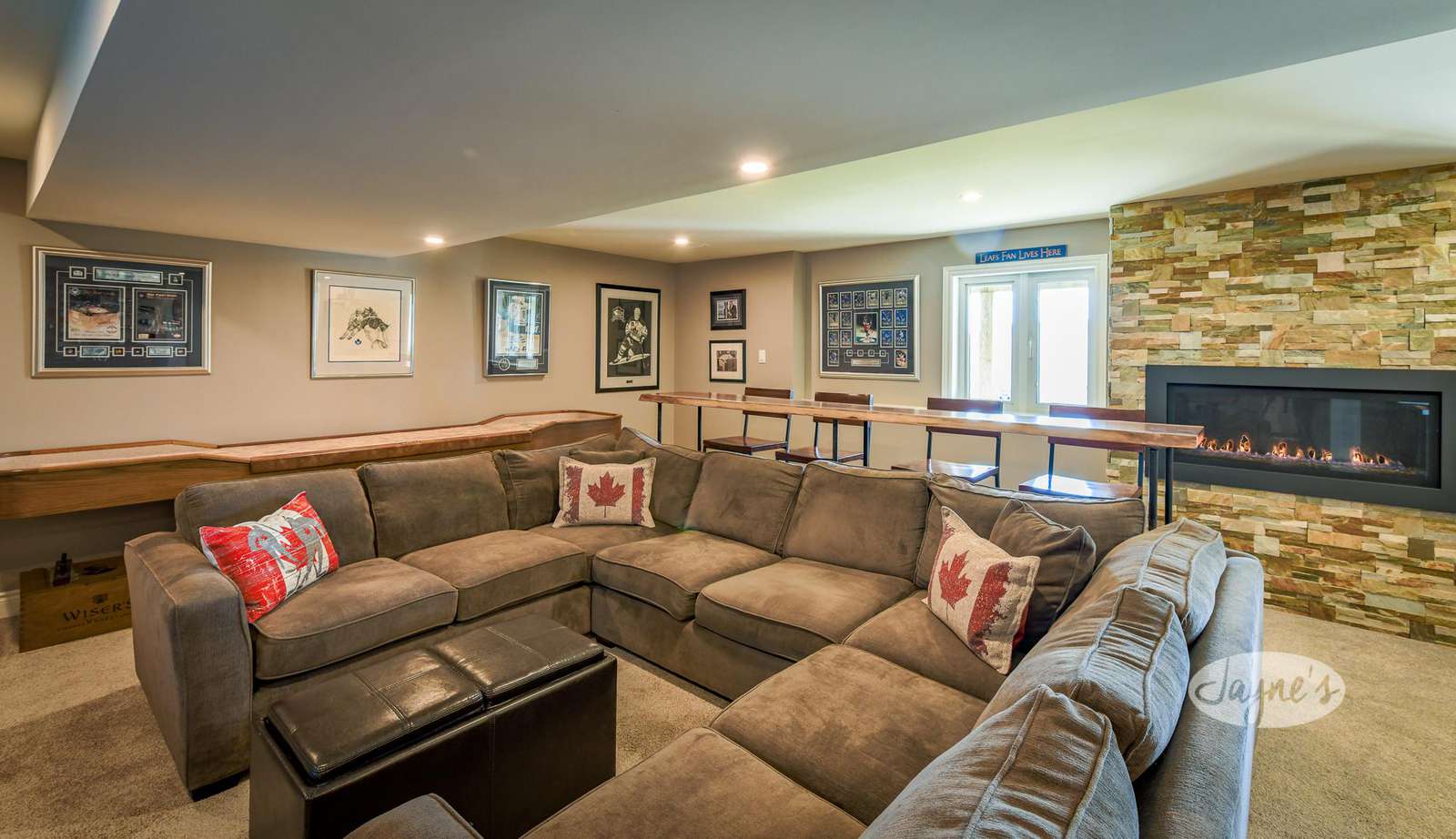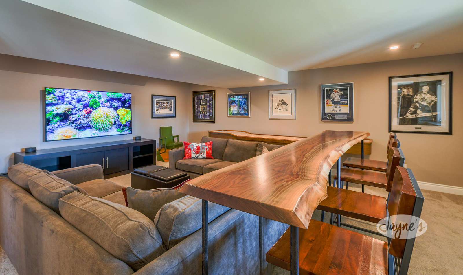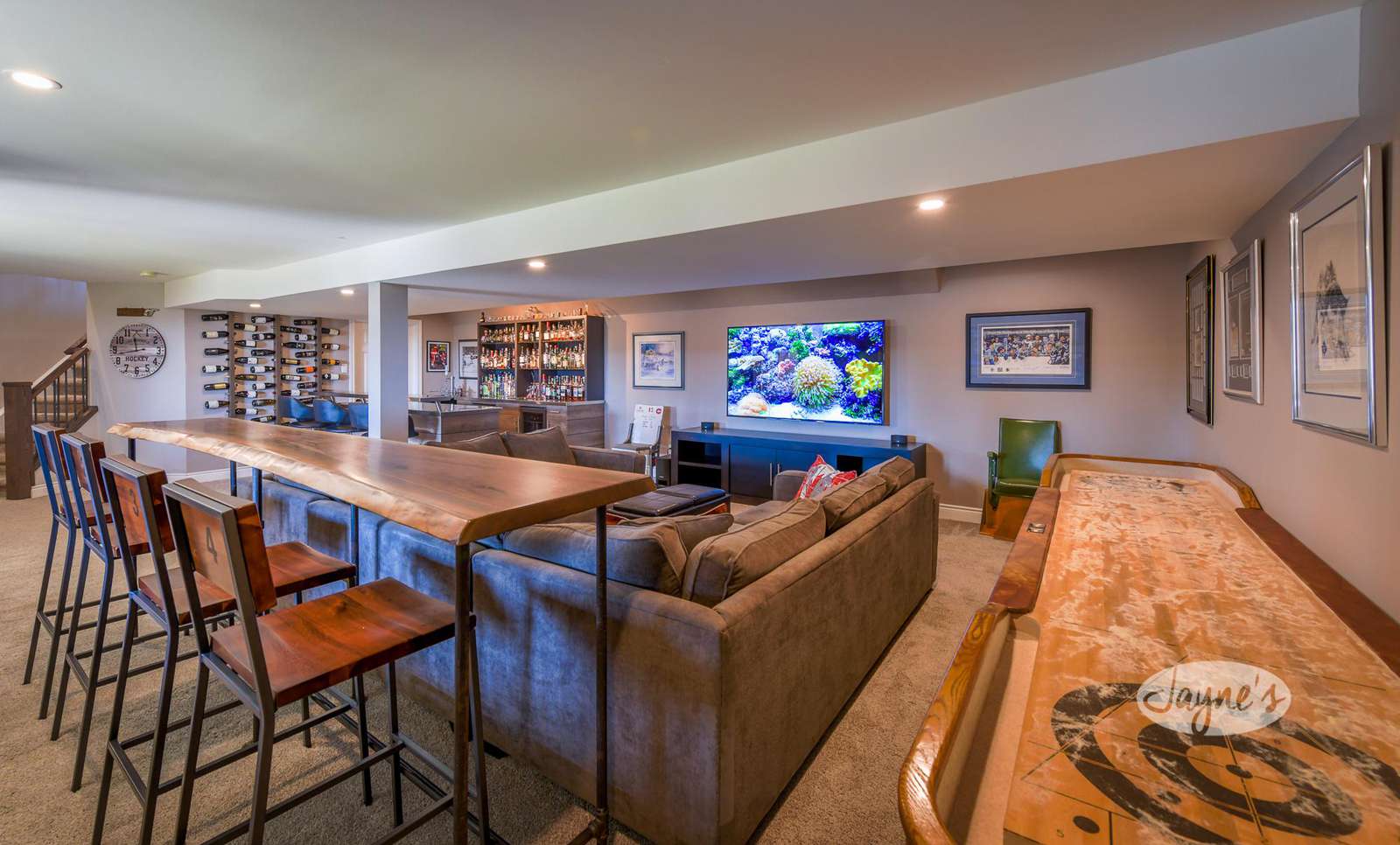 The outstanding entertainment room boasts a oversized, U-shaped sectional surrounding a 75" flatscreen TV. Live-edge stadium seating for 4 can be found directly behind the couch. A Shuffle Board Table is featured along the back wall. A stainless-steel wet bar contains both a mini-fridge and a wine cooler, with additional swivel seating for 3.
