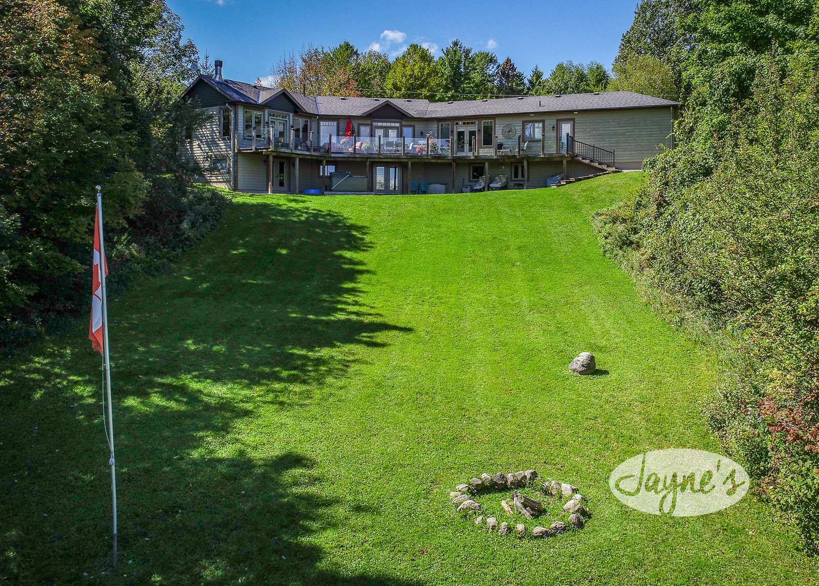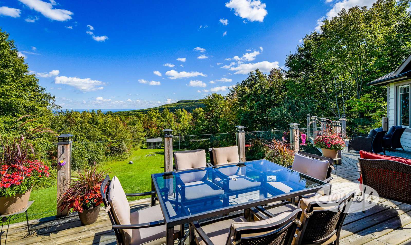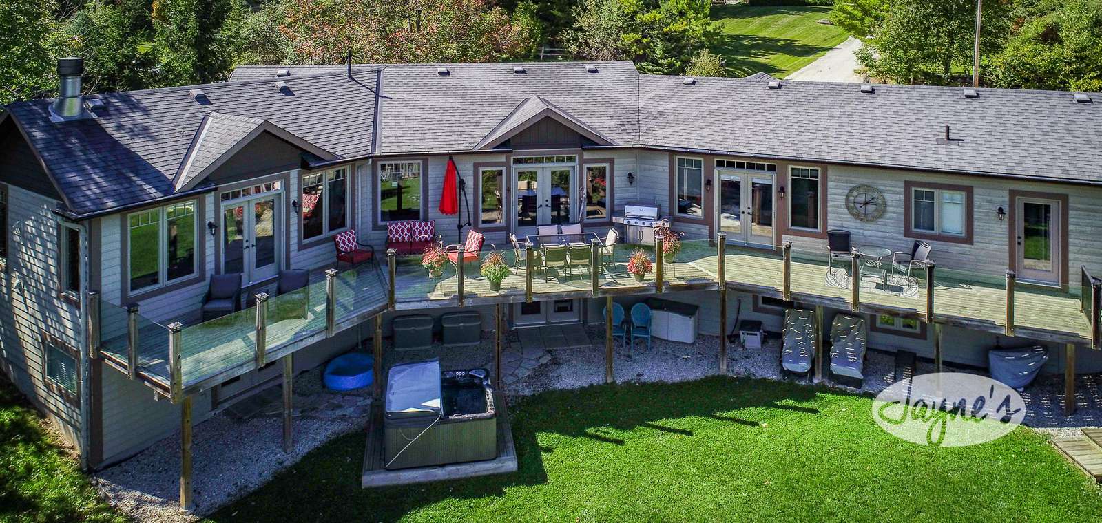 THE SUNSHINE CHALET - Arrive via the U-shaped driveway within Castle Glen Estates. Around back, an 85 foot deck offers 19 pieces of furniture to enjoy under the all-day-sun! Including a Weber BBQ, dining table for 6 and an abundance of cushioned seating. An outdoor hot tub on the lower level and a sauna offer a soothing end to a long day on the slopes and trails. Further down the yard a fire pit with seating for 6 invites you to enjoy s'mores while gazing for the big dipper!