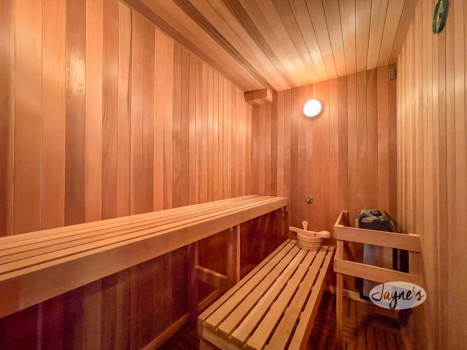The cedar sauna seats 4 people comfortably and is located after the first office space.