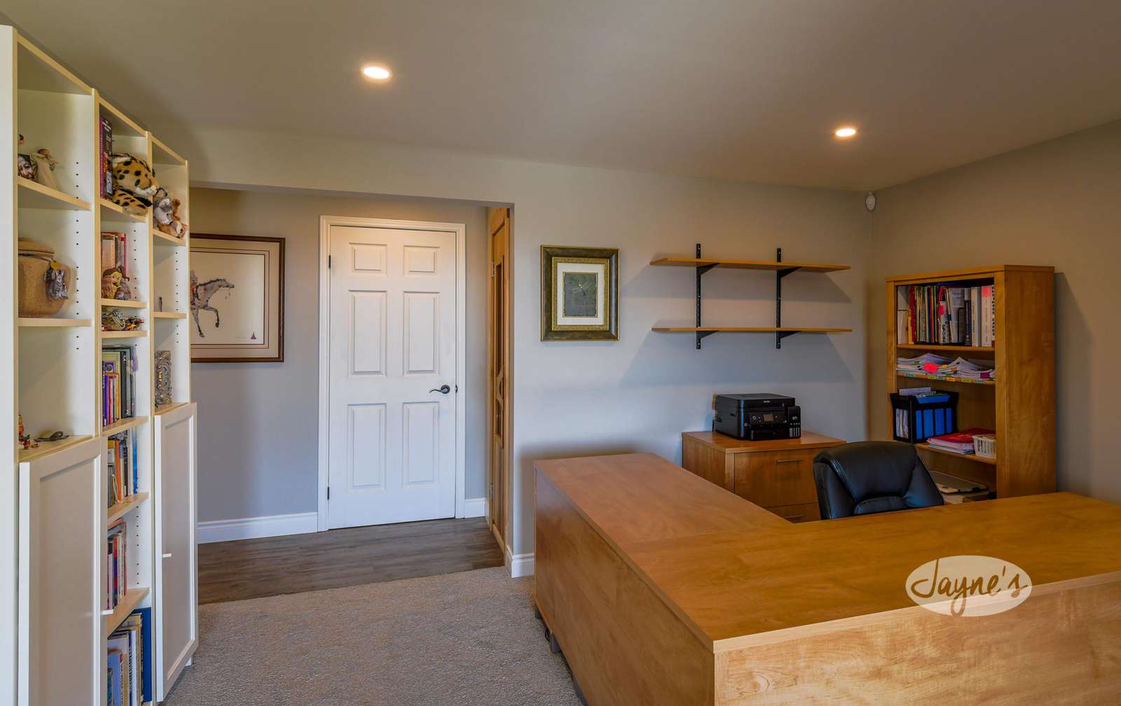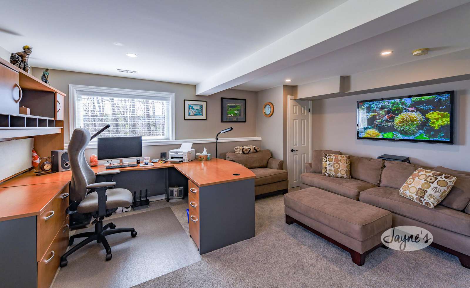 Two separate office workspaces can be found in the well-appointed basement. The first is located off the entertainment room and provides direct access to the outdoor hot tub. The second is privately located in the far right wing of the lower level. It features a sofa, armchair, ottoman, TV and also provides direct access to the outdoor hot tub.