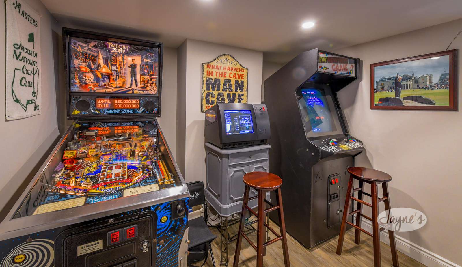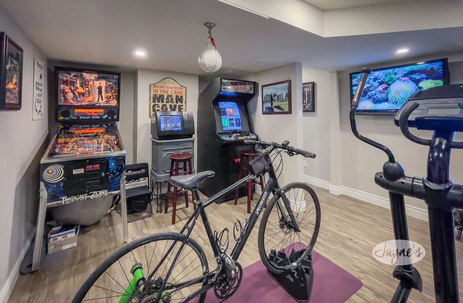 Features a treadmill, elliptical, kinetic bike trainer, speed bag, and TV in addition to 3 arcade machines (Twilight Zone pinball machine and old school Pac Man).