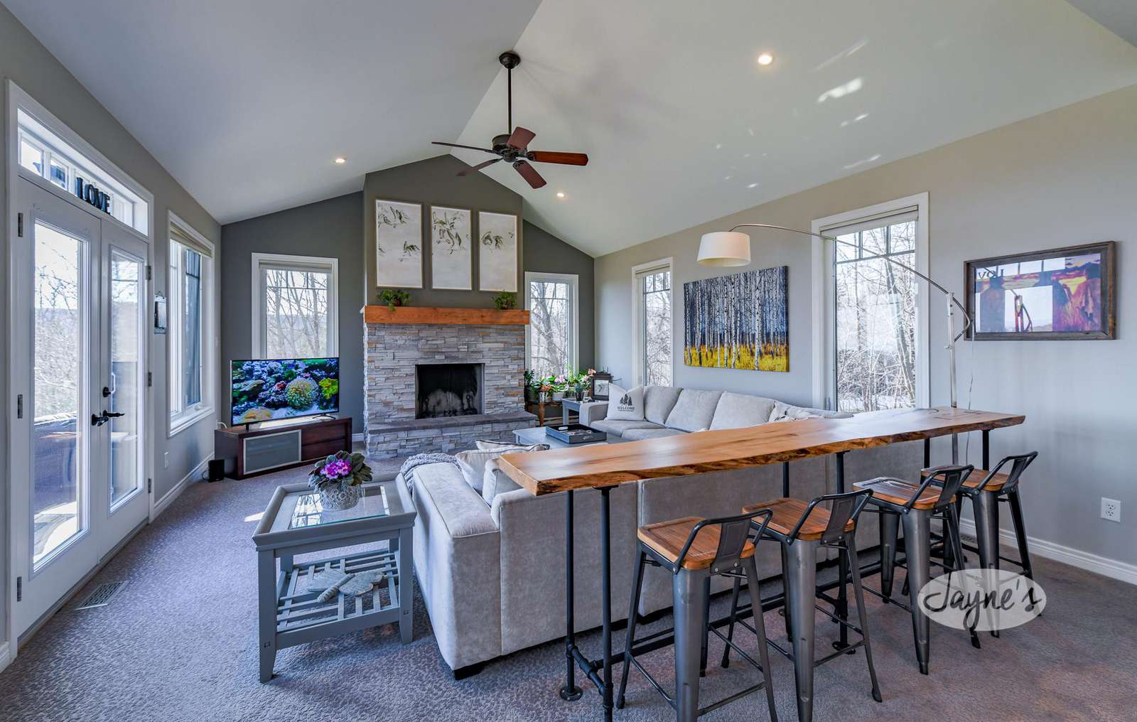 Features an oversized L-shaped sofa surrounding a wood burning fireplace and a 50" flatscreen TV. Stadium seating for 4 can be found immediately behind the sofa. Floor to ceiling windows illuminate the house all day long.
