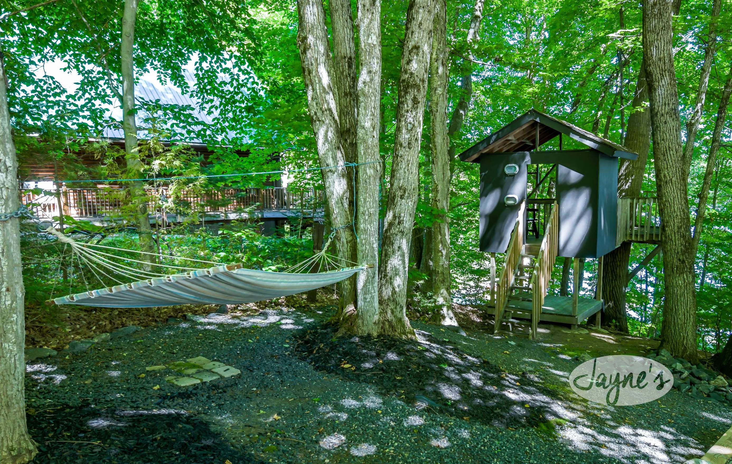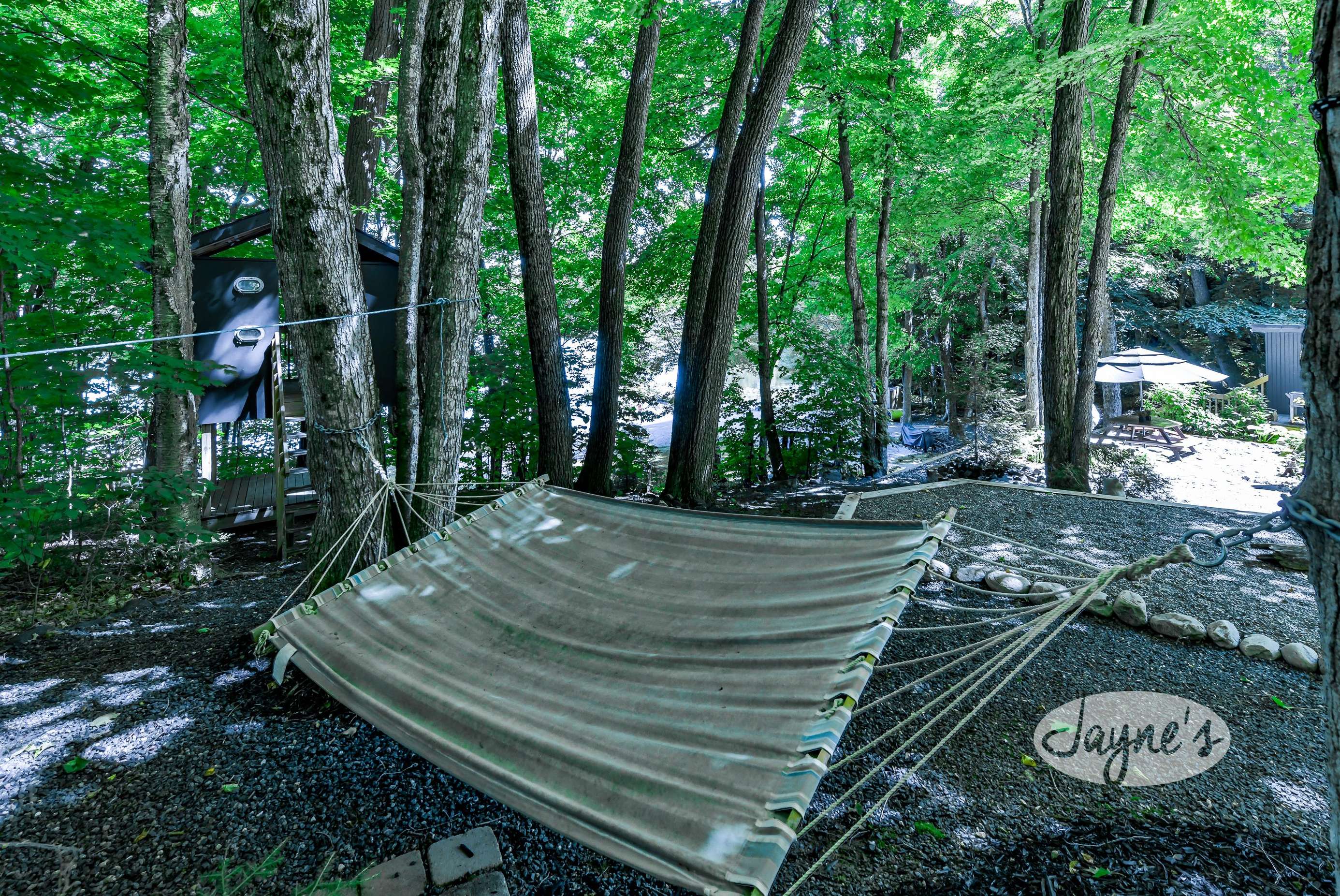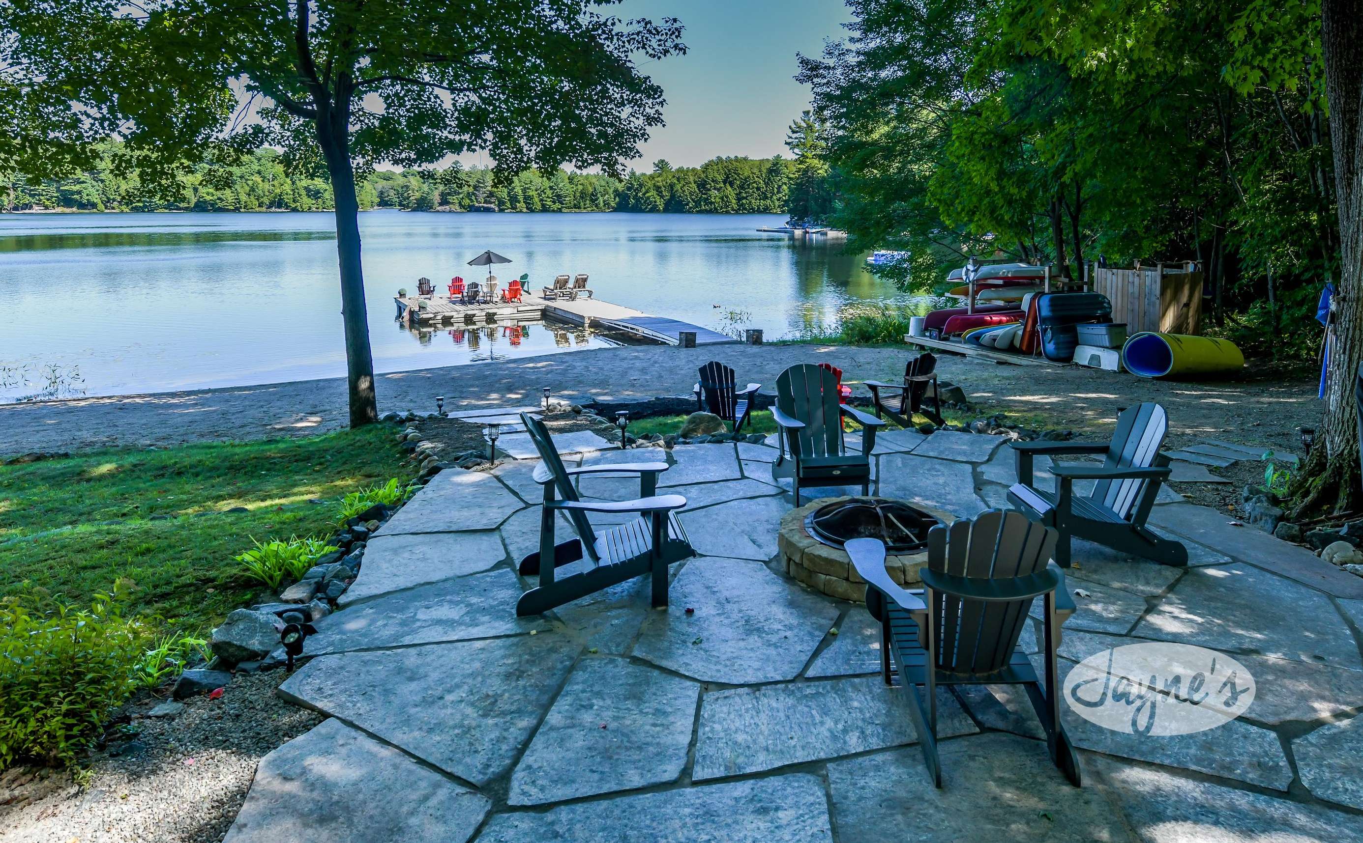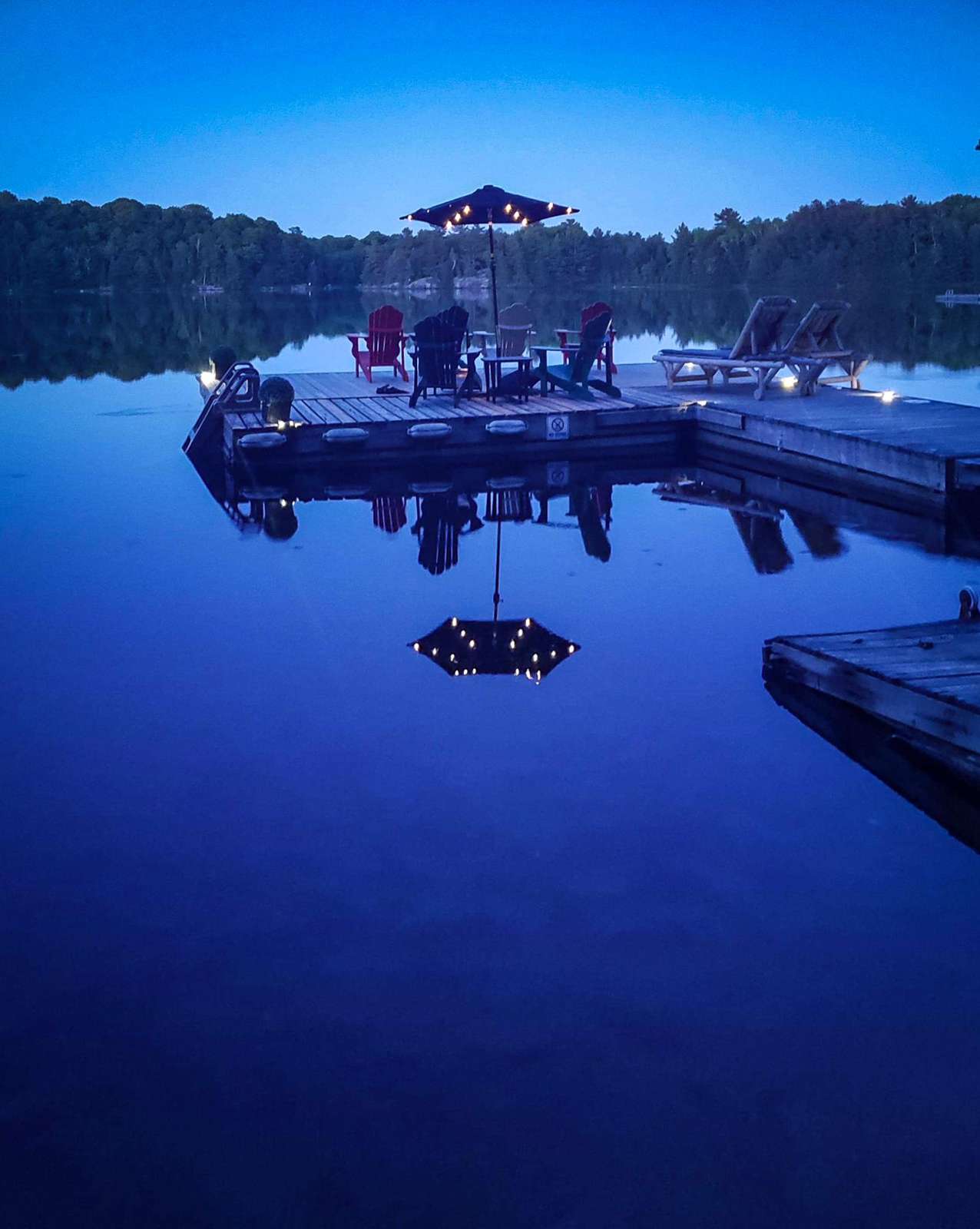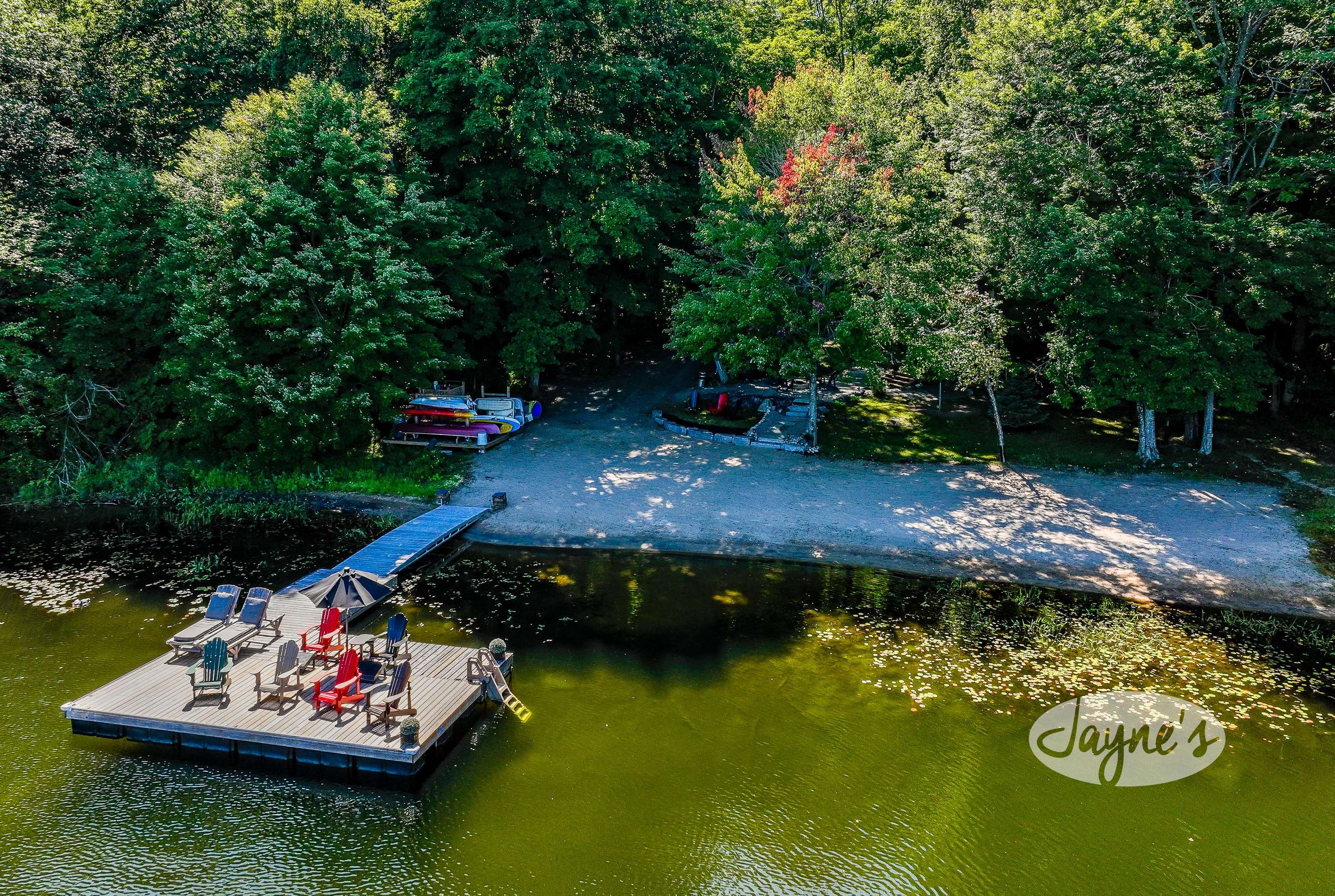 quiet and peaceful lake that guests can fully enjoy all hours of the day. As guests walk towards the dock, they will approach a bench with 2 Muskoka chairs that guests can watch the most spectacular sunrises and its reflection over the lake. Continuing onto the dock and right to the end, guests will find 2 lounger chairs, 6 Muskoka chairs, an umbrella and a fire pit! Walking back and heading up the stairs, the guests will see to their right, there is a bunkie, a hammock and a child size tree house with a spectacular view of the property!