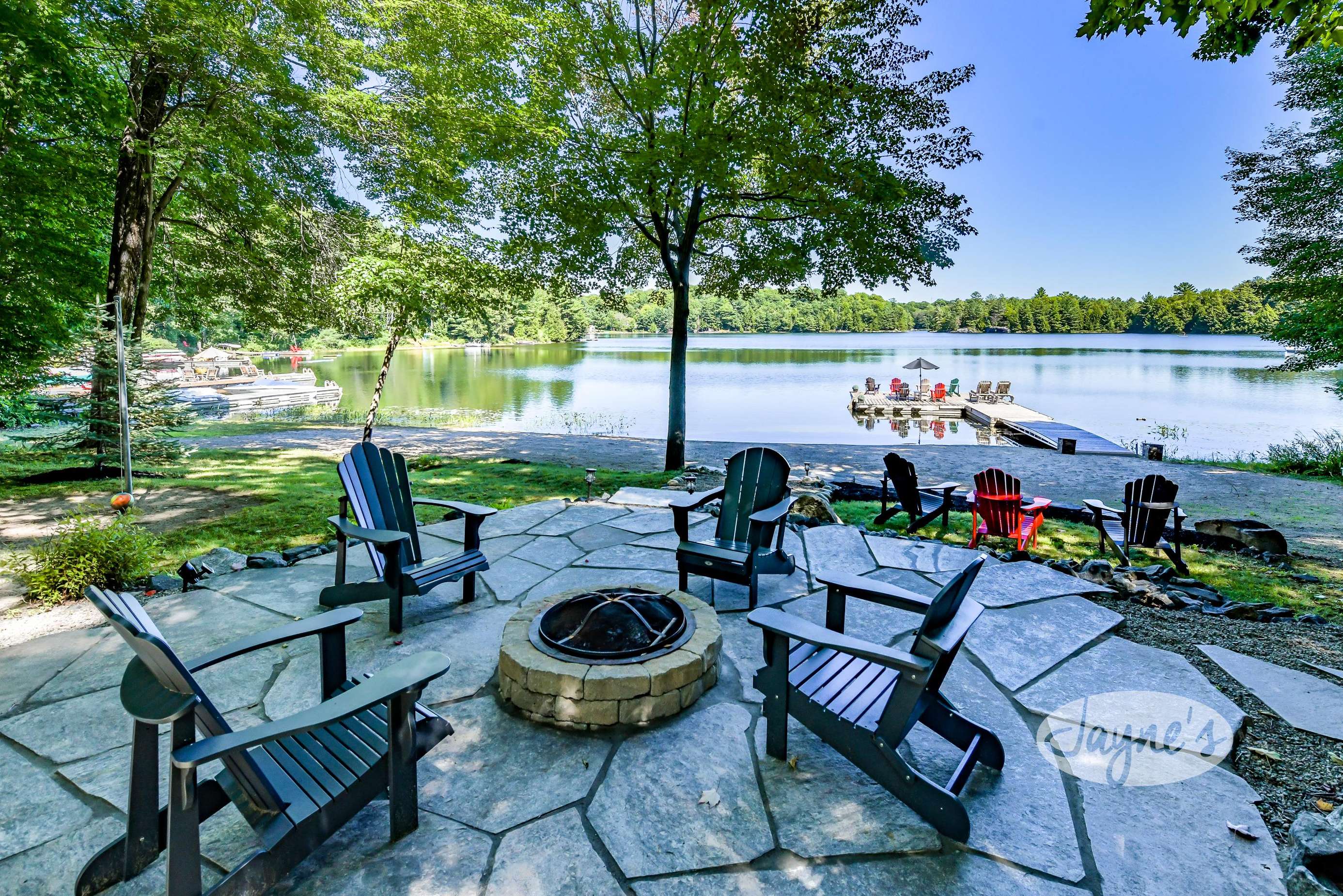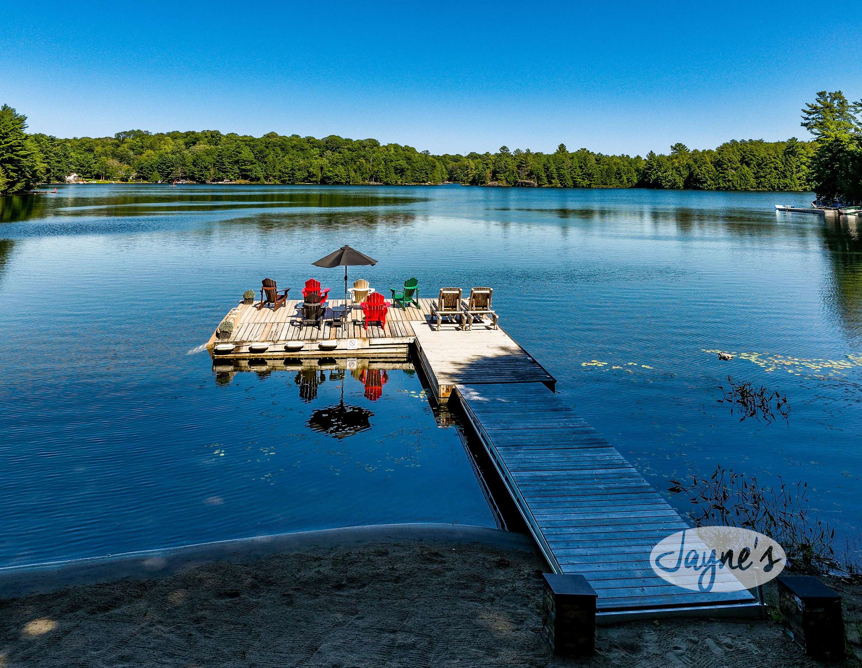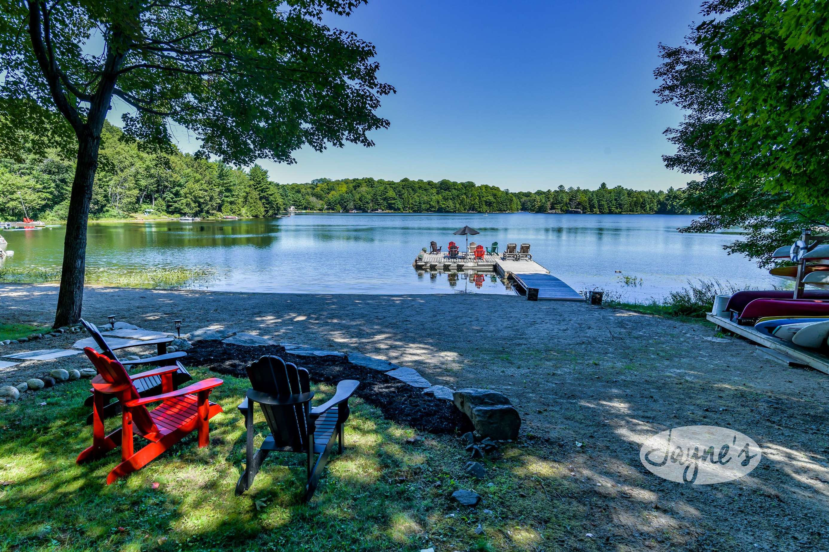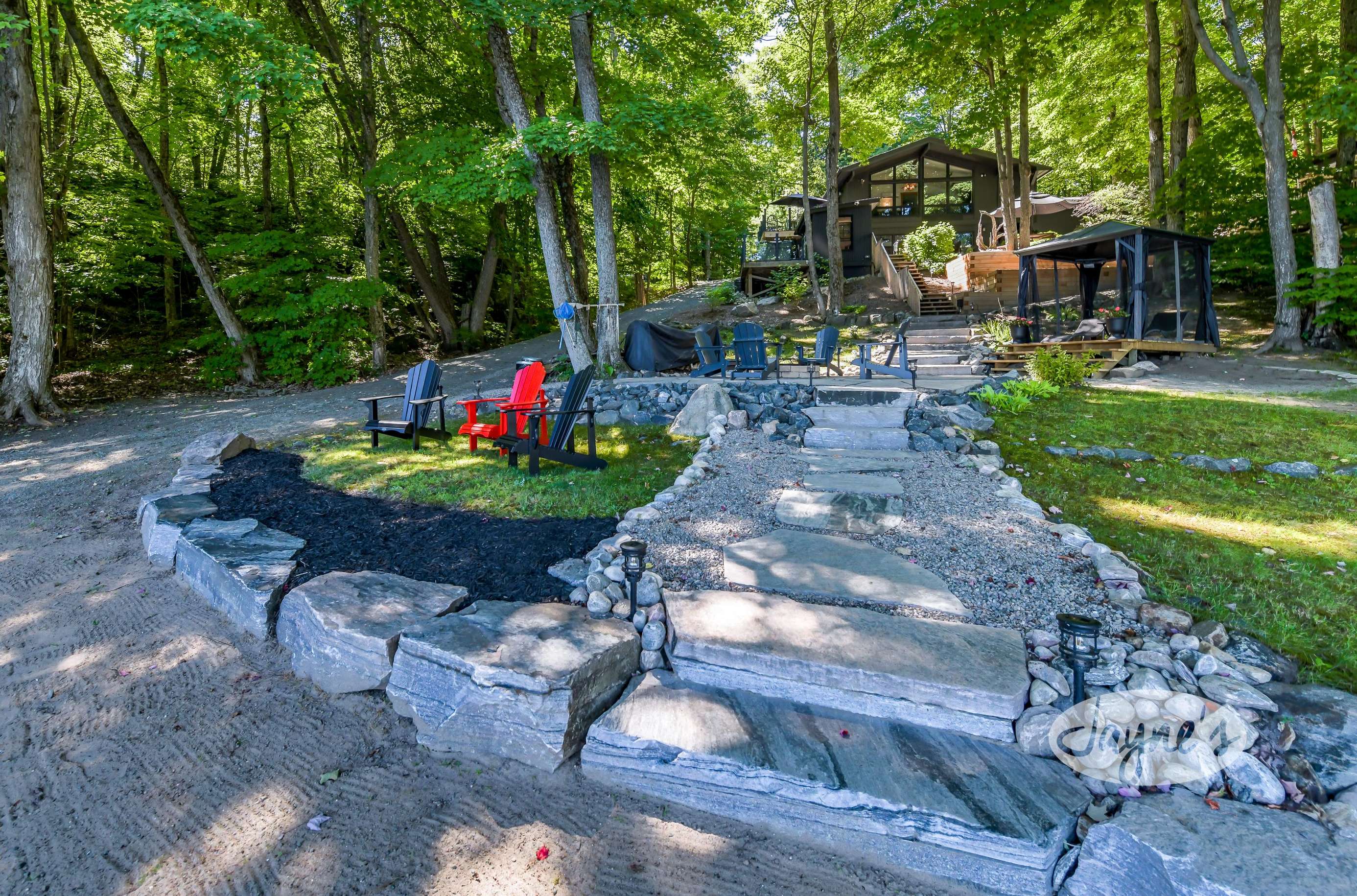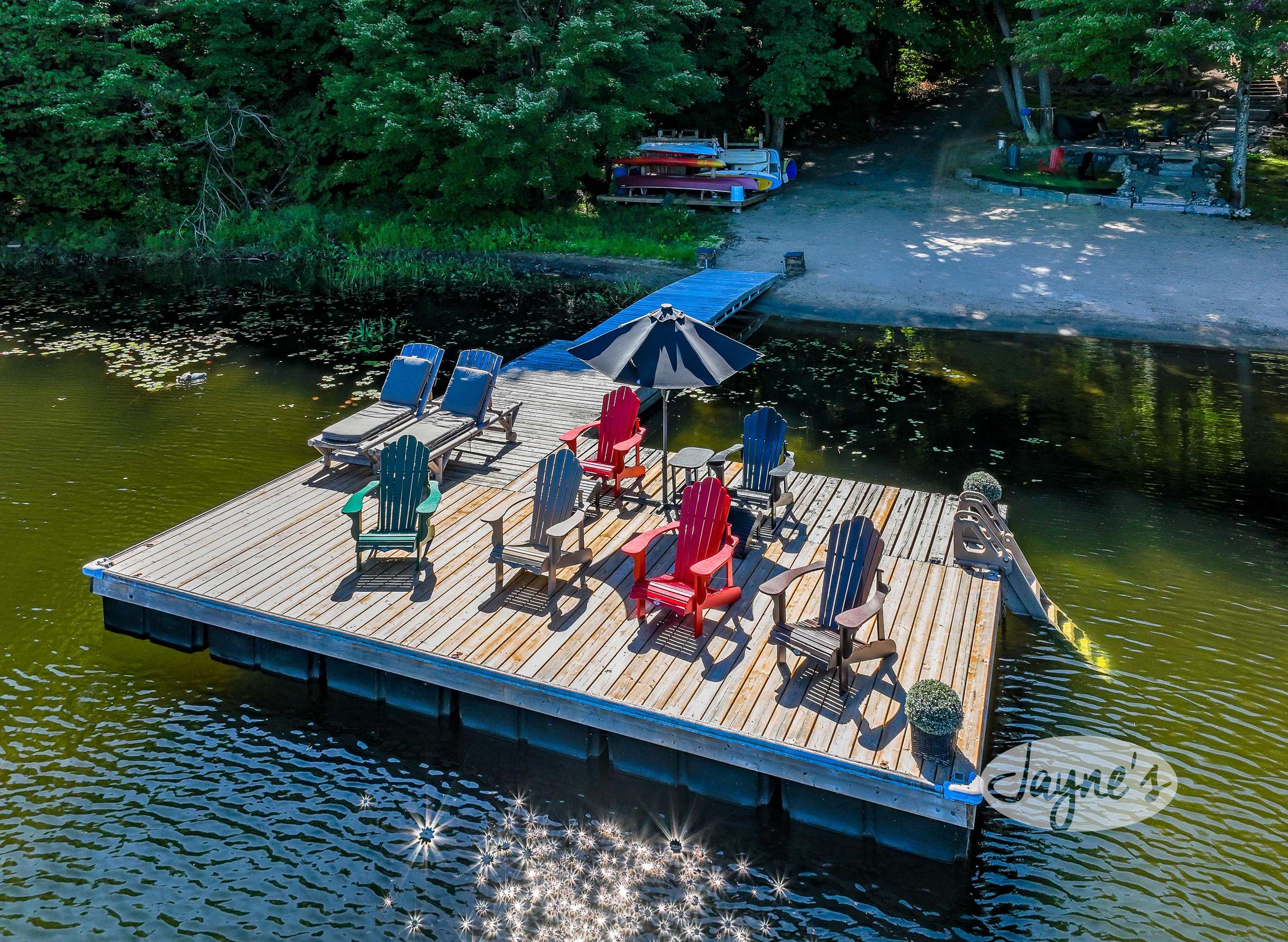 quiet and peaceful lake that guests can fully enjoy all hours of the day. As guests walk towards the dock, they will approach a bench with 2 Muskoka chairs that guests can watch the most spectacular sunrises and its reflection over the lake. Continuing onto the dock and right to the end, guests will find 2 lounger chairs, 6 Muskoka chairs, an umbrella and a fire pit! Walking back and heading up the stairs, the guests will see to their right, there is a bunkie, a hammock and a child size tree house with a spectacular view of the property!