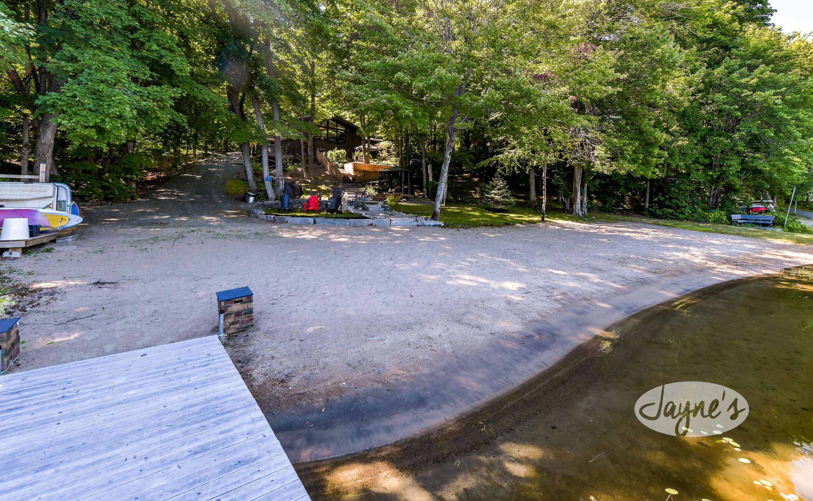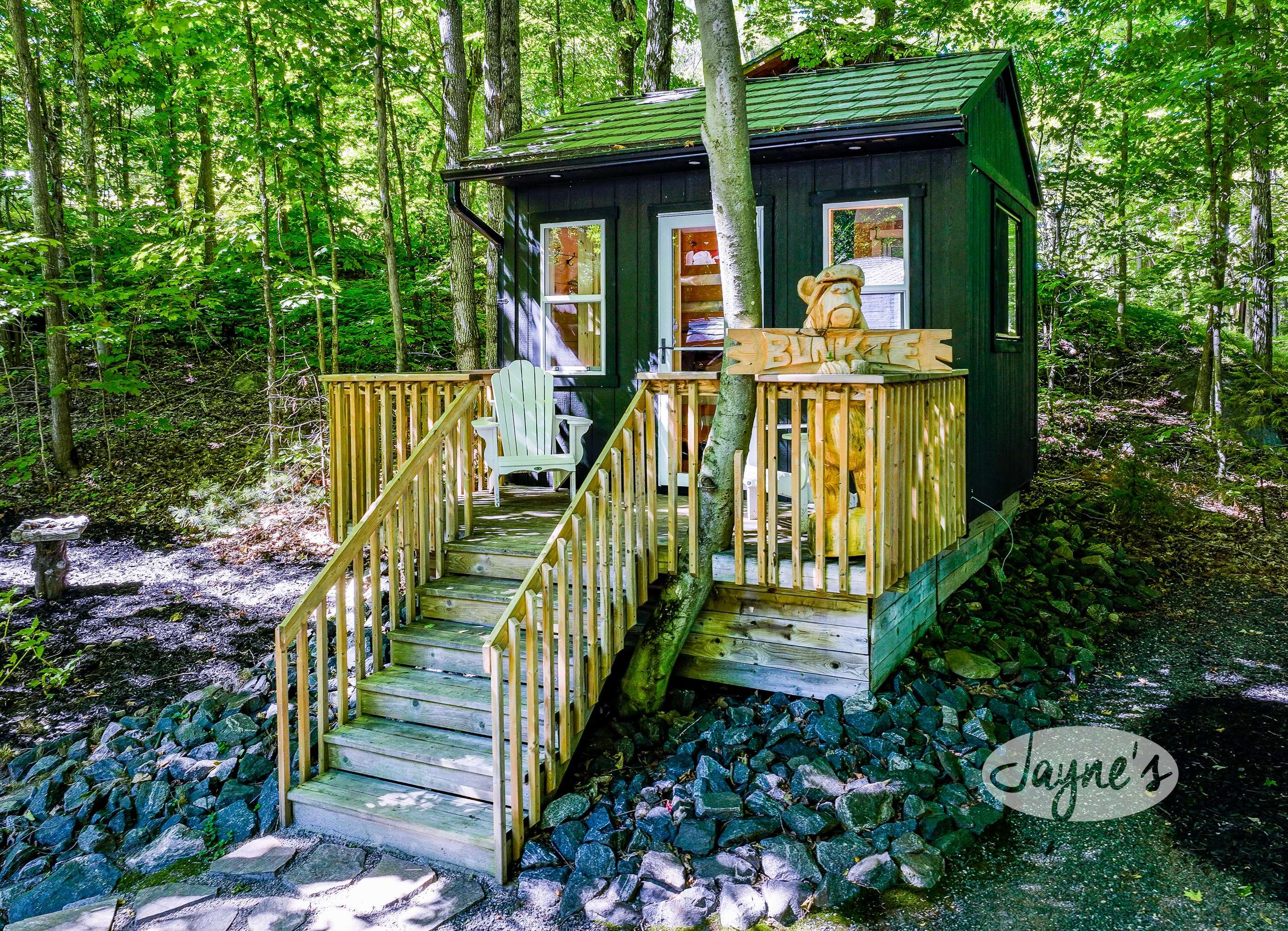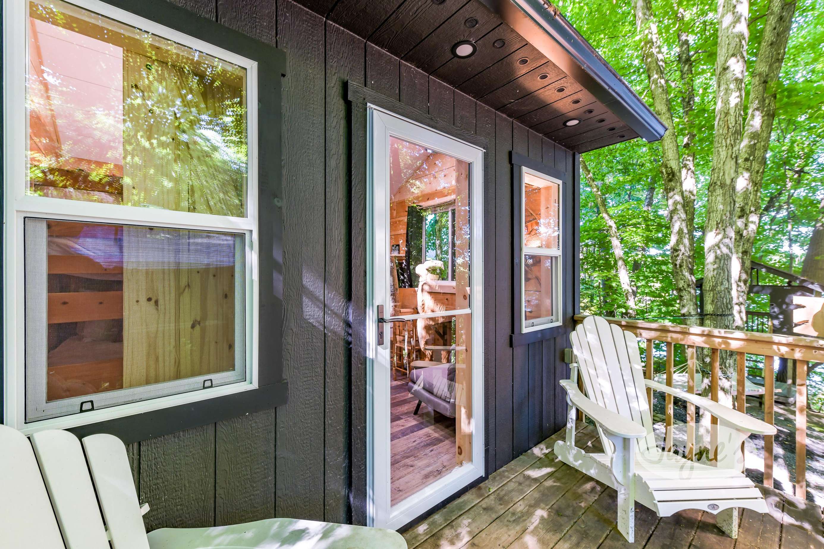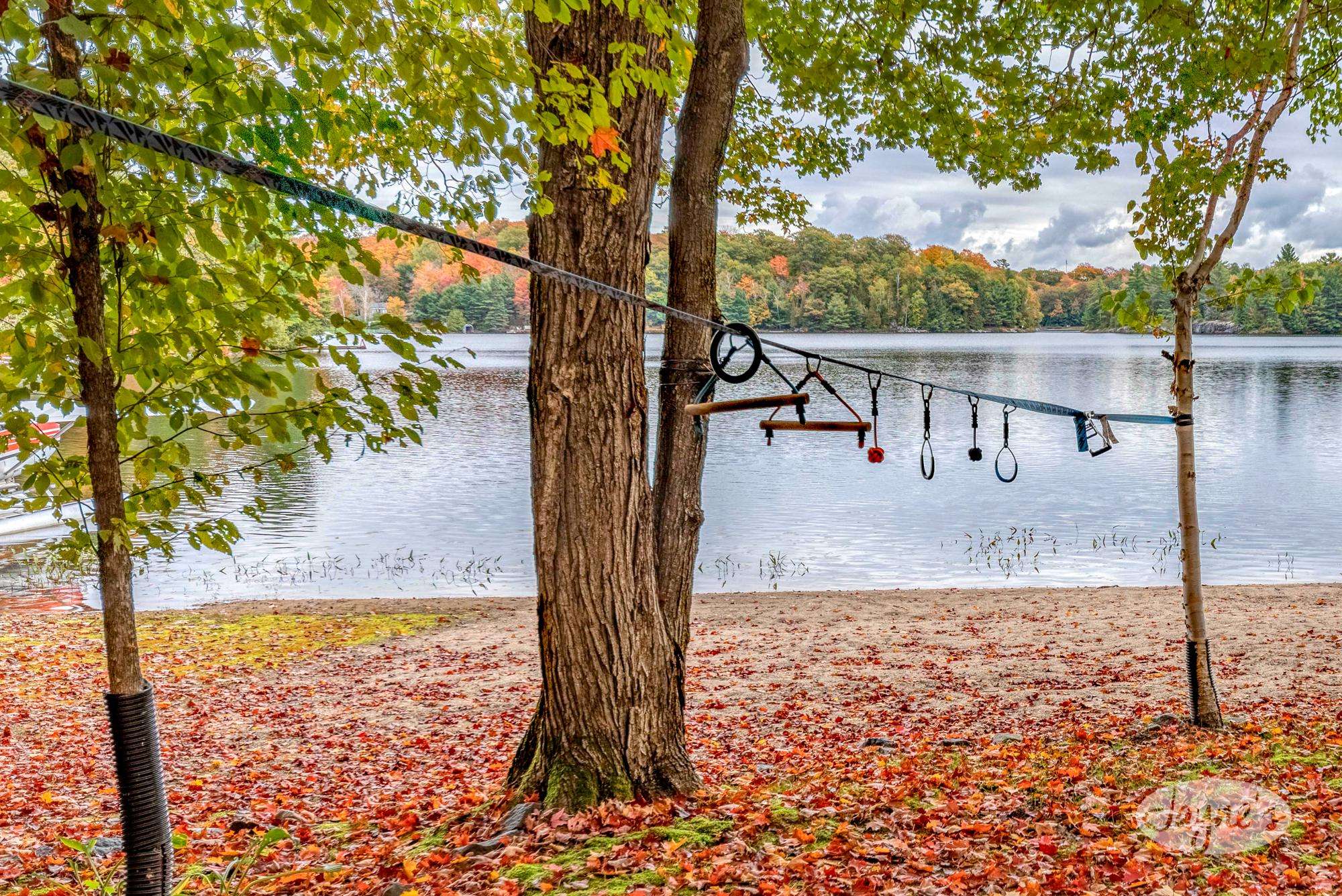 quiet and peaceful lake that guests can fully enjoy all hours of the day. As guests walk towards the dock, they will approach a bench with 2 Muskoka chairs that guests can watch the most spectacular sunrises and its reflection over the lake. Continuing onto the dock and right to the end, guests will find 2 lounger chairs, 6 Muskoka chairs, an umbrella and a fire pit! Walking back and heading up the stairs, the guests will see to their right, there is a bunkie, a hammock and a child size tree house with a spectacular view of the property!