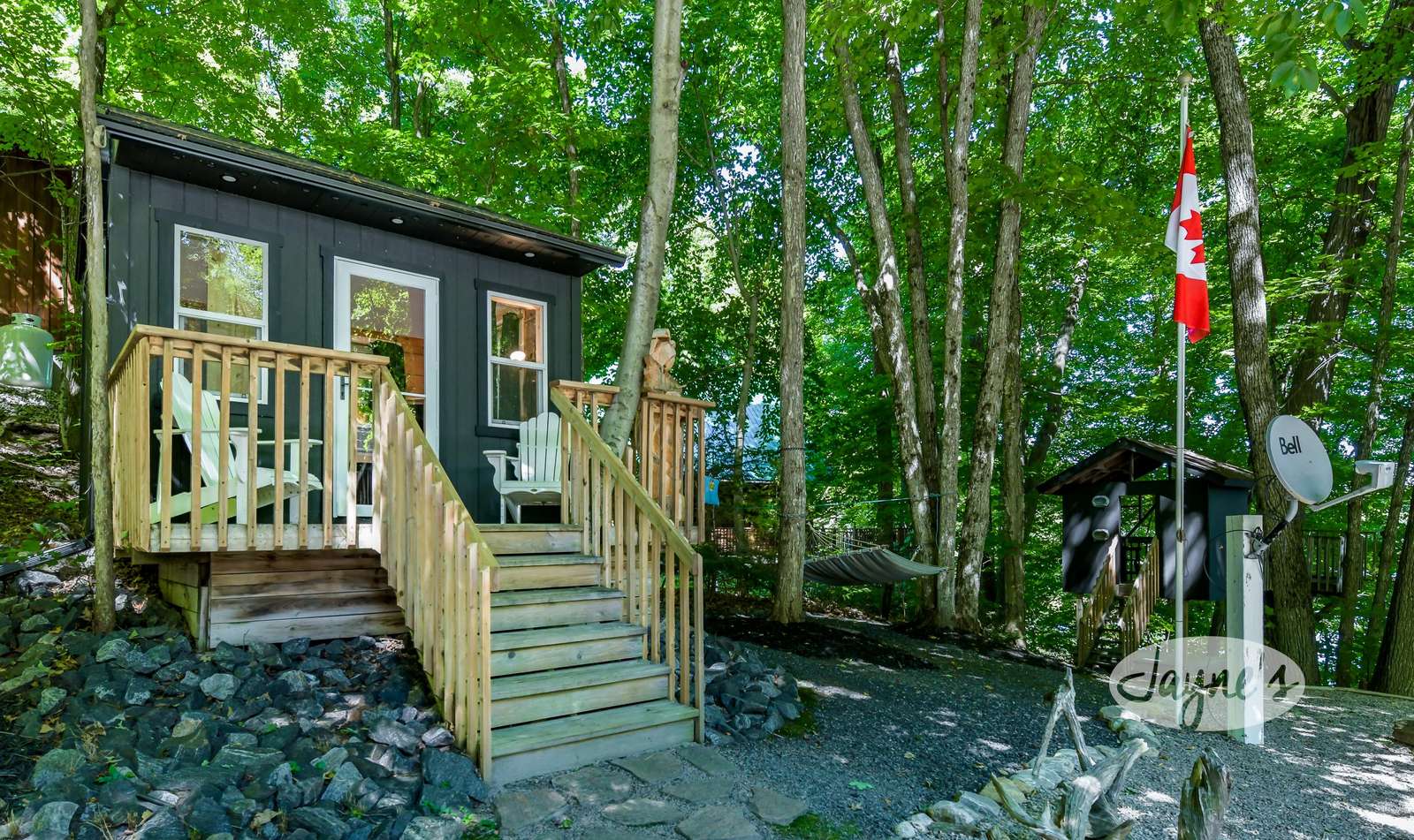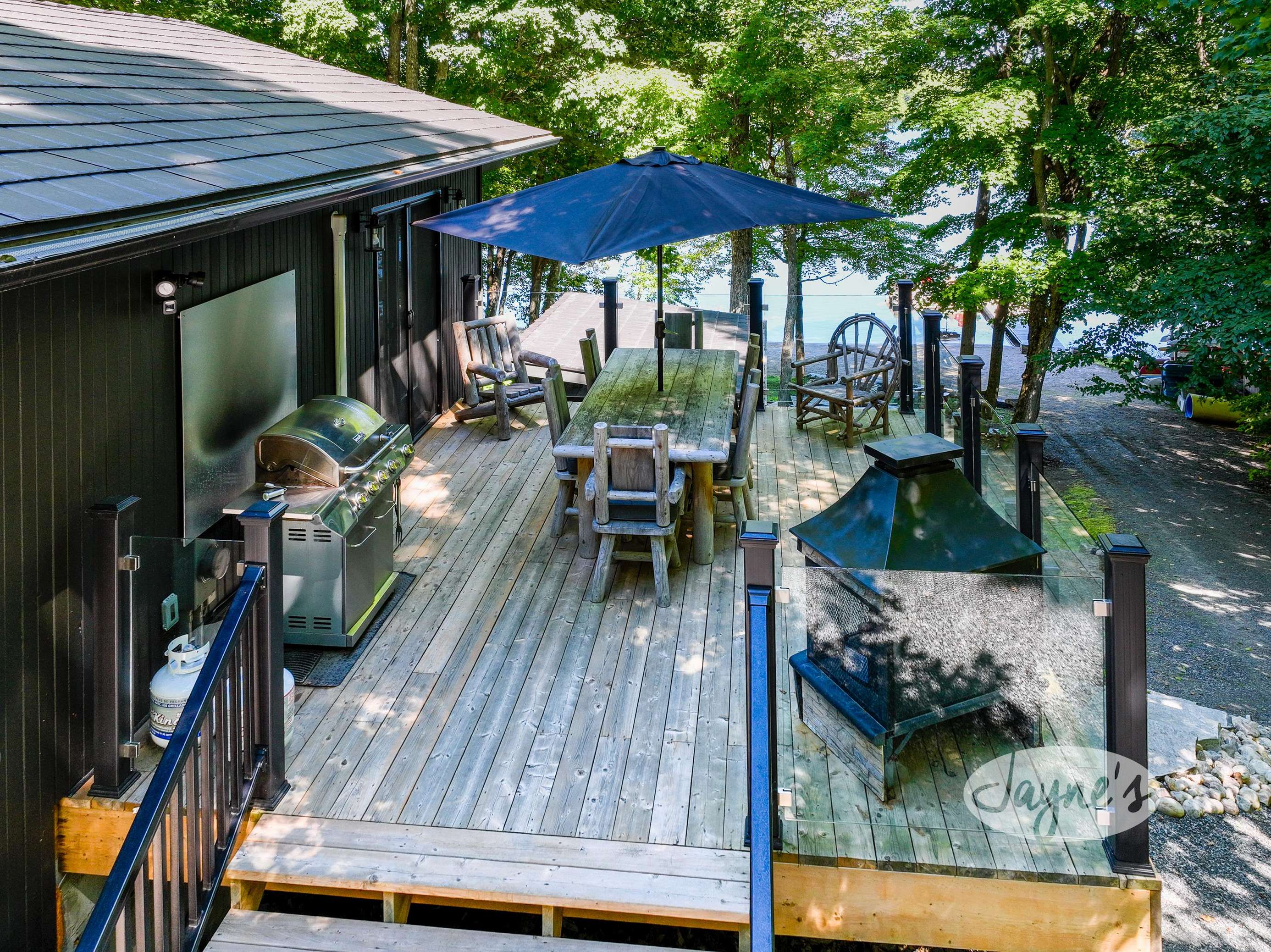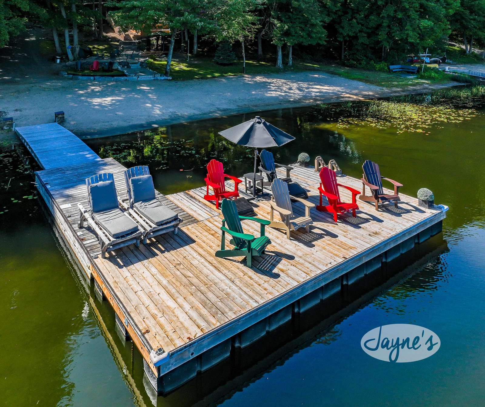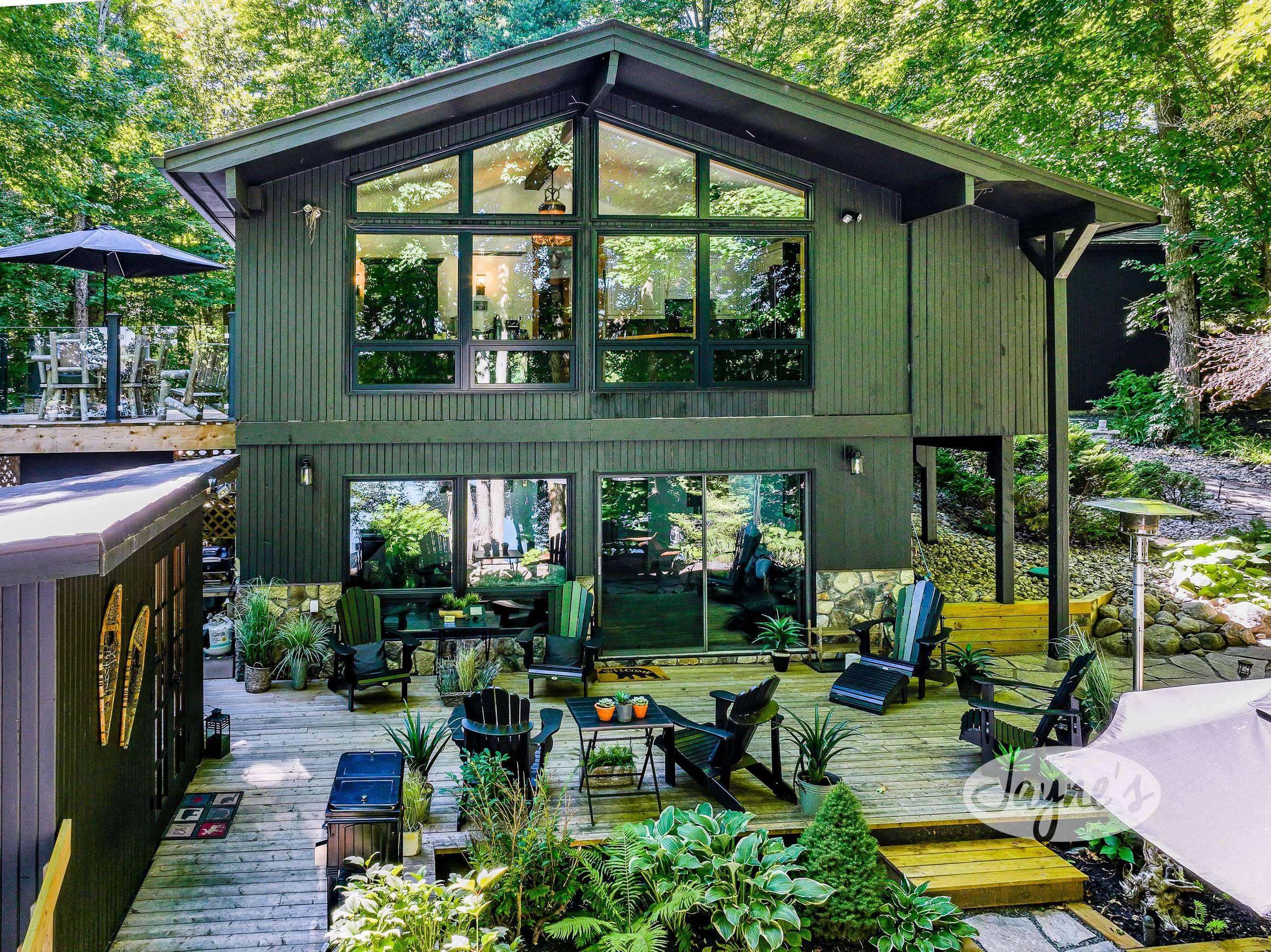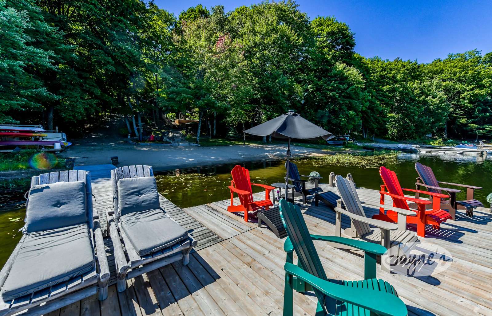 quiet and peaceful lake that guests can fully enjoy all hours of the day. As guests walk towards the dock, they will approach a bench with 2 Muskoka chairs that guests can watch the most spectacular sunrises and its reflection over the lake. Continuing onto the dock and right to the end, guests will find 2 lounger chairs, 6 Muskoka chairs, an umbrella and a fire pit! Walking back and heading up the stairs, the guests will see to their right, there is a bunkie, a hammock and a child size tree house with a spectacular view of the property!