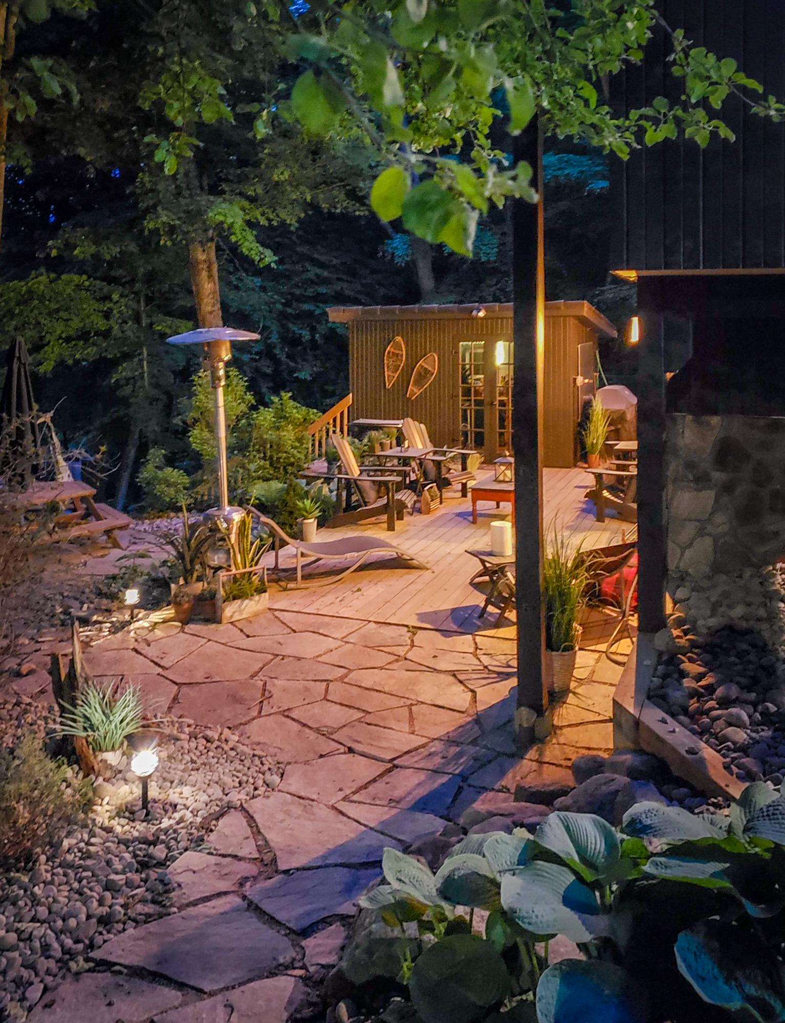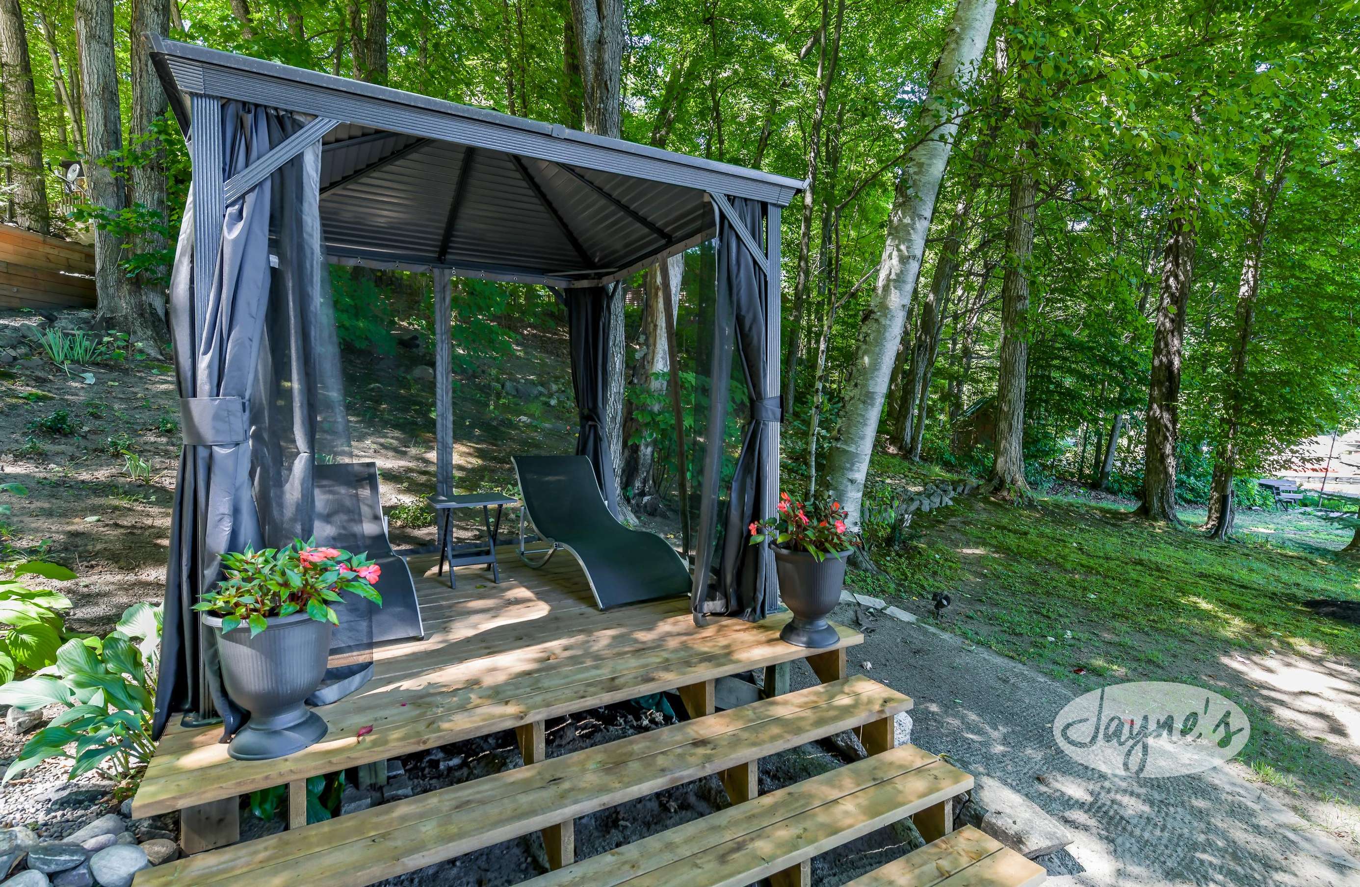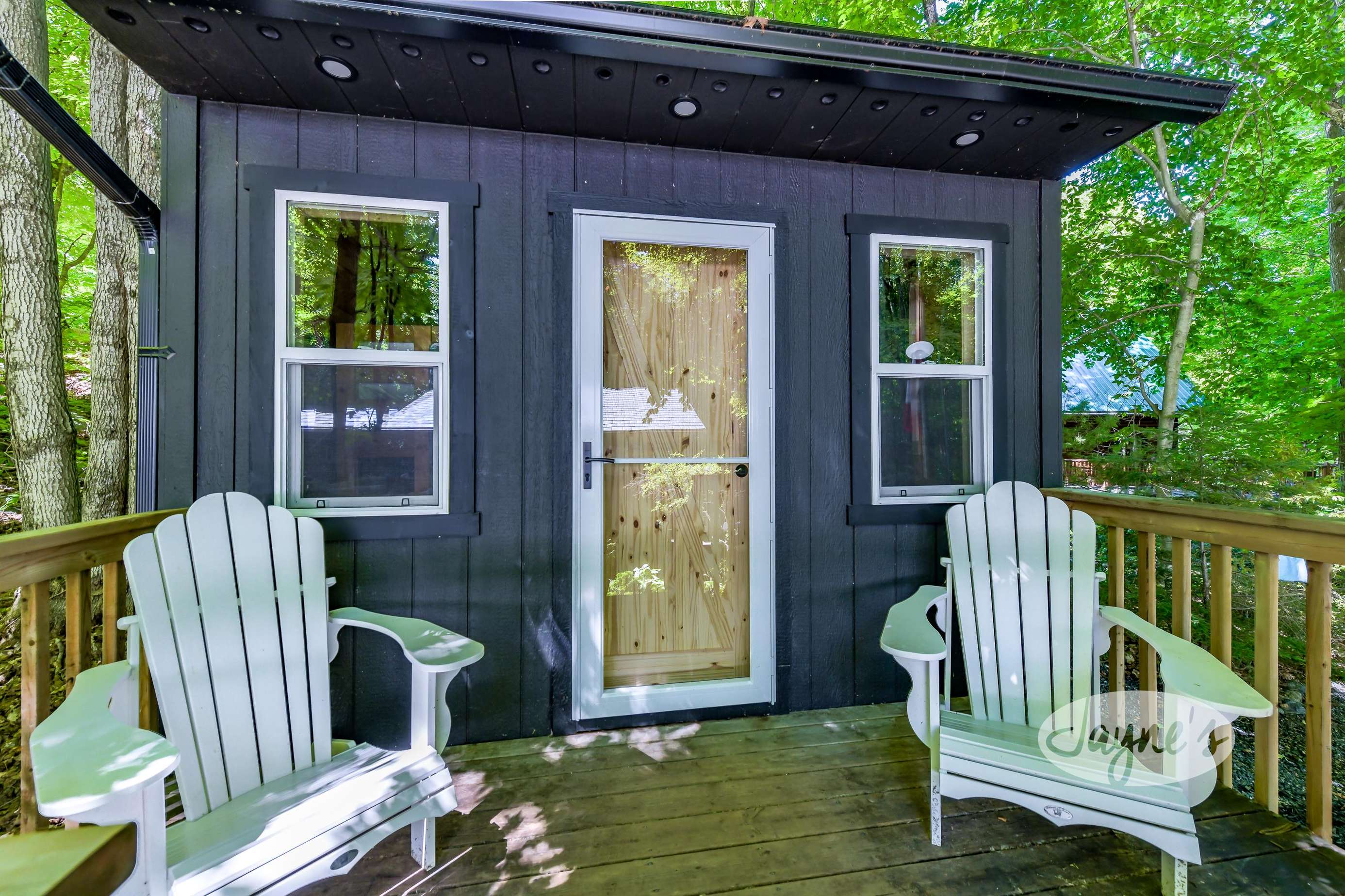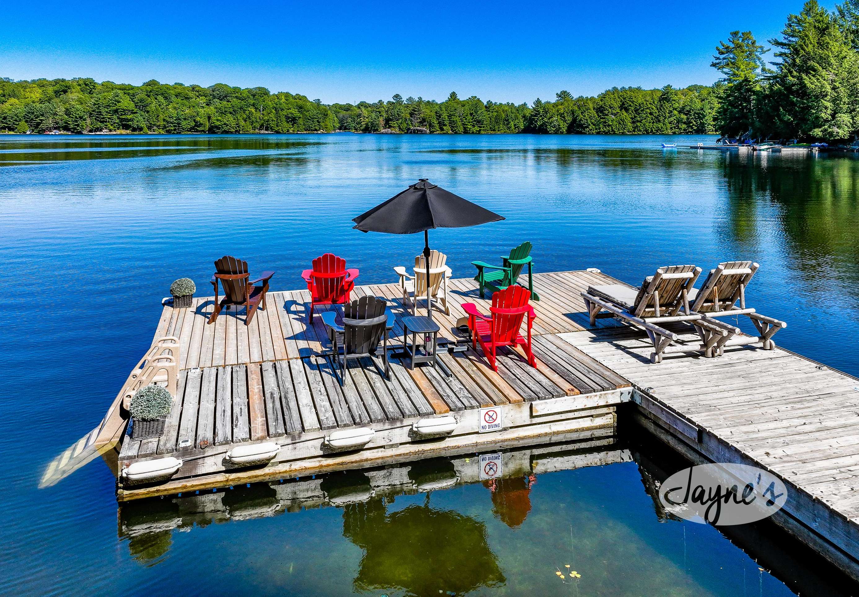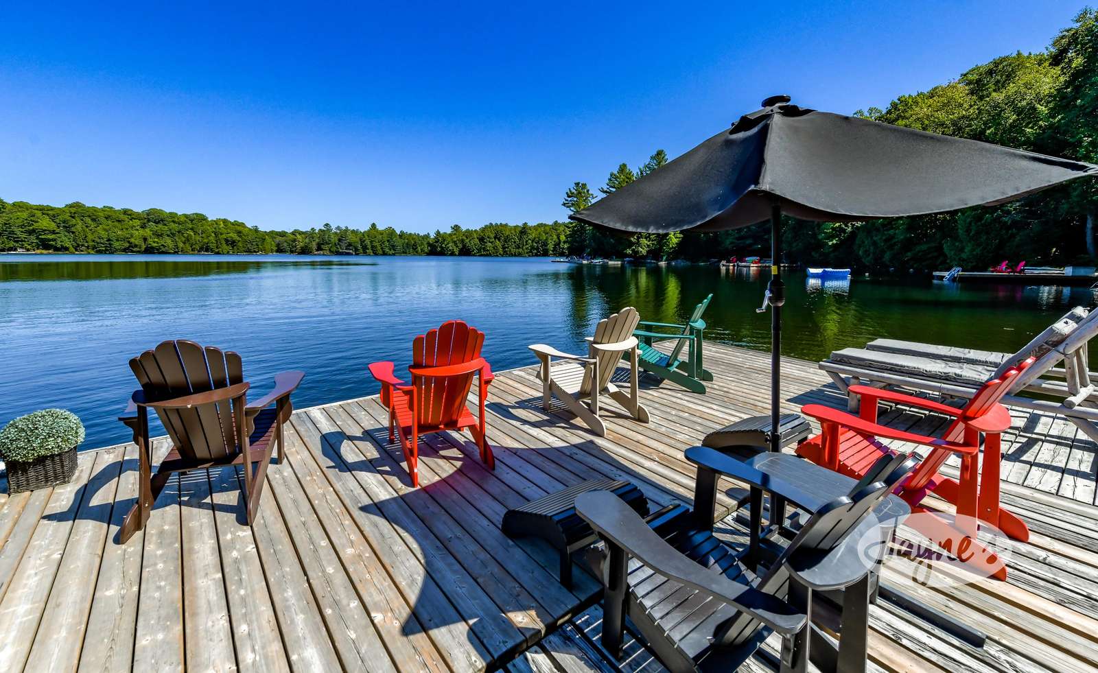 quiet and peaceful lake that guests can fully enjoy all hours of the day. As guests walk towards the dock, they will approach a bench with 2 Muskoka chairs that guests can watch the most spectacular sunrises and its reflection over the lake. Continuing onto the dock and right to the end, guests will find 2 lounger chairs, 6 Muskoka chairs, an umbrella and a fire pit! Walking back and heading up the stairs, the guests will see to their right, there is a bunkie, a hammock and a child size tree house with a spectacular view of the property!