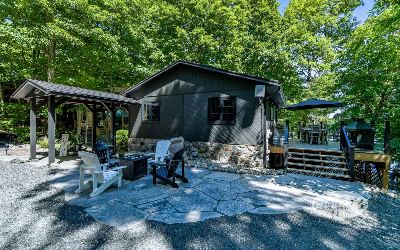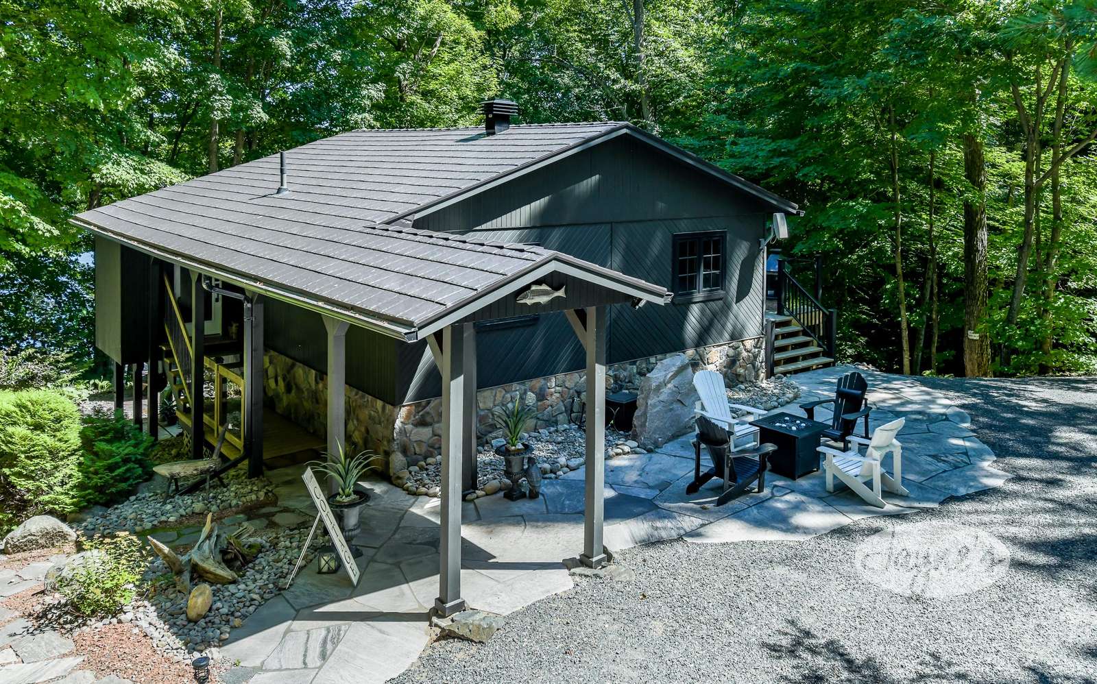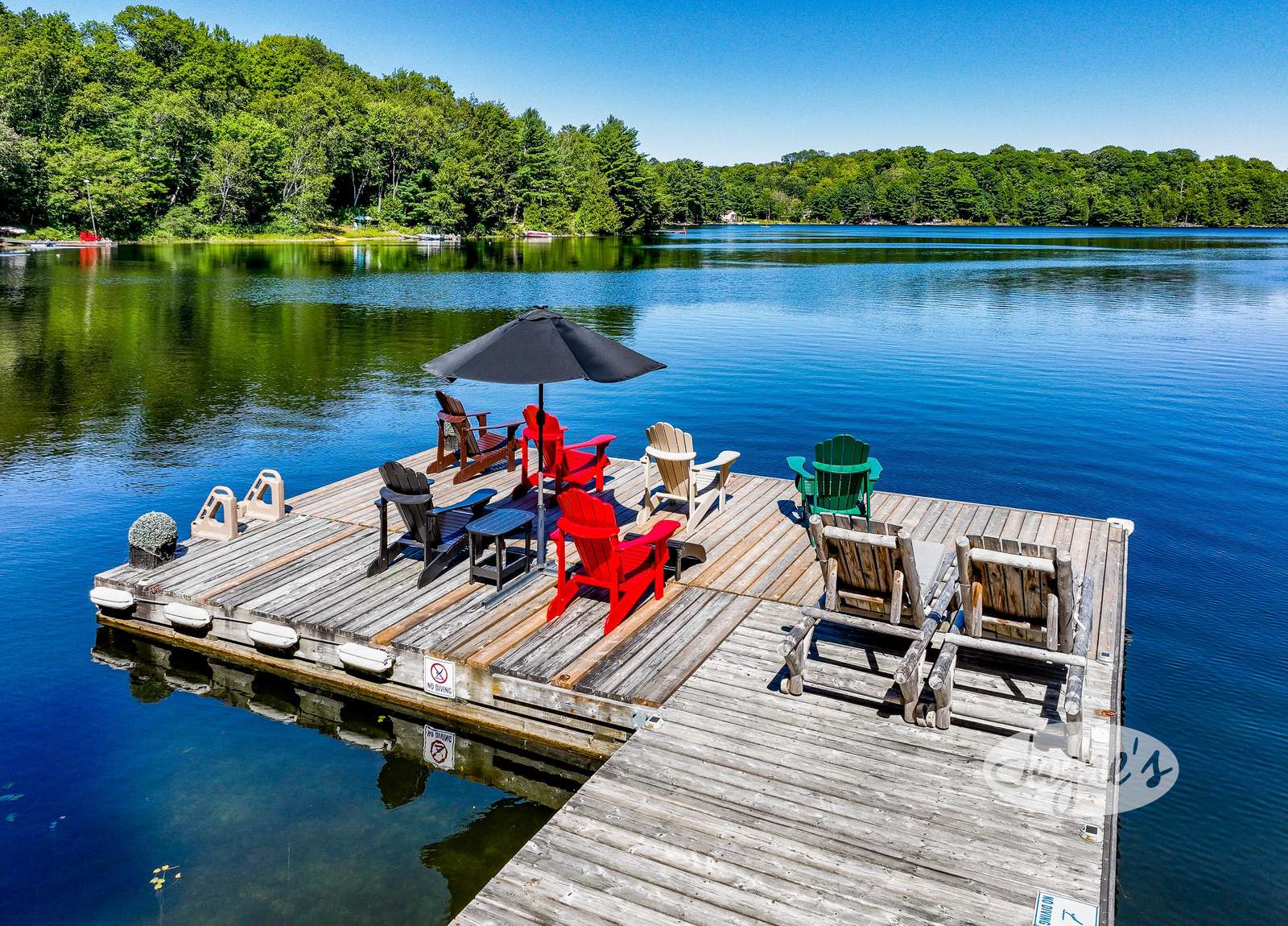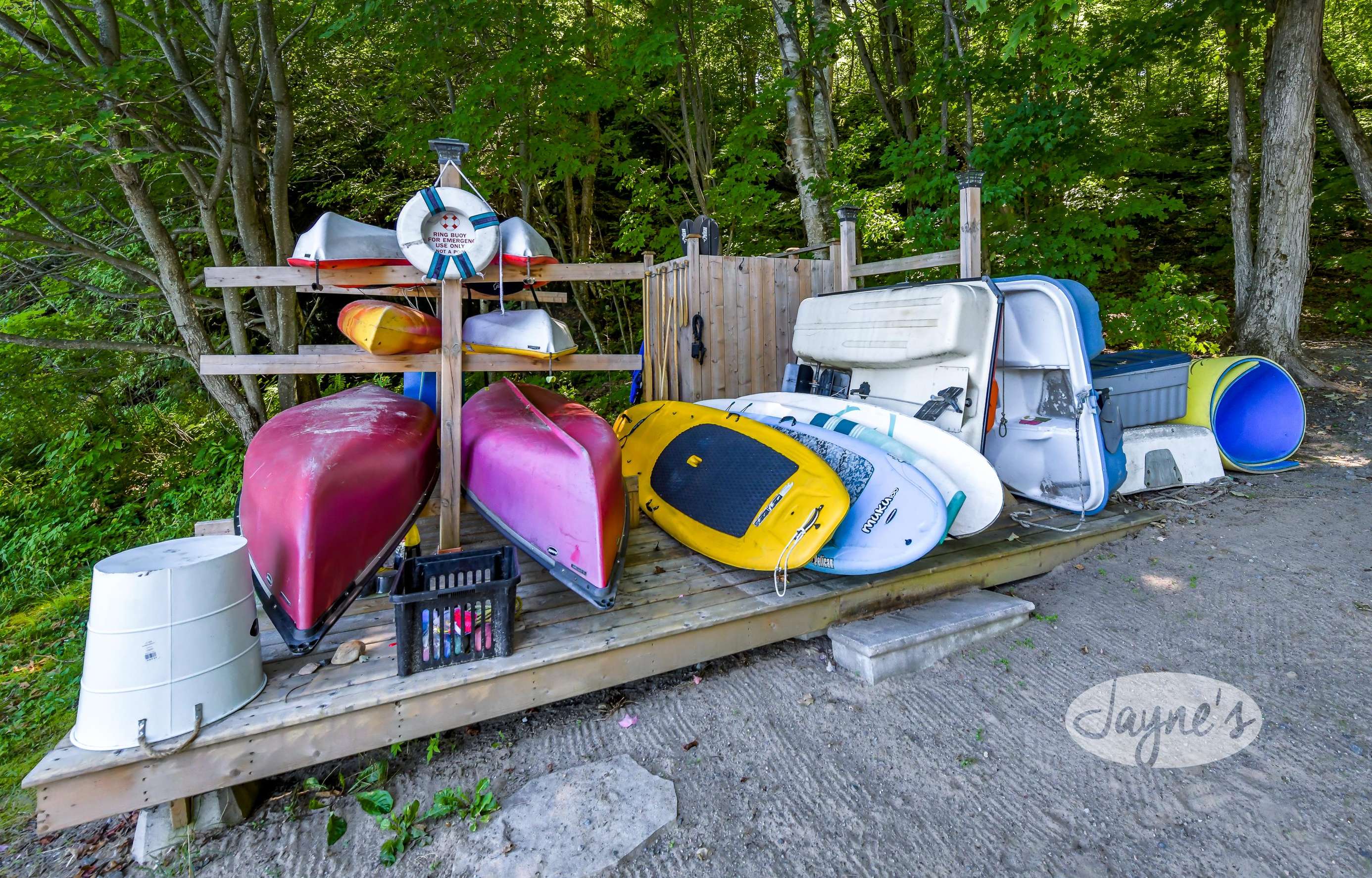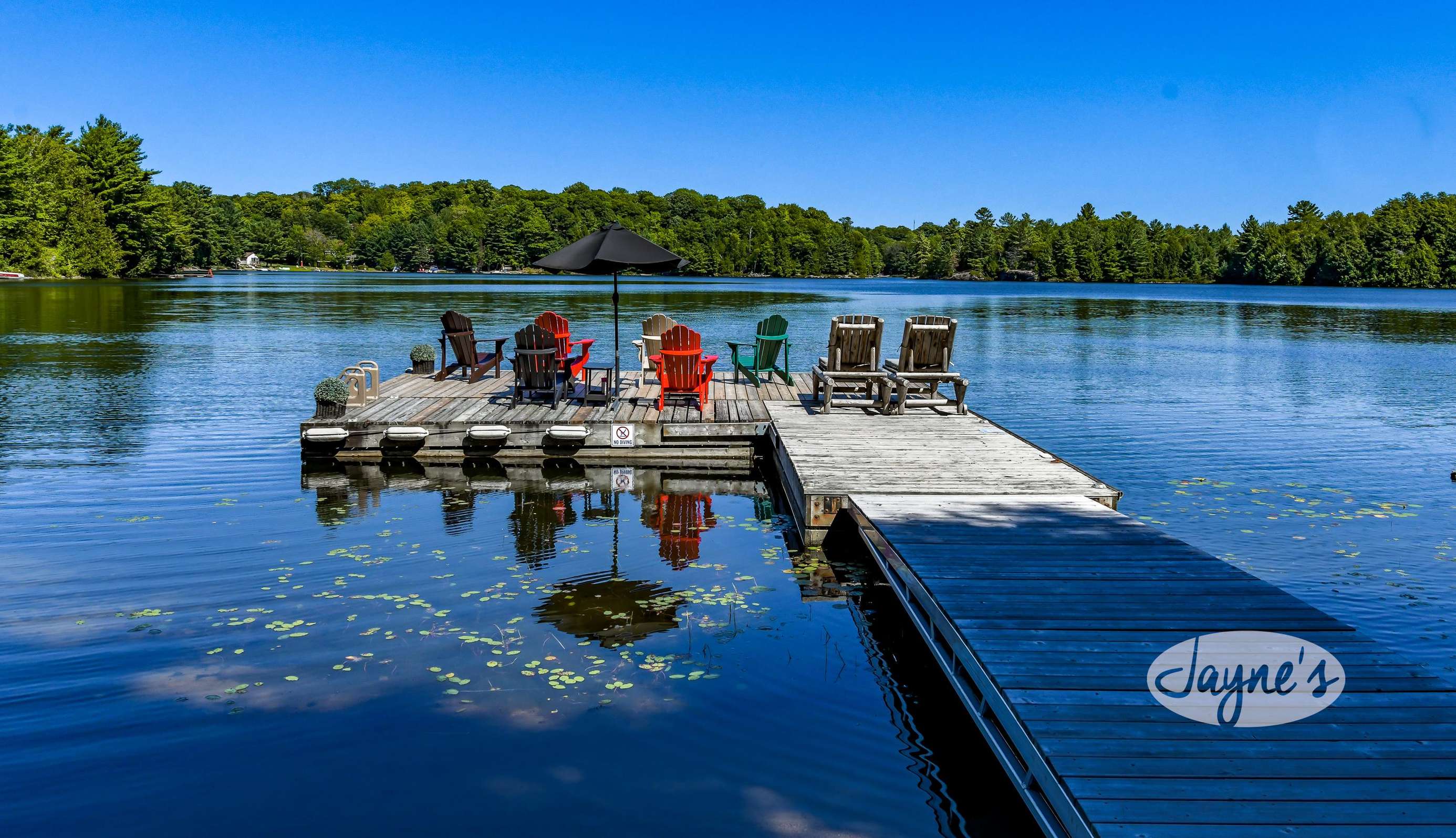 quiet and peaceful lake that guests can fully enjoy all hours of the day. As guests walk towards the dock, they will approach a bench with 2 Muskoka chairs that guests can watch the most spectacular sunrises and its reflection over the lake. Continuing onto the dock and right to the end, guests will find 2 lounger chairs, 6 Muskoka chairs, an umbrella and a fire pit! Walking back and heading up the stairs, the guests will see to their right, there is a bunkie, a hammock and a child size tree house with a spectacular view of the property!
