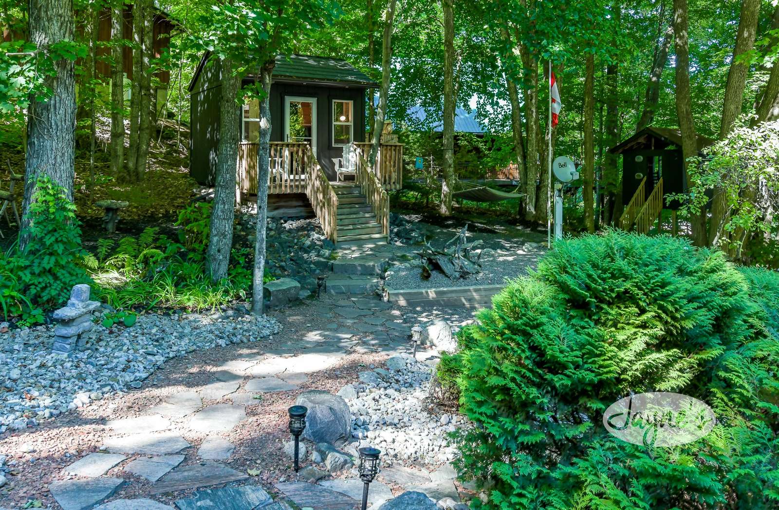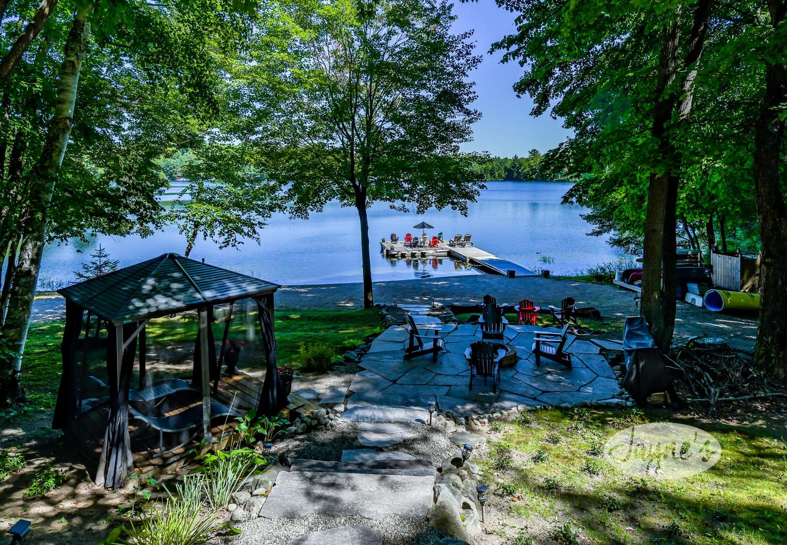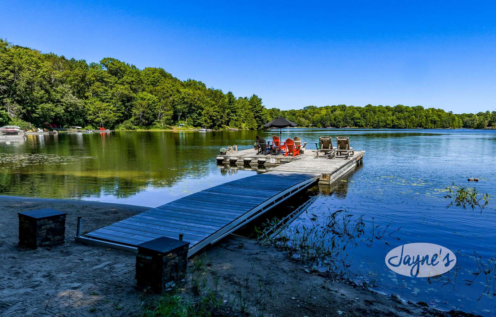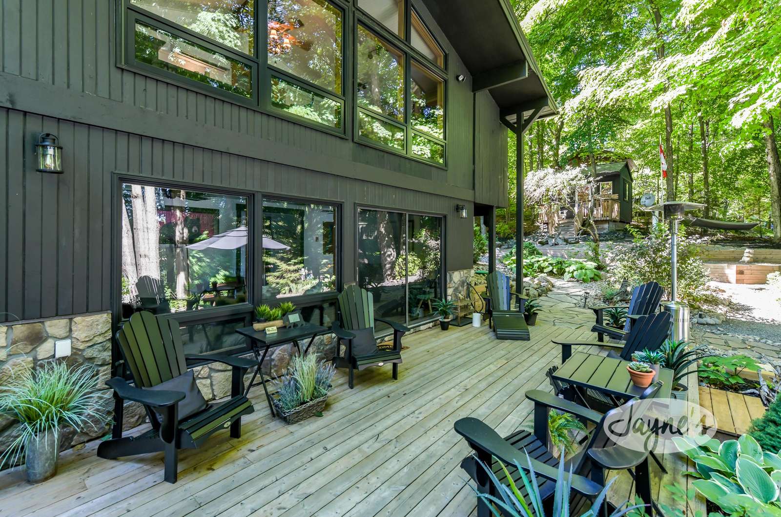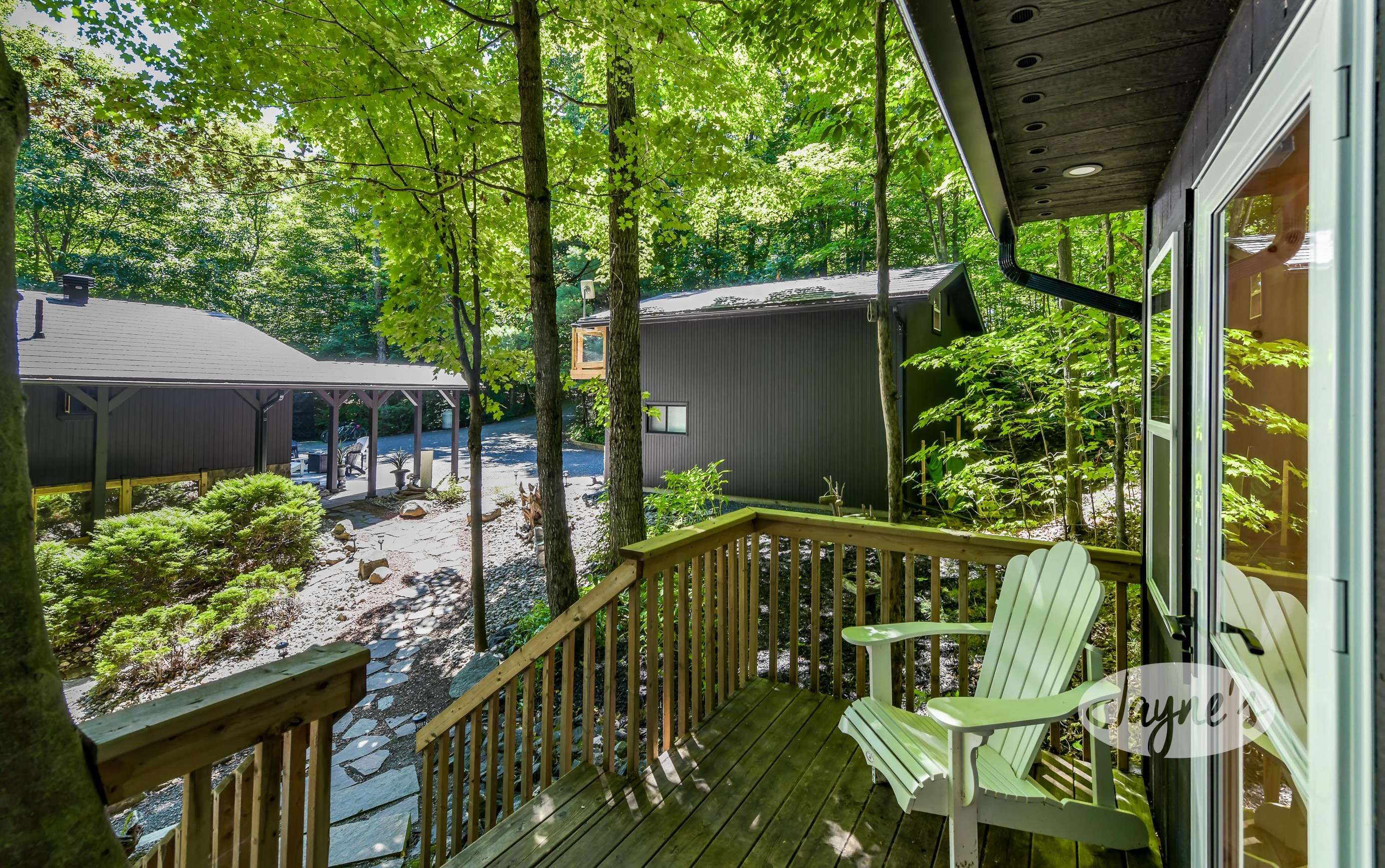 quiet and peaceful lake that guests can fully enjoy all hours of the day. As guests walk towards the dock, they will approach a bench with 2 Muskoka chairs that guests can watch the most spectacular sunrises and its reflection over the lake. Continuing onto the dock and right to the end, guests will find 2 lounger chairs, 6 Muskoka chairs, an umbrella and a fire pit! Walking back and heading up the stairs, the guests will see to their right, there is a bunkie, a hammock and a child size tree house with a spectacular view of the property!