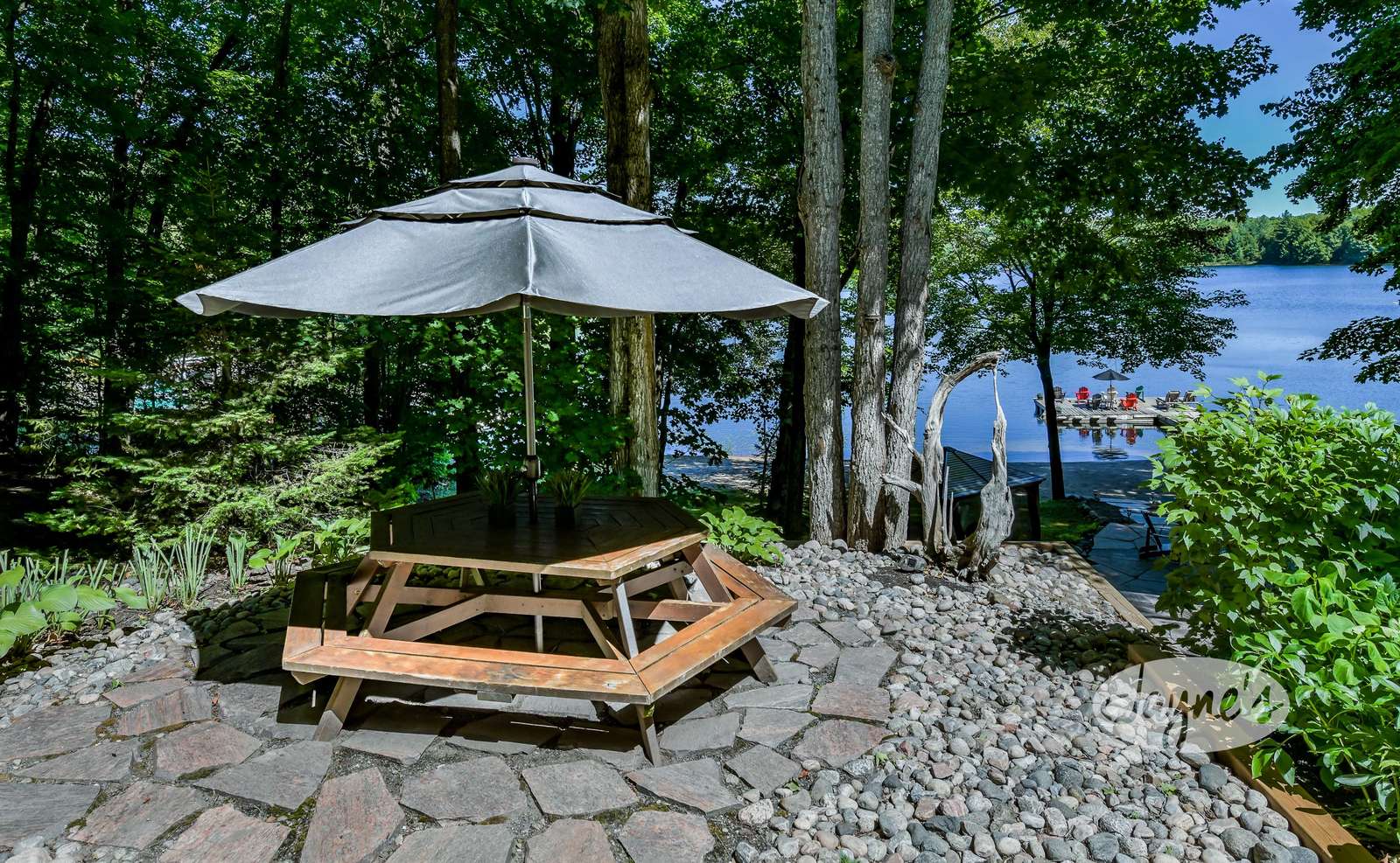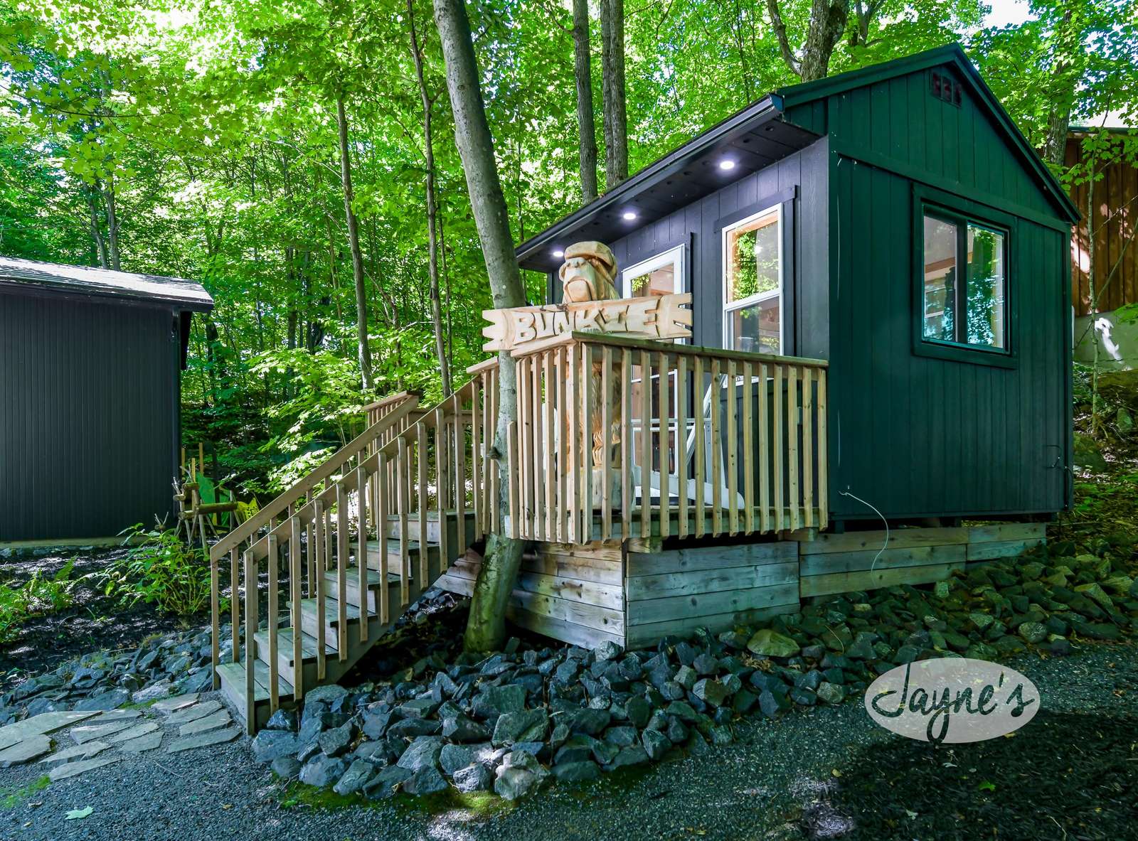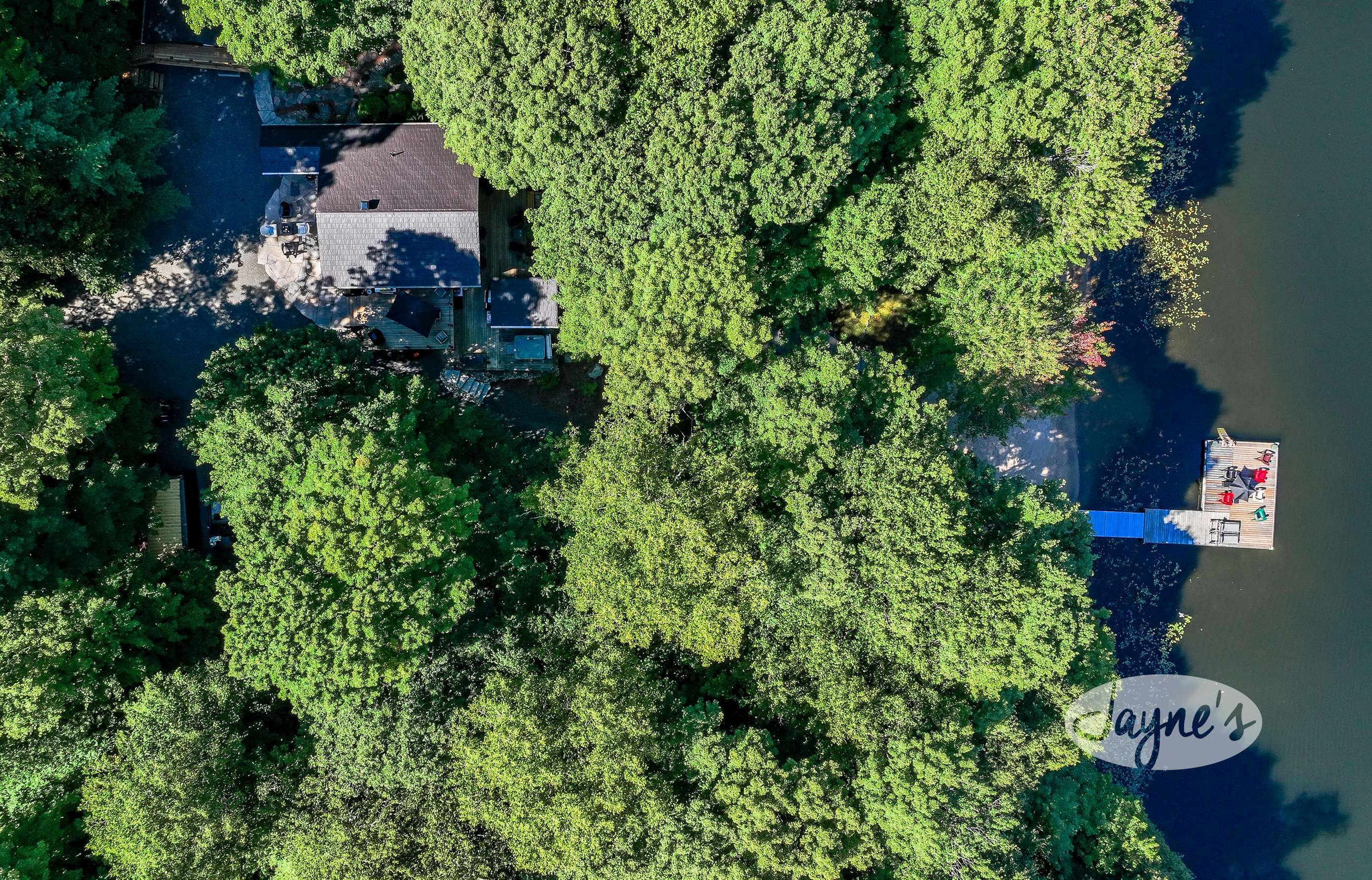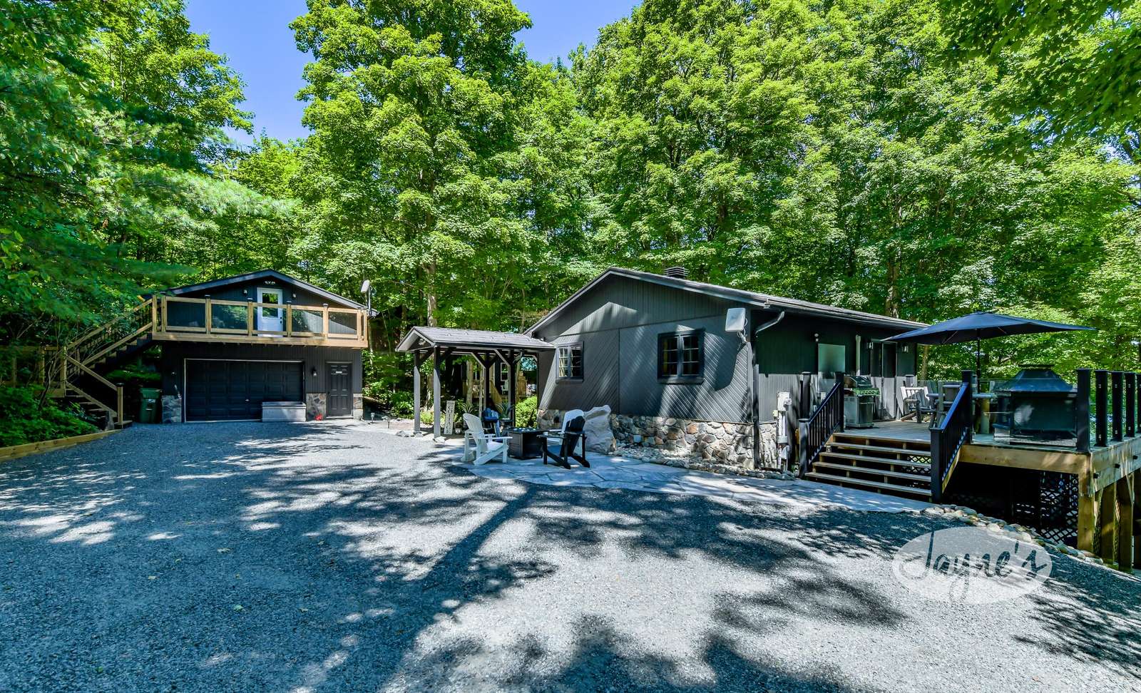 quiet and peaceful lake that guests can fully enjoy all hours of the day. As guests walk towards the dock, they will approach a bench with 2 Muskoka chairs that guests can watch the most spectacular sunrises and its reflection over the lake. Continuing onto the dock and right to the end, guests will find 2 lounger chairs, 6 Muskoka chairs, an umbrella and a fire pit! Walking back and heading up the stairs, the guests will see to their right, there is a bunkie, a hammock and a child size tree house with a spectacular view of the property!