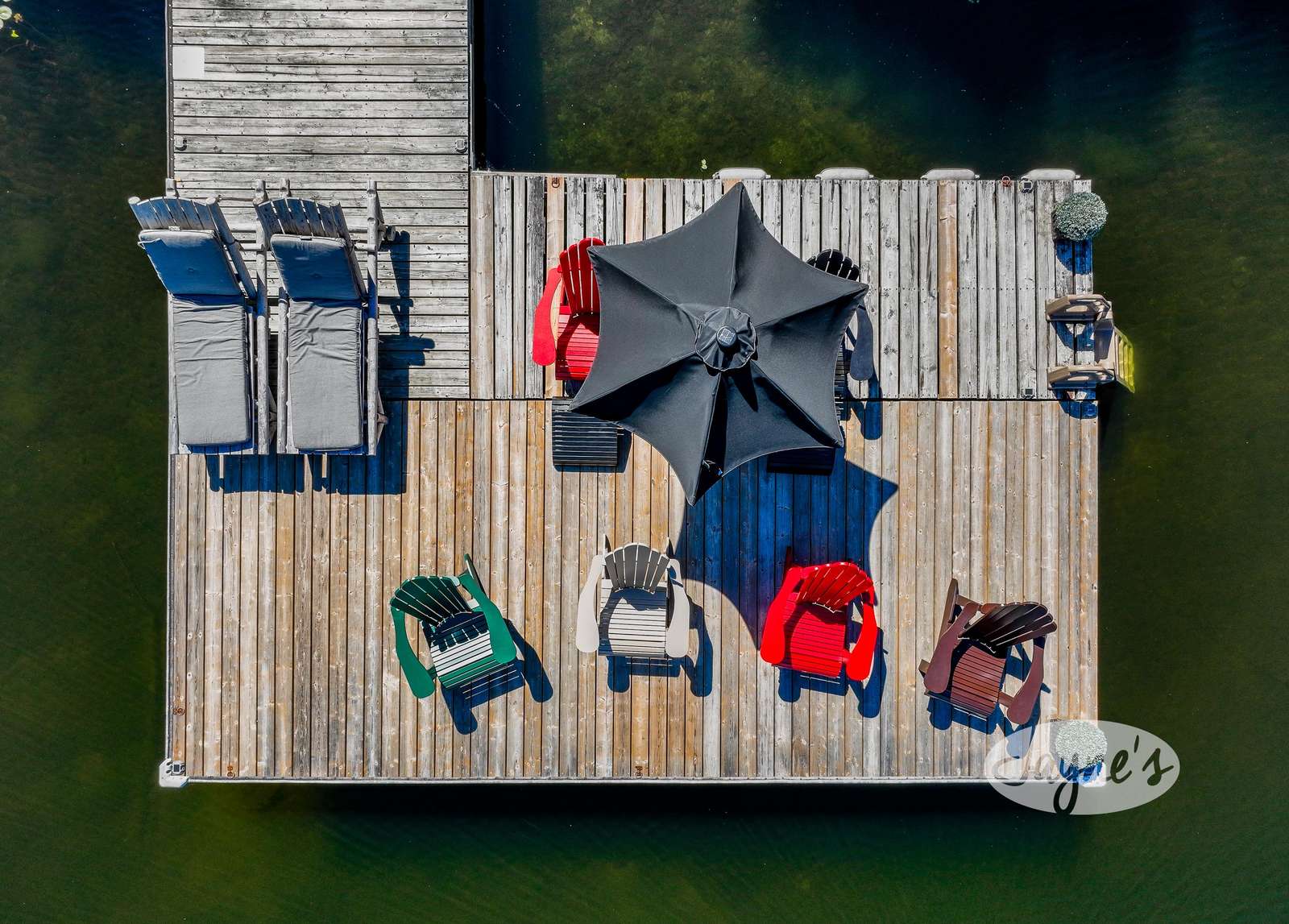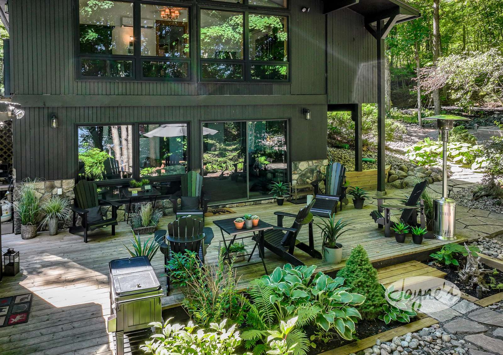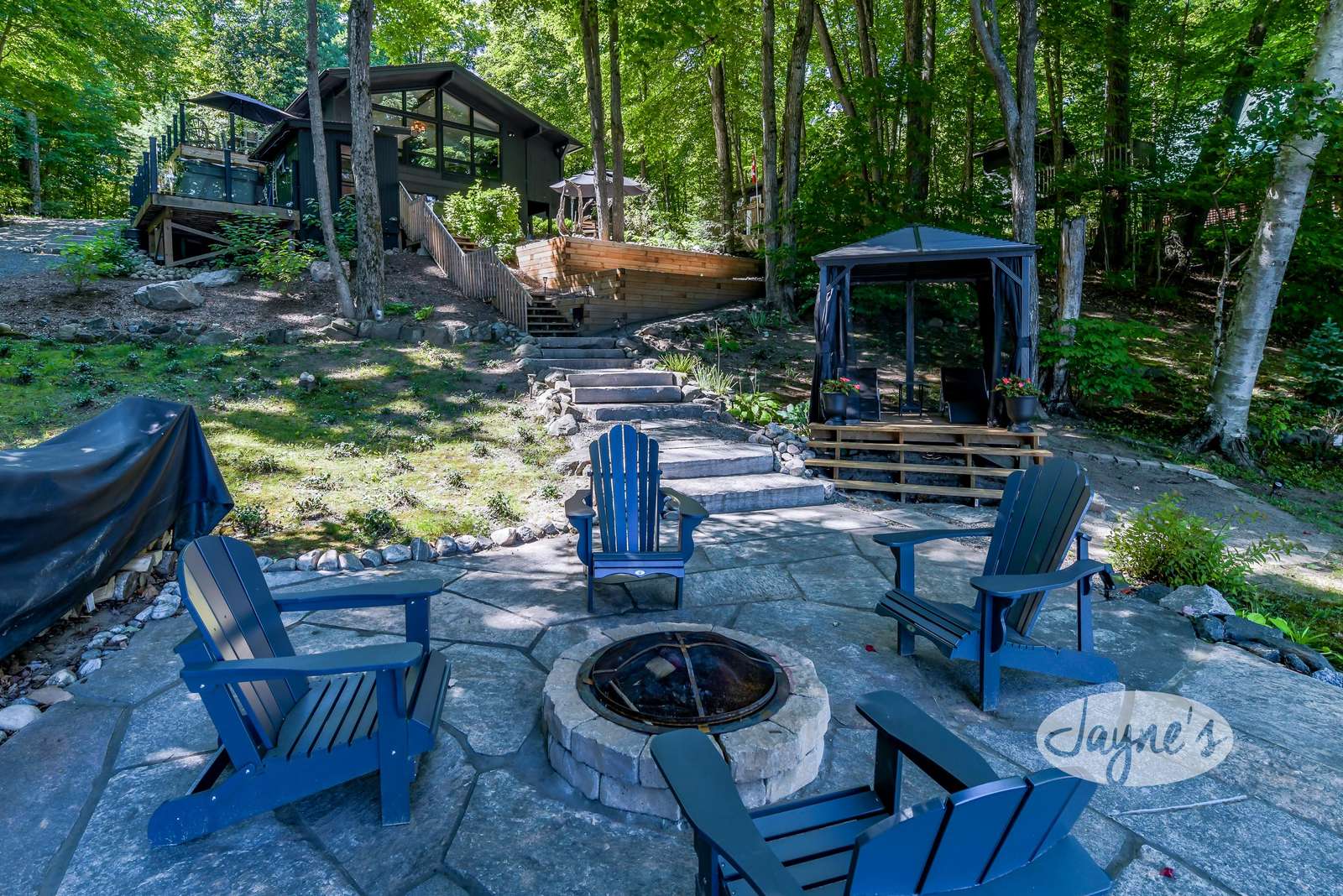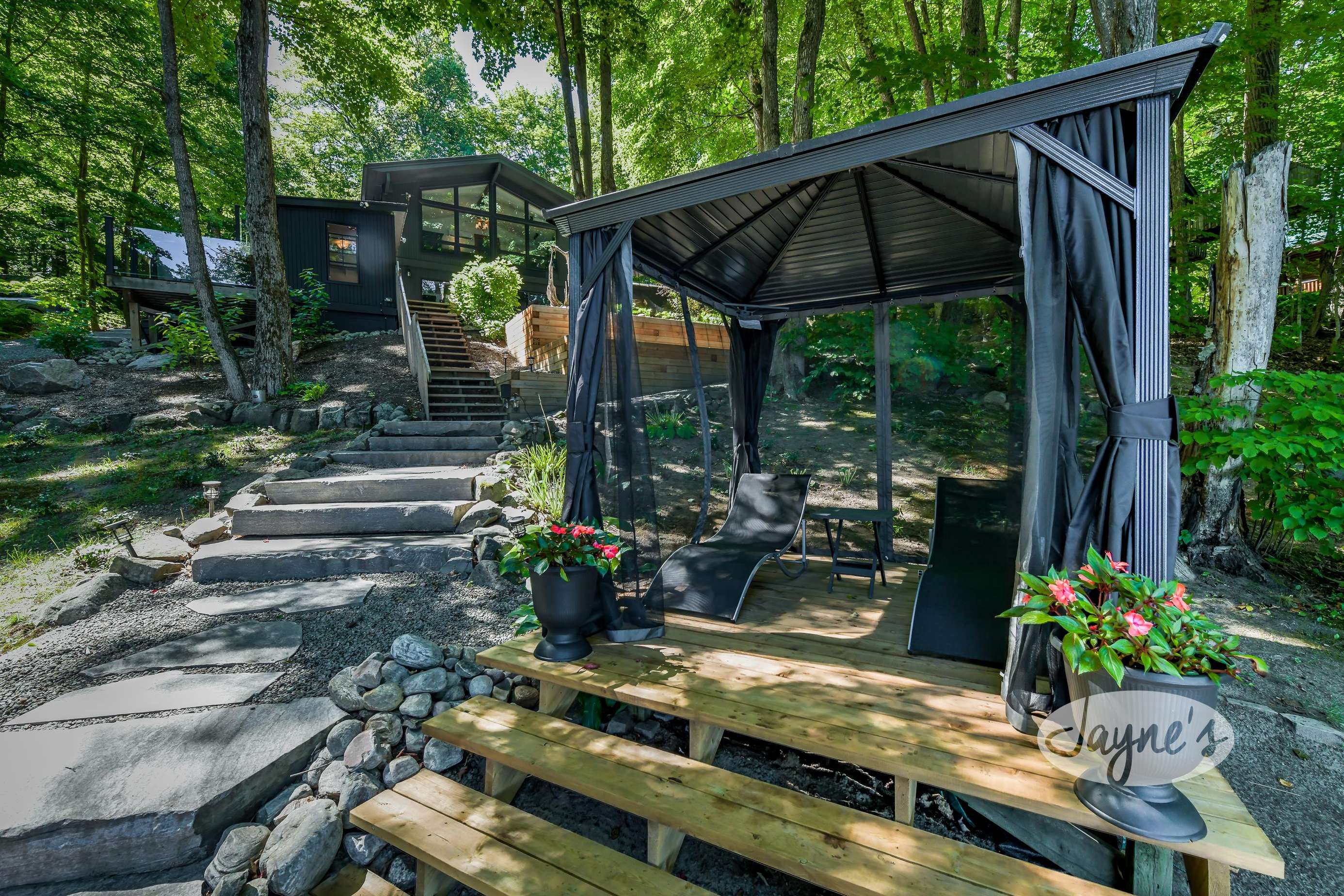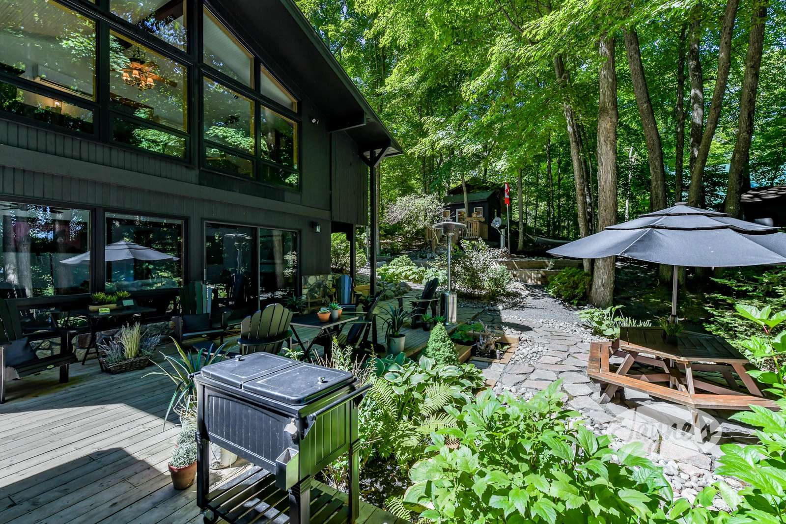 quiet and peaceful lake that guests can fully enjoy all hours of the day. As guests walk towards the dock, they will approach a bench with 2 Muskoka chairs that guests can watch the most spectacular sunrises and its reflection over the lake. Continuing onto the dock and right to the end, guests will find 2 lounger chairs, 6 Muskoka chairs, an umbrella and a fire pit! Walking back and heading up the stairs, the guests will see to their right, there is a bunkie, a hammock and a child size tree house with a spectacular view of the property!