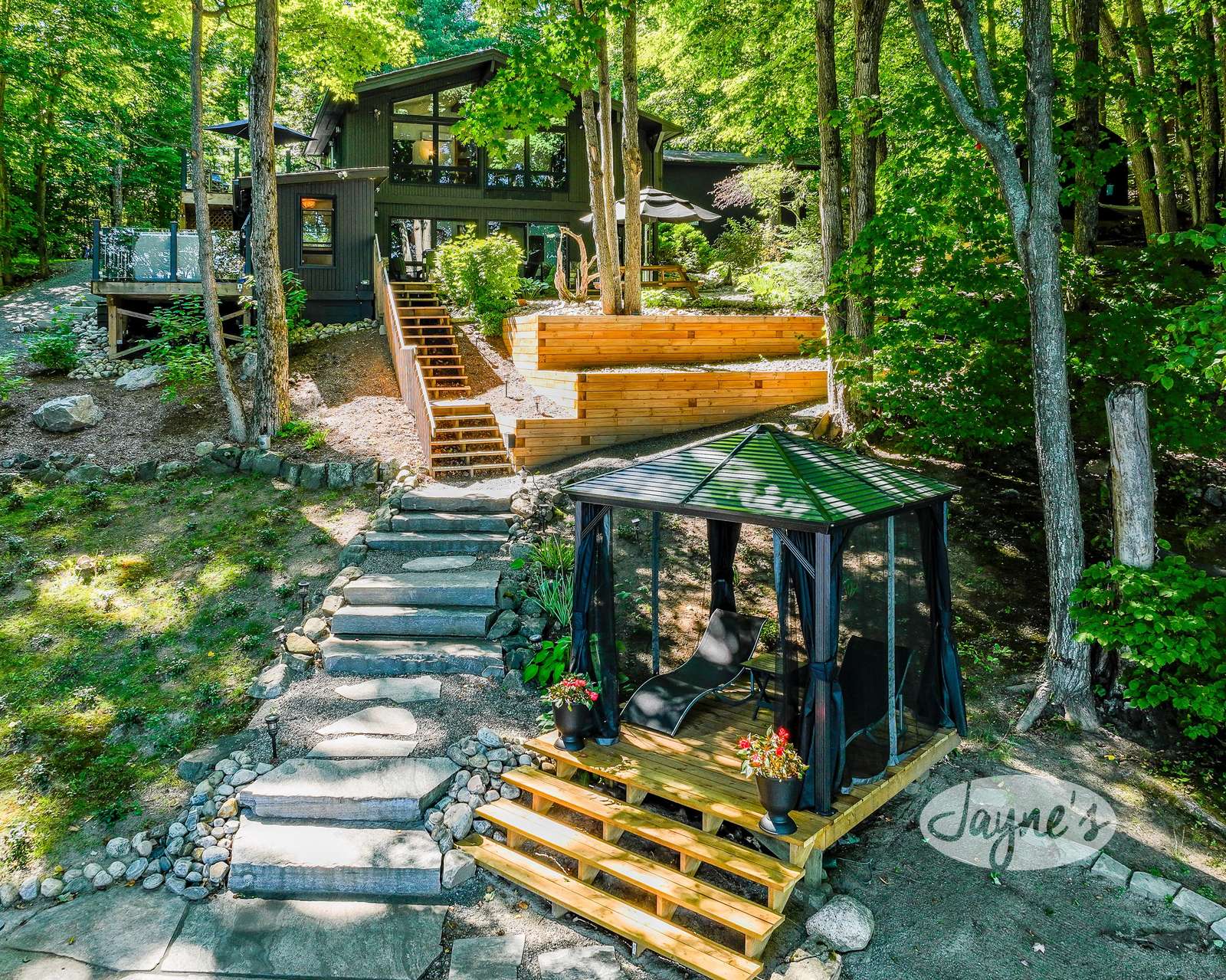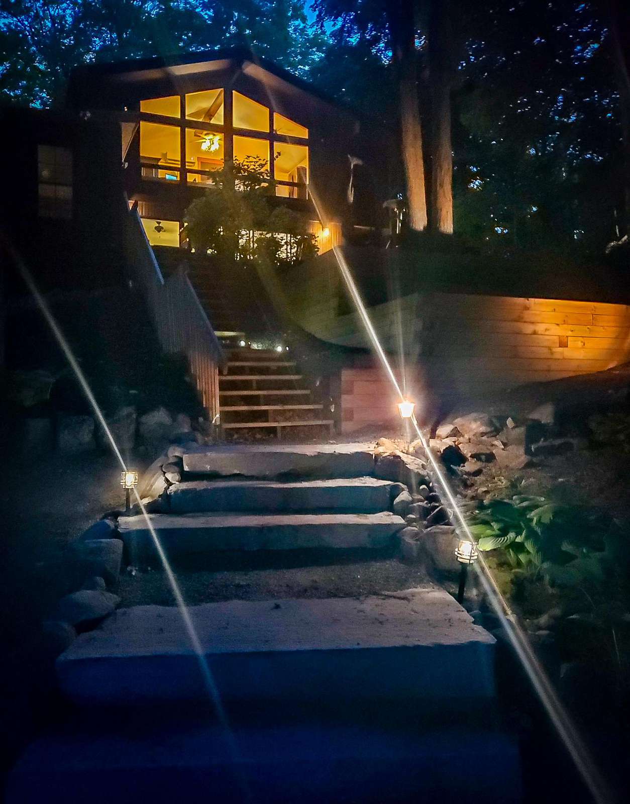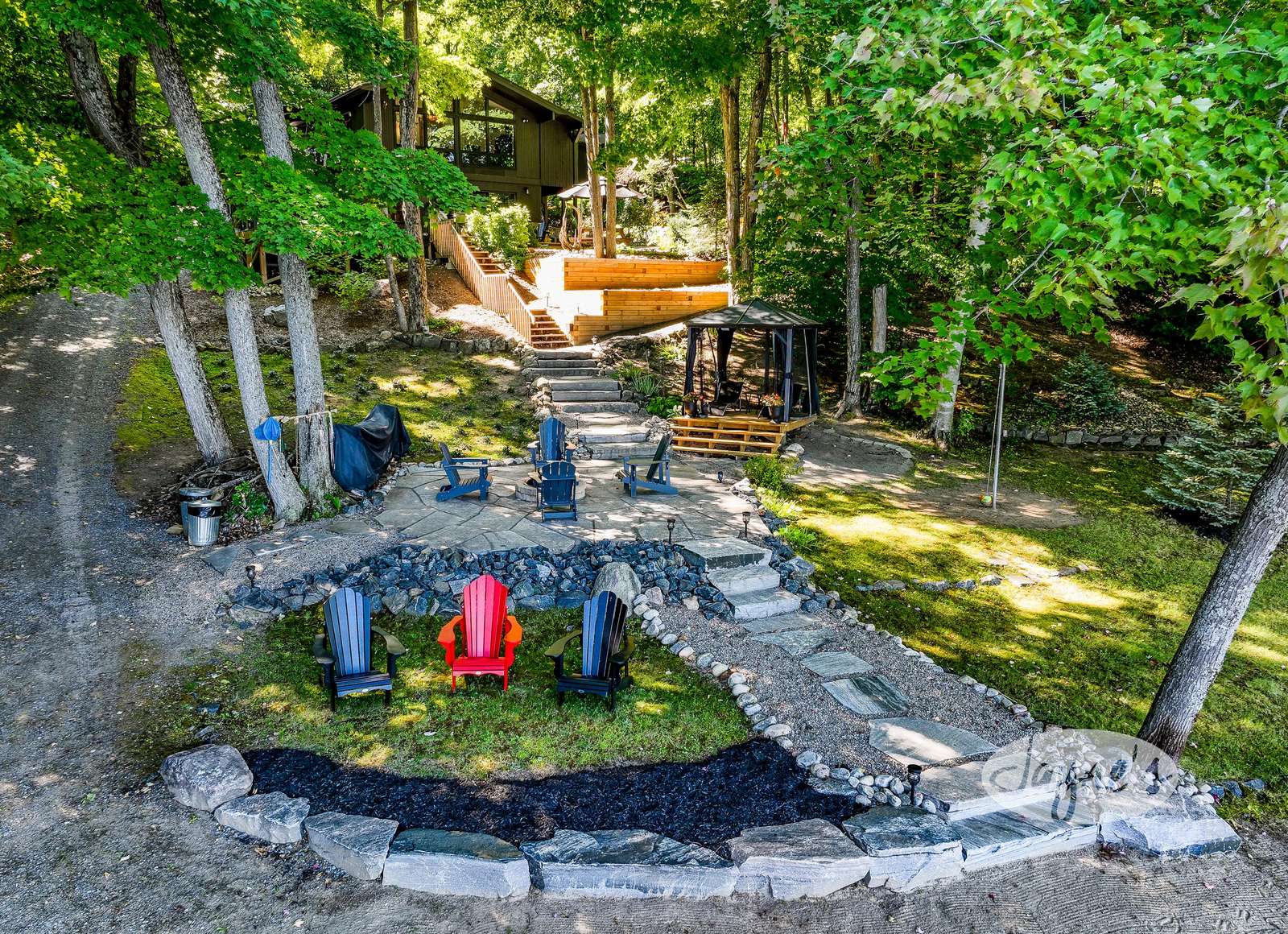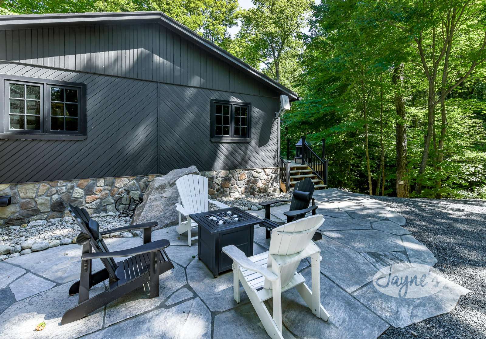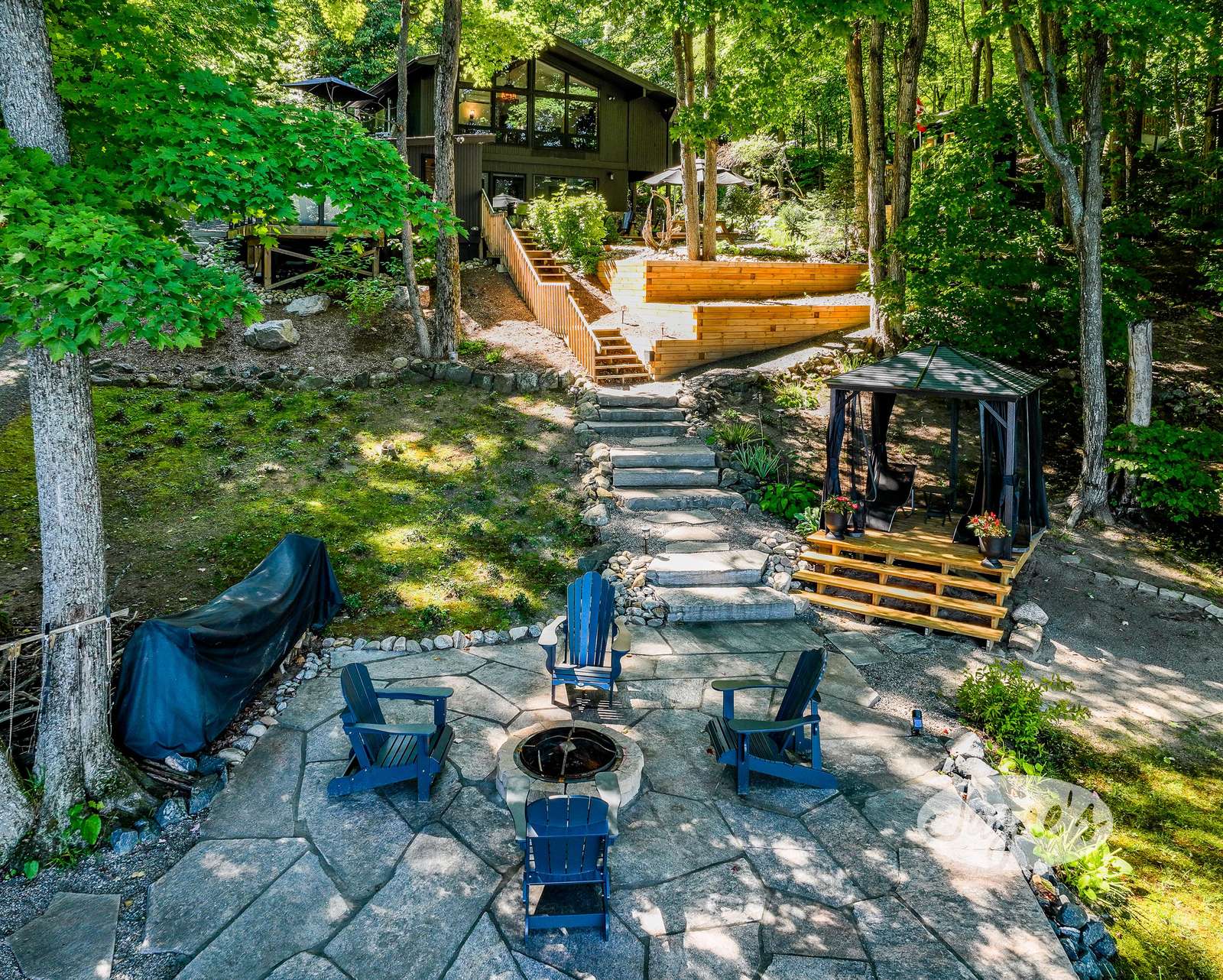 quiet and peaceful lake that guests can fully enjoy all hours of the day. As guests walk towards the dock, they will approach a bench with 2 Muskoka chairs that guests can watch the most spectacular sunrises and its reflection over the lake. Continuing onto the dock and right to the end, guests will find 2 lounger chairs, 6 Muskoka chairs, an umbrella and a fire pit! Walking back and heading up the stairs, the guests will see to their right, there is a bunkie, a hammock and a child size tree house with a spectacular view of the property!