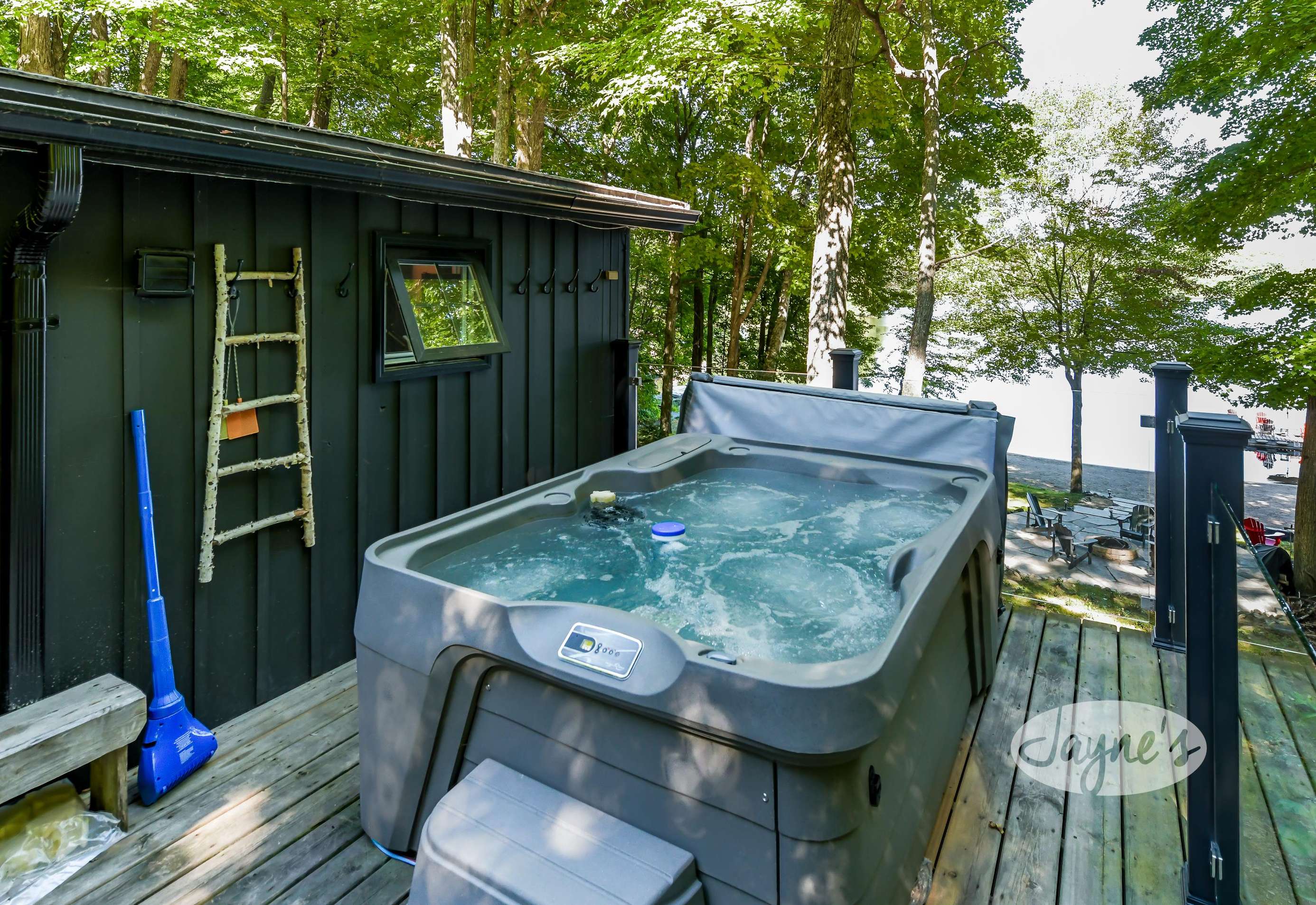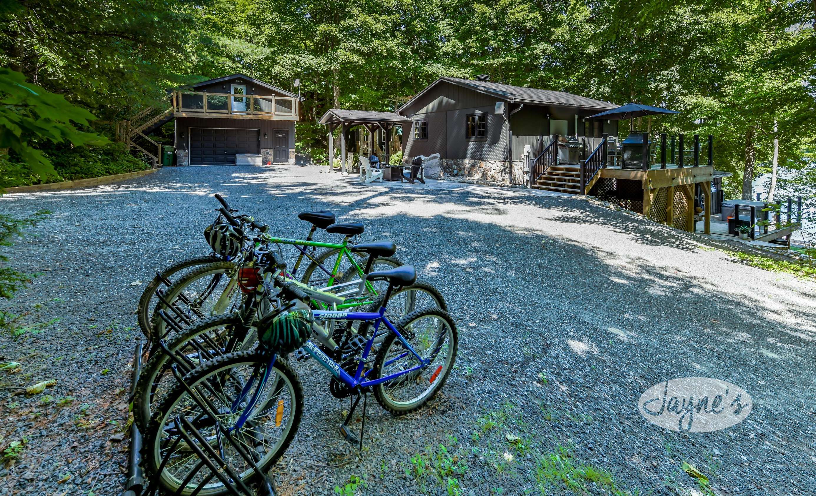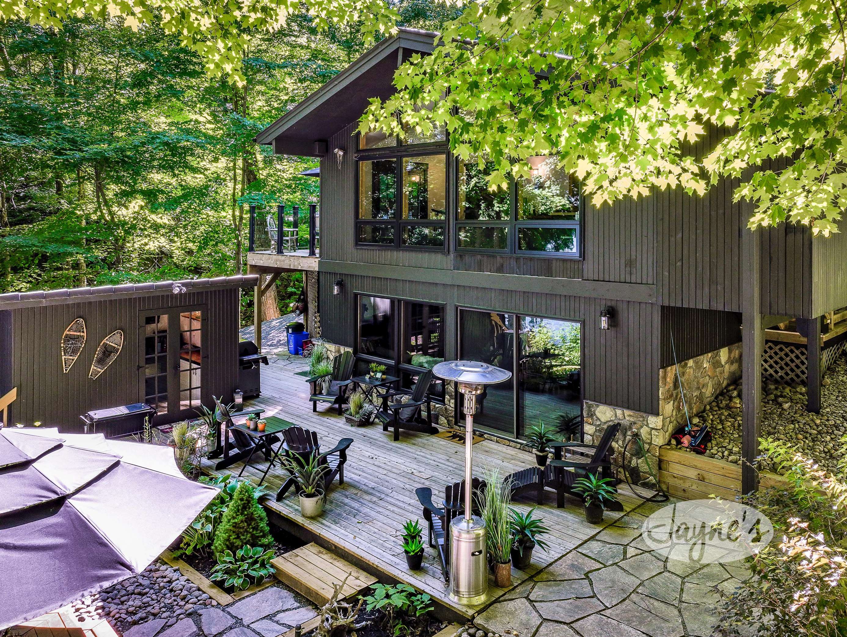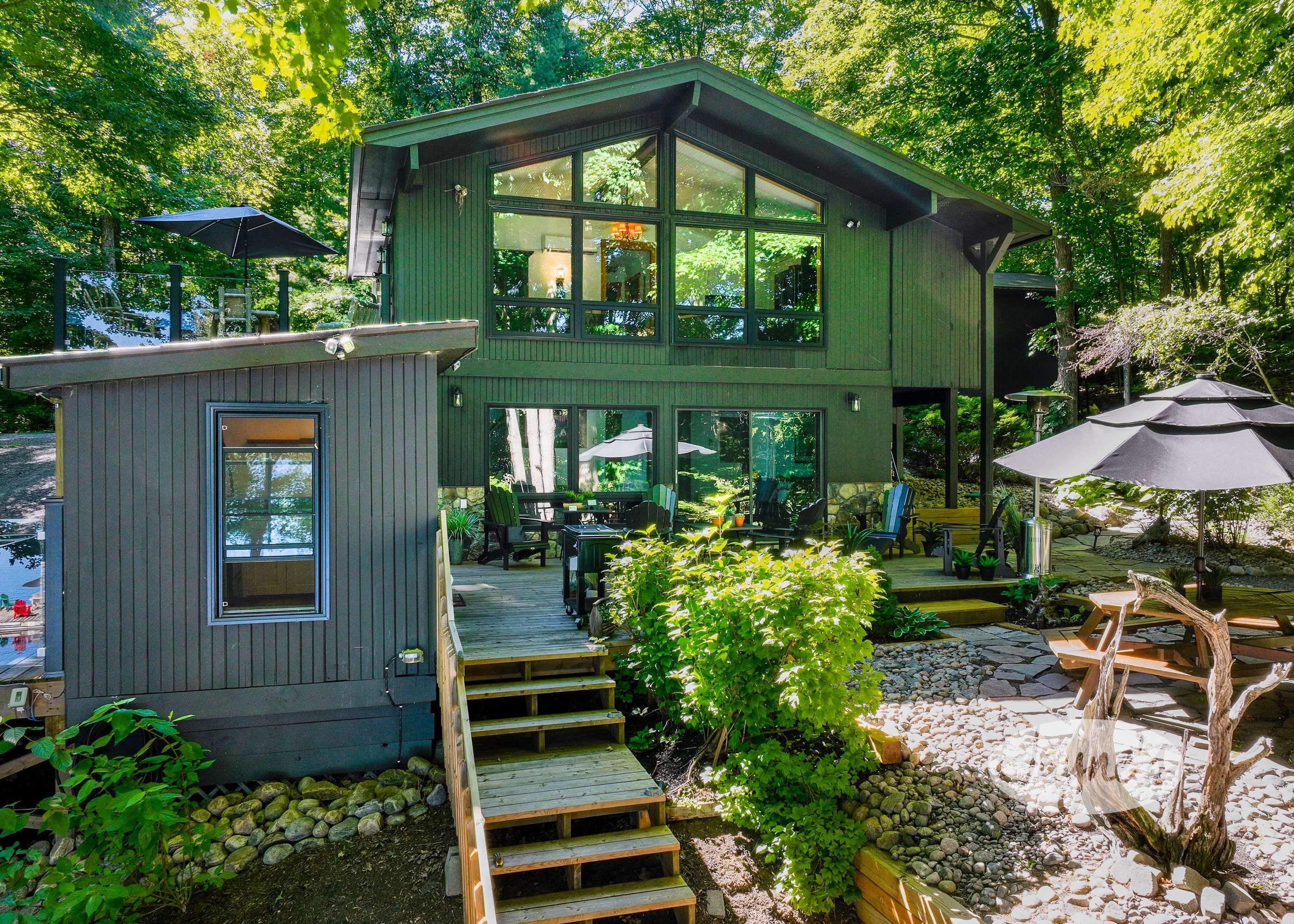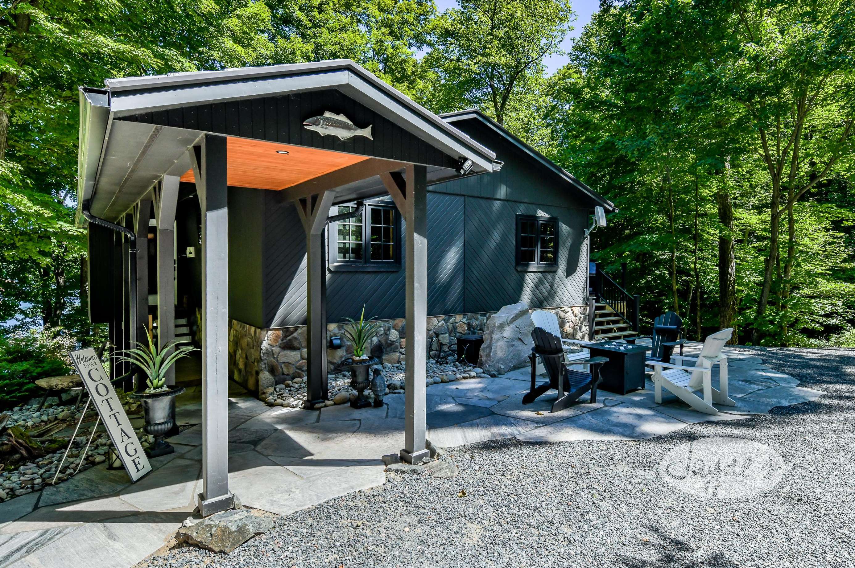 TREEHOUSE is a cottage that integrates right into its environment that is surrounded by trees, providing guests with a cozy atmospheric feeling. The guests will enjoy this in the summer especially, as the majority of the property is fully shaded! There is ample outdoor parking. As guests head up a couple of stairs to the outdoor patio on the right side of the cottage, they will find an outdoor gas fireplace, a seating area for 6 with an umbrella and a BBQ. This area is enclosed by glass railings that don’t obstruct the guests from appreciating the beautiful view. Guests will continue alongside the cottage where guests will see a BBQ, a round hot tub, an outside shower the additional outdoor kitchen and patio. With a spacious patio that has 6 Muskoka chairs, a hexagon shaped picnic table with an umbrella and a portable cooler. Whether guests want to admire the morning view while sipping on their beverage of choice or to have dinner out here one evening, the options are limitless! As guests head down the wooden stairs with a handrail, guests will find this area has a lot of fun features as well! A picnic table off to the right and directly in front will be the fire pit area that seats four. Slightly to the left side, guests will see a seating area for 2 with a card table, a ninja line and tether ball. It doesn’t stop there for the different activities you can do as there is a very generous sized beach that comes loaded with water toys and a change room! Guests will find they arrive at a spacious beach on Salmon Lake. Salmon Lake is a