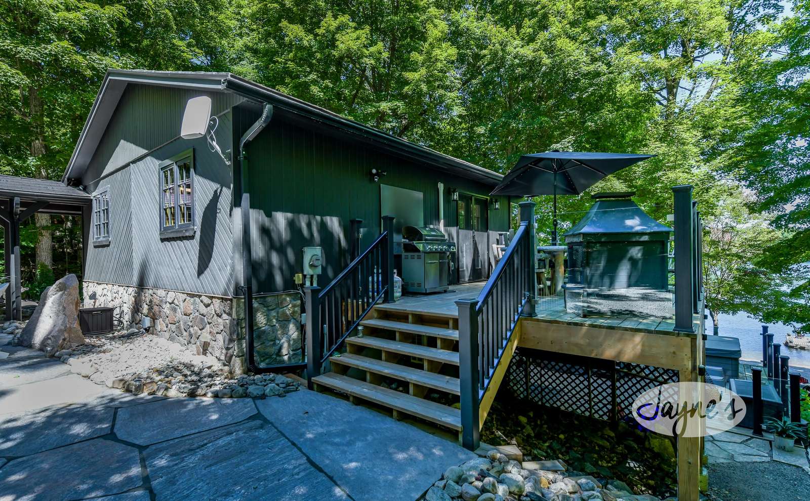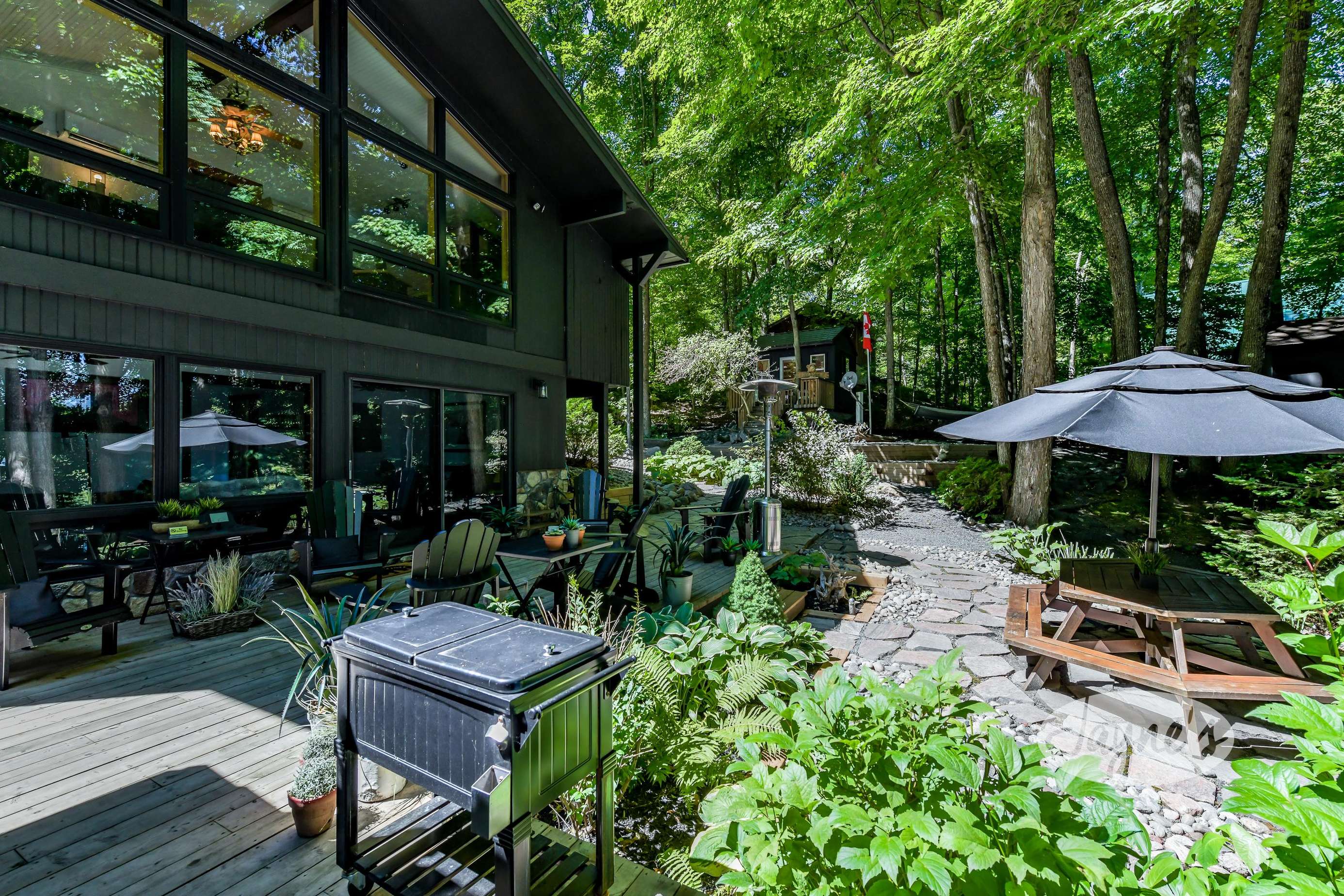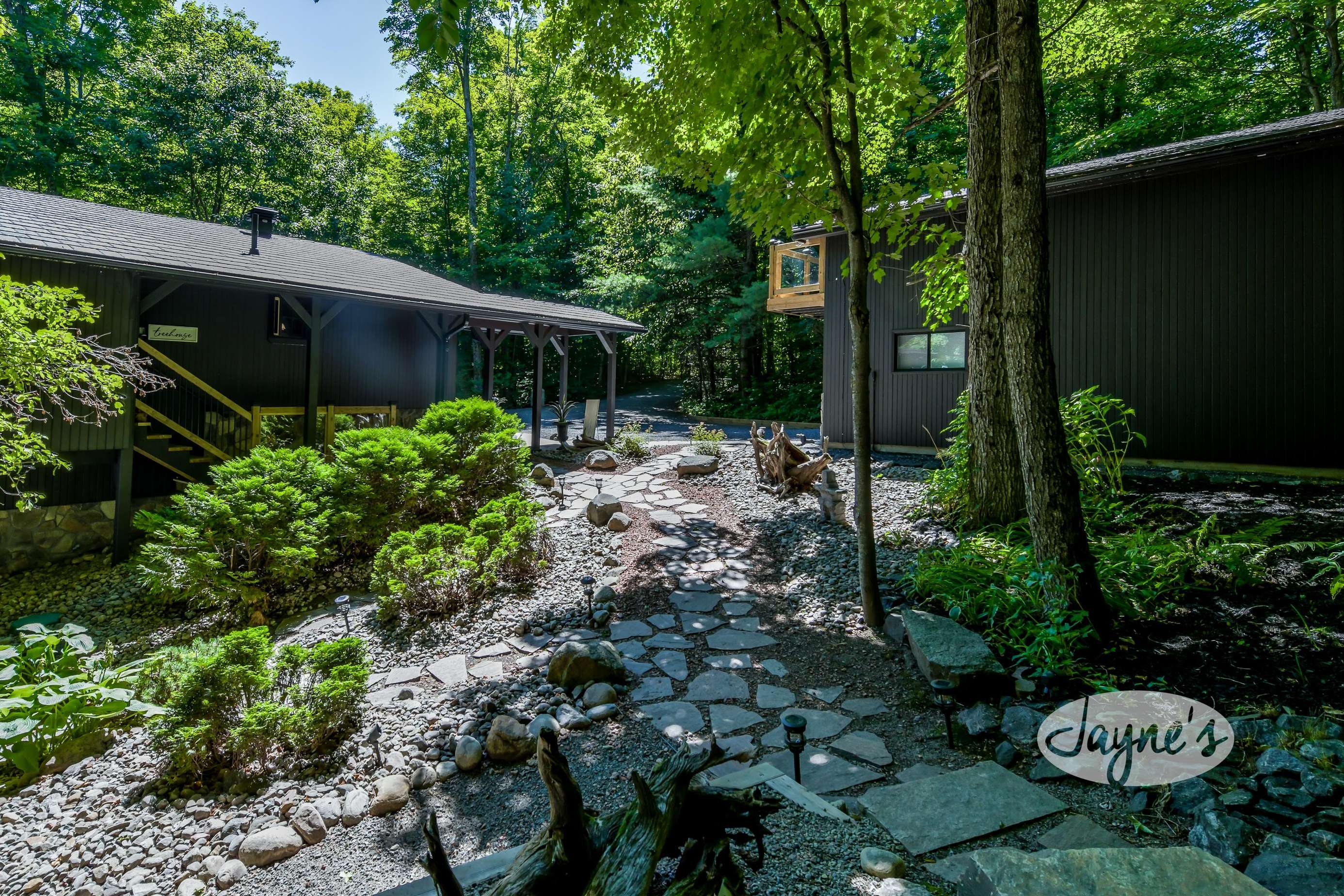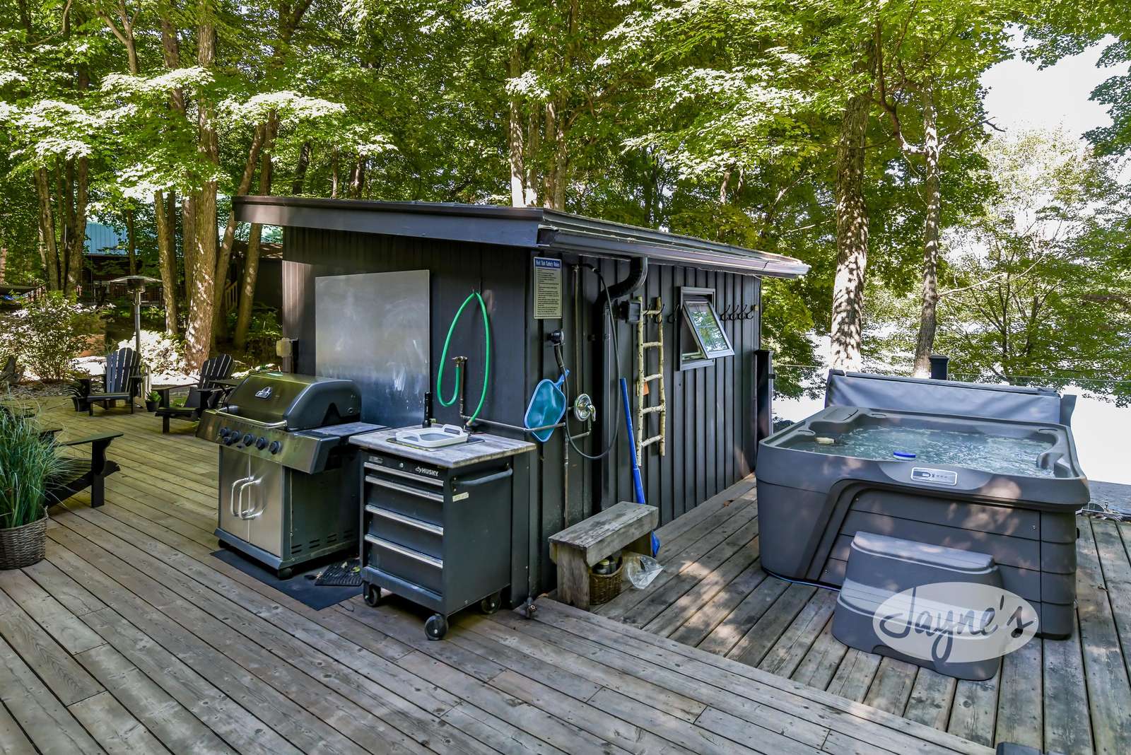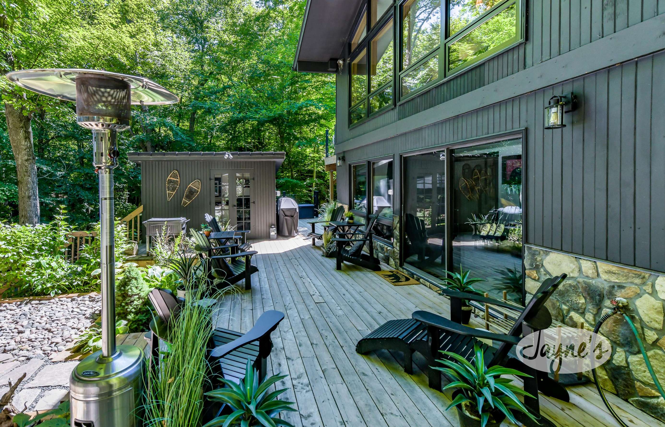 TREEHOUSE is a cottage that integrates right into its environment that is surrounded by trees, providing guests with a cozy atmospheric feeling. The guests will enjoy this in the summer especially, as the majority of the property is fully shaded! There is ample outdoor parking. As guests head up a couple of stairs to the outdoor patio on the right side of the cottage, they will find an outdoor gas fireplace, a seating area for 6 with an umbrella and a BBQ. This area is enclosed by glass railings that don’t obstruct the guests from appreciating the beautiful view. Guests will continue alongside the cottage where guests will see a BBQ, a round hot tub, an outside shower the additional outdoor kitchen and patio. With a spacious patio that has 6 Muskoka chairs, a hexagon shaped picnic table with an umbrella and a portable cooler. Whether guests want to admire the morning view while sipping on their beverage of choice or to have dinner out here one evening, the options are limitless! As guests head down the wooden stairs with a handrail, guests will find this area has a lot of fun features as well! A picnic table off to the right and directly in front will be the fire pit area that seats four. Slightly to the left side, guests will see a seating area for 2 with a card table, a ninja line and tether ball. It doesn’t stop there for the different activities you can do as there is a very generous sized beach that comes loaded with water toys and a change room! Guests will find they arrive at a spacious beach on Salmon Lake. Salmon Lake is a