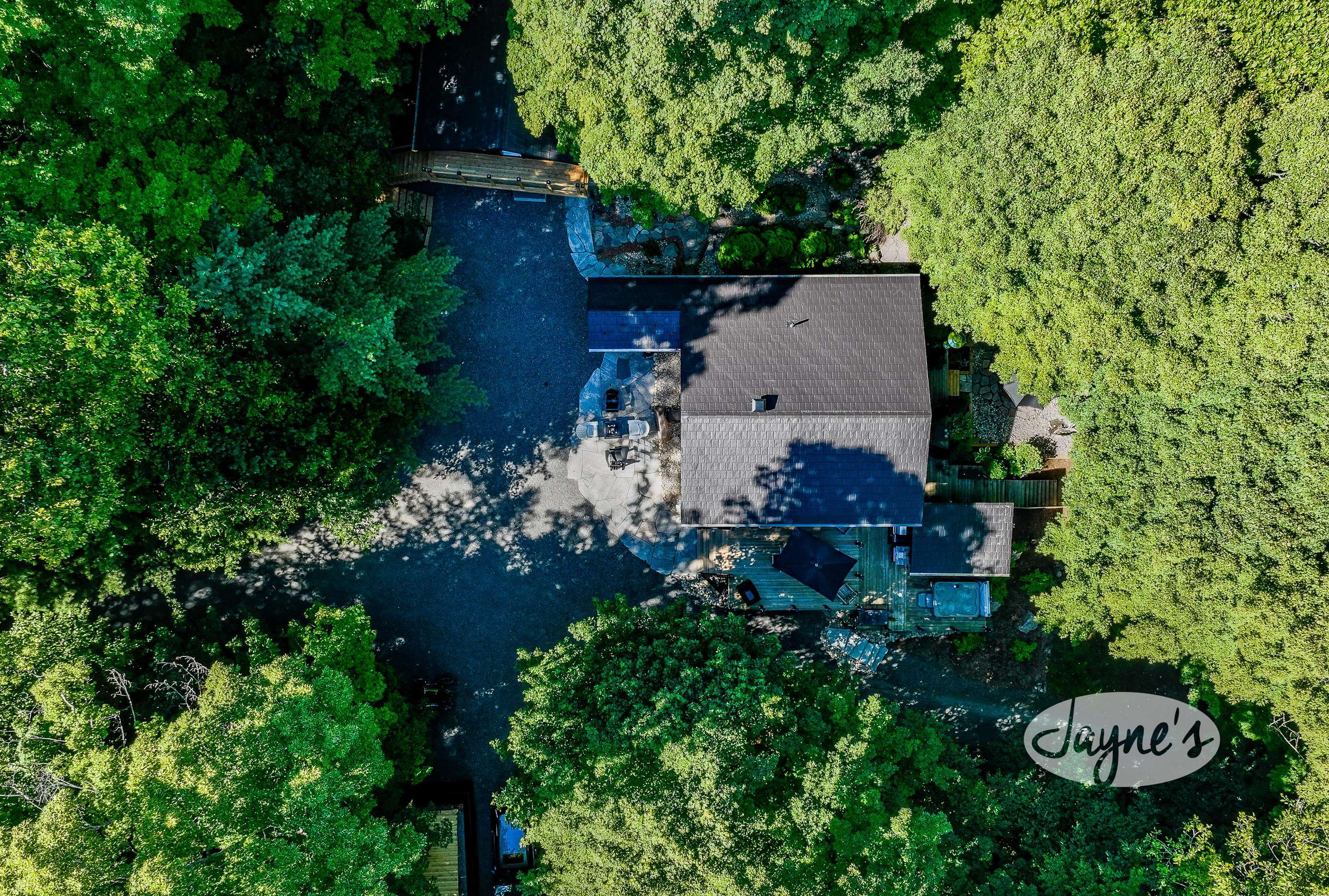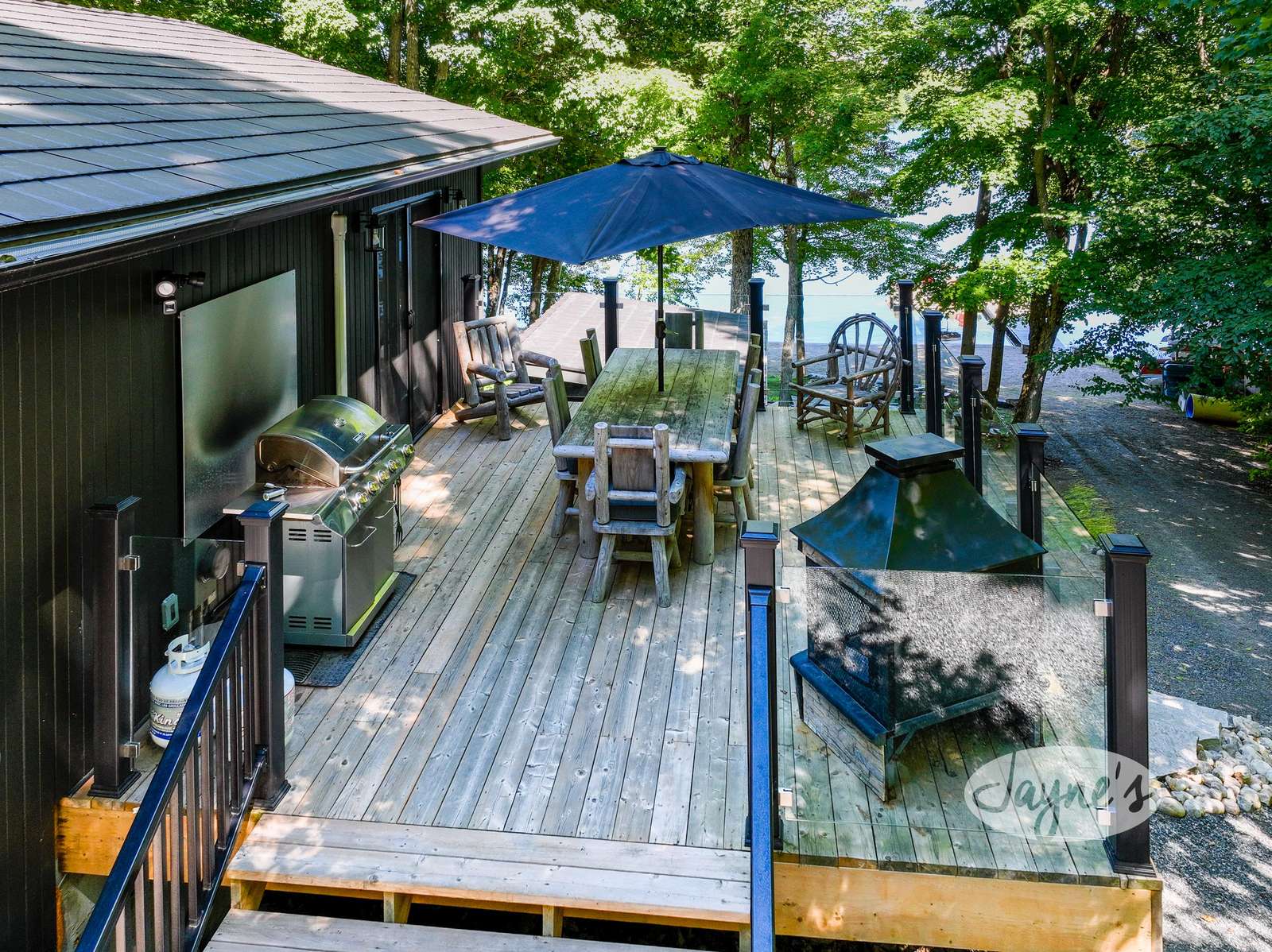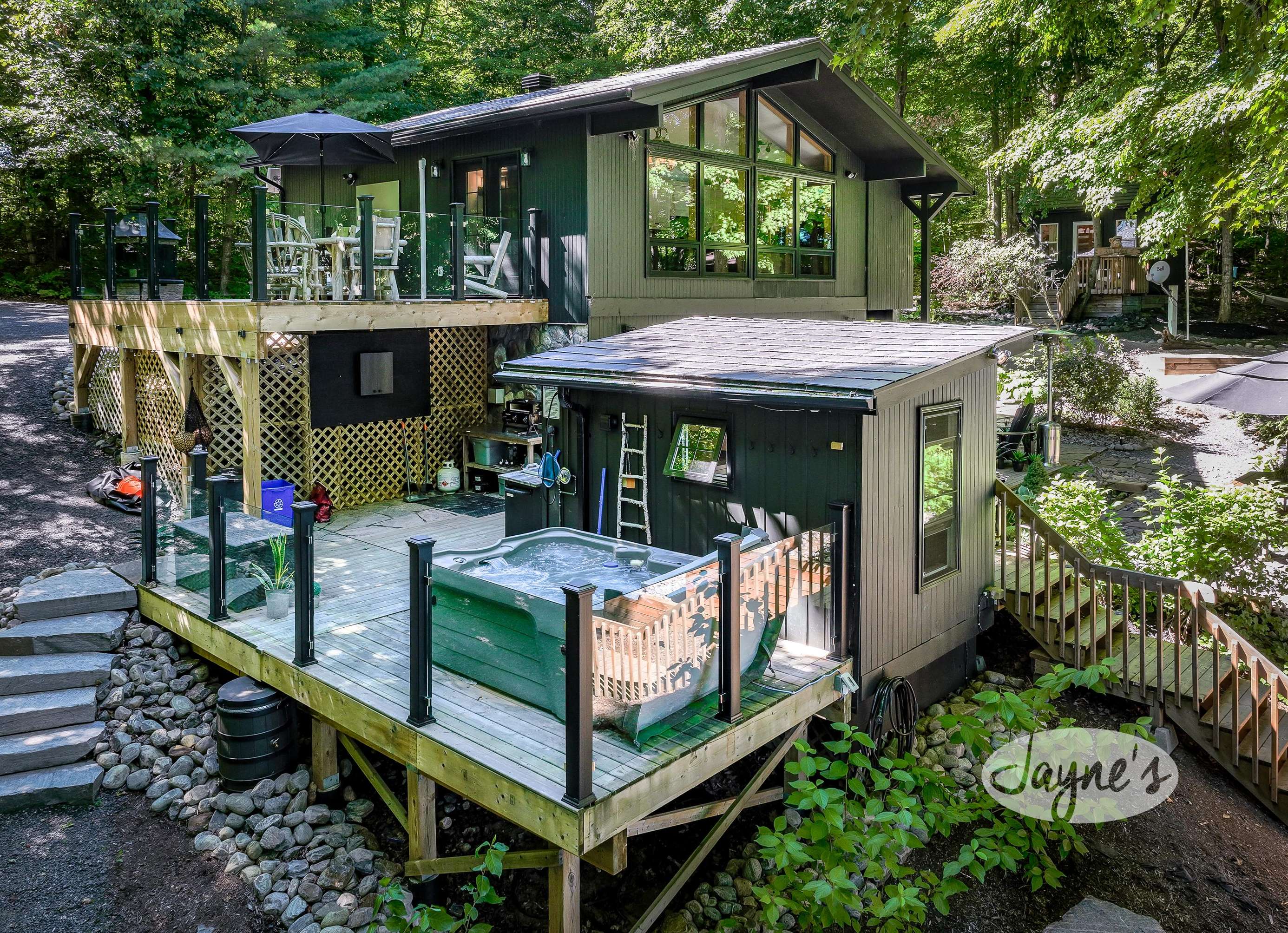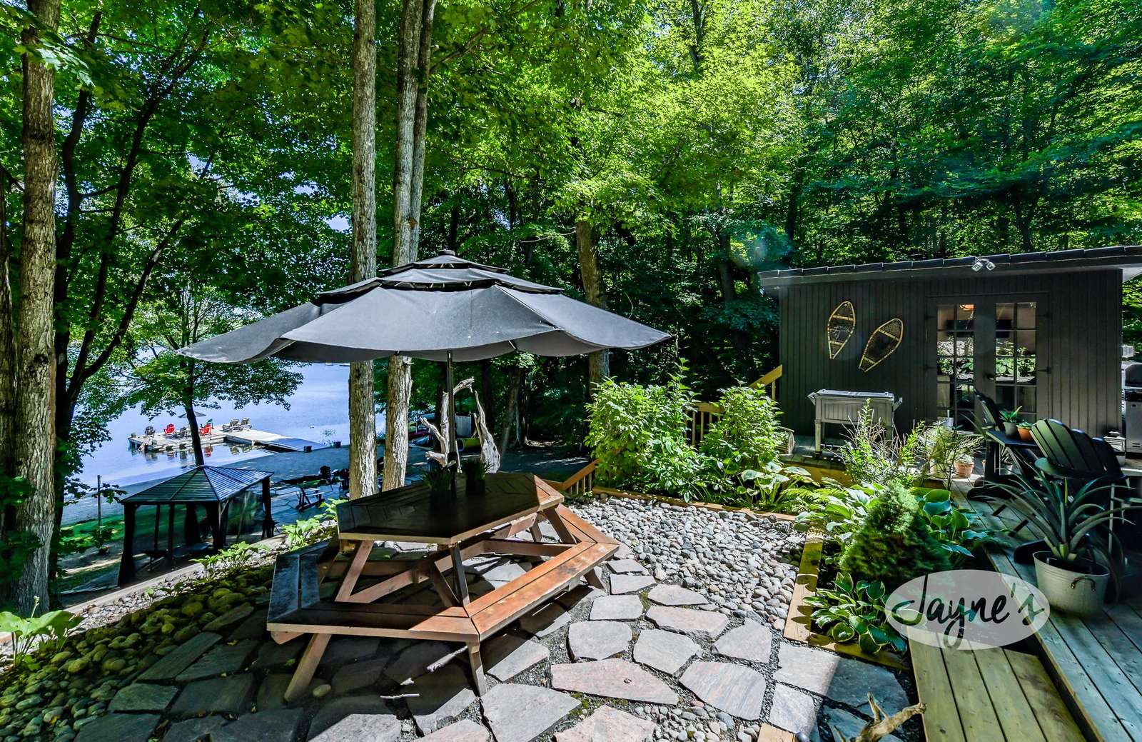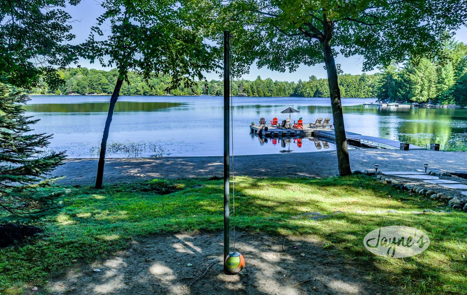 TREEHOUSE is a cottage that integrates right into its environment that is surrounded by trees, providing guests with a cozy atmospheric feeling. The guests will enjoy this in the summer especially, as the majority of the property is fully shaded! There is ample outdoor parking. As guests head up a couple of stairs to the outdoor patio on the right side of the cottage, they will find an outdoor gas fireplace, a seating area for 6 with an umbrella and a BBQ. This area is enclosed by glass railings that don’t obstruct the guests from appreciating the beautiful view. Guests will continue alongside the cottage where guests will see a BBQ, a round hot tub, an outside shower the additional outdoor kitchen and patio. With a spacious patio that has 6 Muskoka chairs, a hexagon shaped picnic table with an umbrella and a portable cooler. Whether guests want to admire the morning view while sipping on their beverage of choice or to have dinner out here one evening, the options are limitless! As guests head down the wooden stairs with a handrail, guests will find this area has a lot of fun features as well! A picnic table off to the right and directly in front will be the fire pit area that seats four. Slightly to the left side, guests will see a seating area for 2 with a card table, a ninja line and tether ball. It doesn’t stop there for the different activities you can do as there is a very generous sized beach that comes loaded with water toys and a change room! Guests will find they arrive at a spacious beach on Salmon Lake. Salmon Lake is a