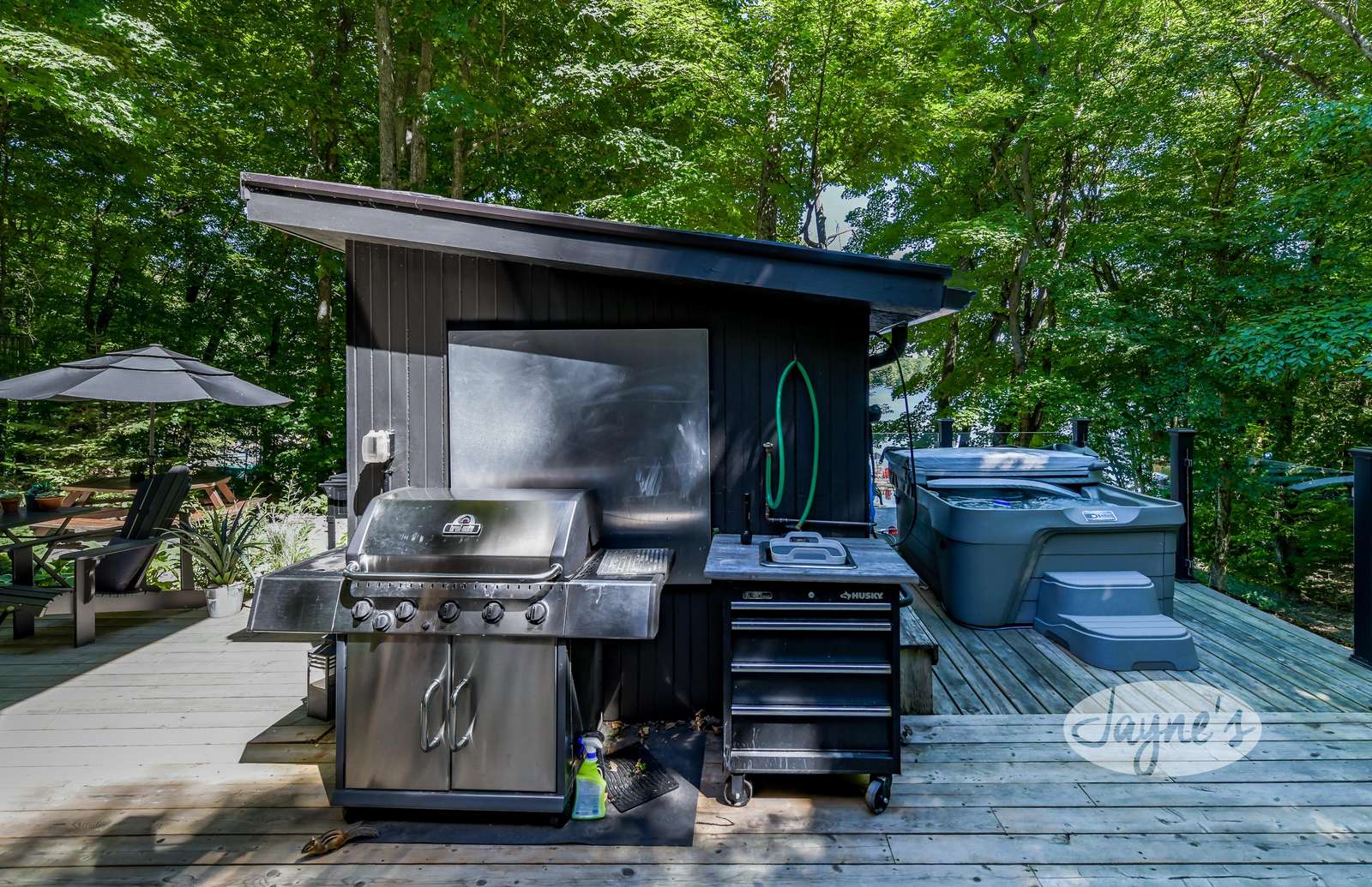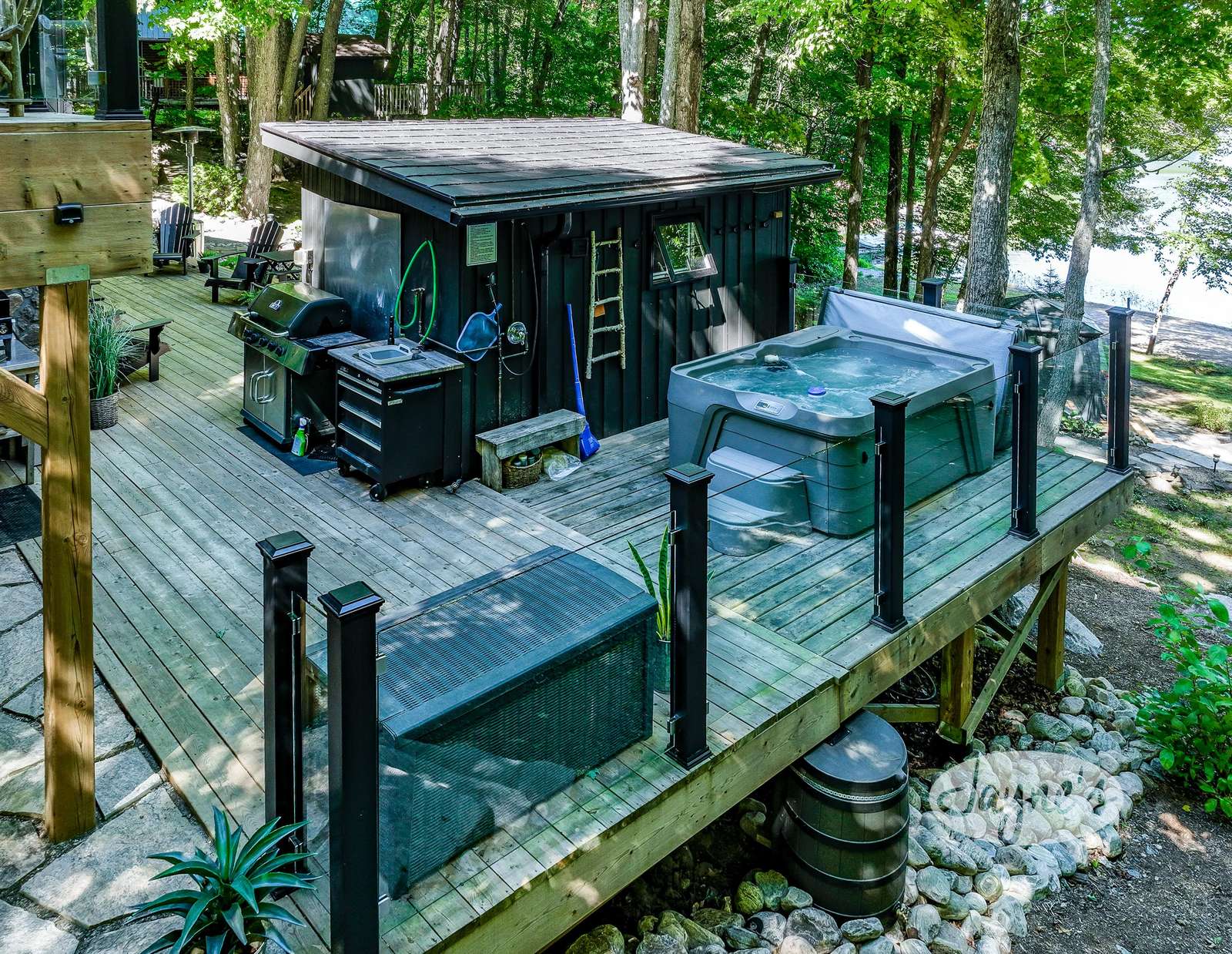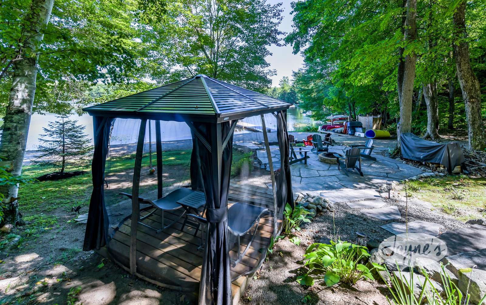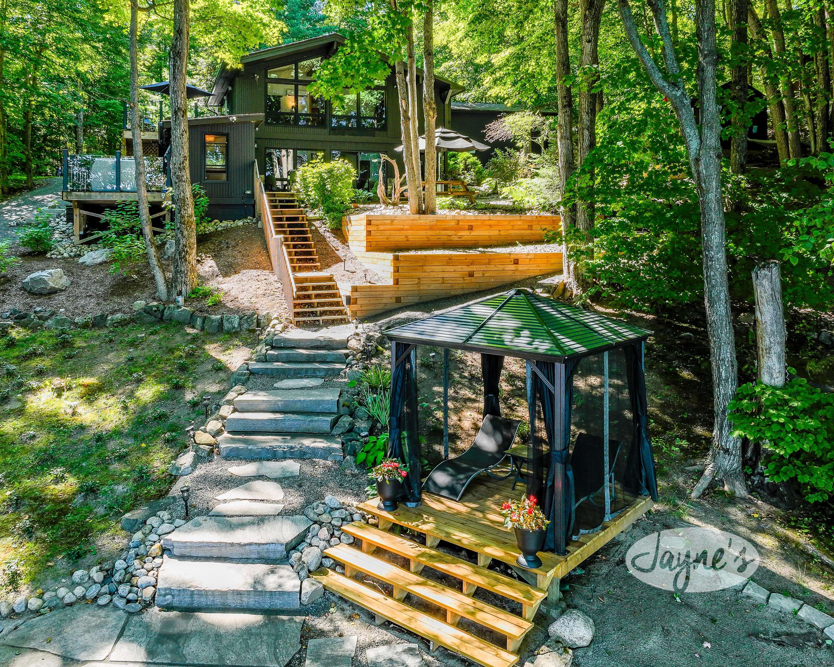 TREEHOUSE is a cottage that integrates right into its environment that is surrounded by trees, providing guests with a cozy atmospheric feeling. The guests will enjoy this in the summer especially, as the majority of the property is fully shaded! There is ample outdoor parking. As guests head up a couple of stairs to the outdoor patio on the right side of the cottage, they will find an outdoor gas fireplace, a seating area for 6 with an umbrella and a BBQ. This area is enclosed by glass railings that don’t obstruct the guests from appreciating the beautiful view. Guests will continue alongside the cottage where guests will see a BBQ, a round hot tub, an outside shower the additional outdoor kitchen and patio. With a spacious patio that has 6 Muskoka chairs, a hexagon shaped picnic table with an umbrella and a portable cooler. Whether guests want to admire the morning view while sipping on their beverage of choice or to have dinner out here one evening, the options are limitless! As guests head down the wooden stairs with a handrail, guests will find this area has a lot of fun features as well! A picnic table off to the right and directly in front will be the fire pit area that seats four. Slightly to the left side, guests will see a seating area for 2 with a card table, a ninja line and tether ball. It doesn’t stop there for the different activities you can do as there is a very generous sized beach that comes loaded with water toys and a change room! Guests will find they arrive at a spacious beach on Salmon Lake. Salmon Lake is a
