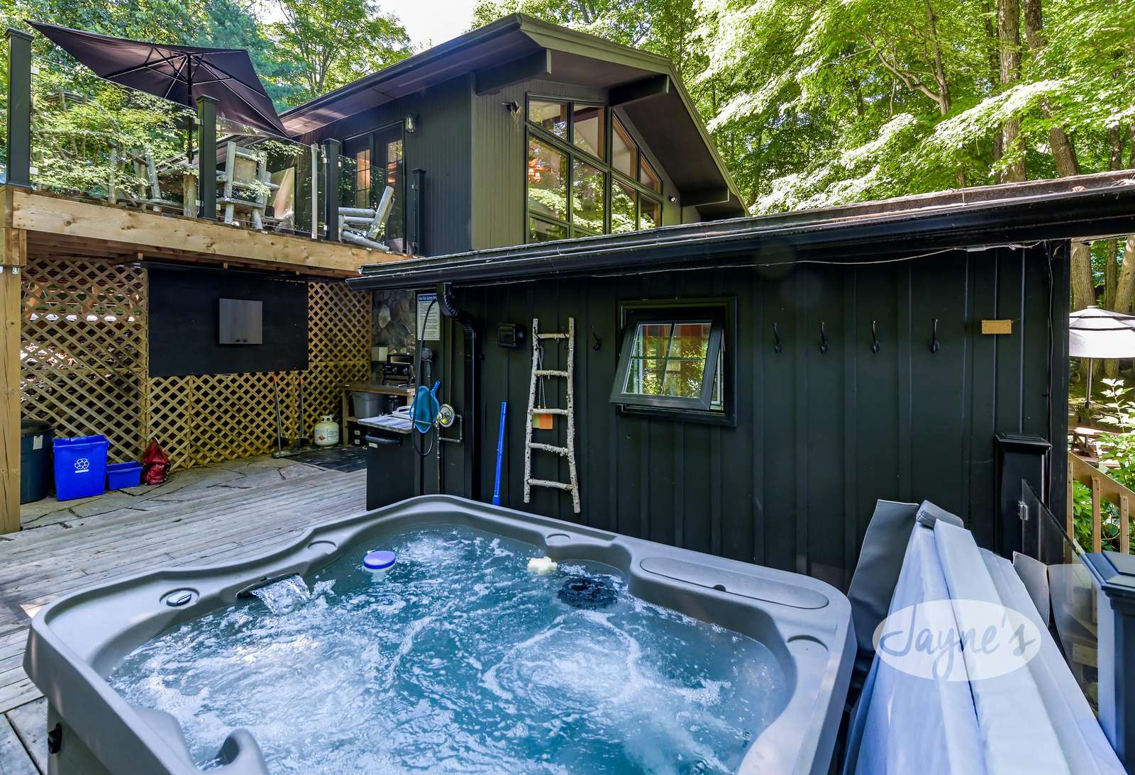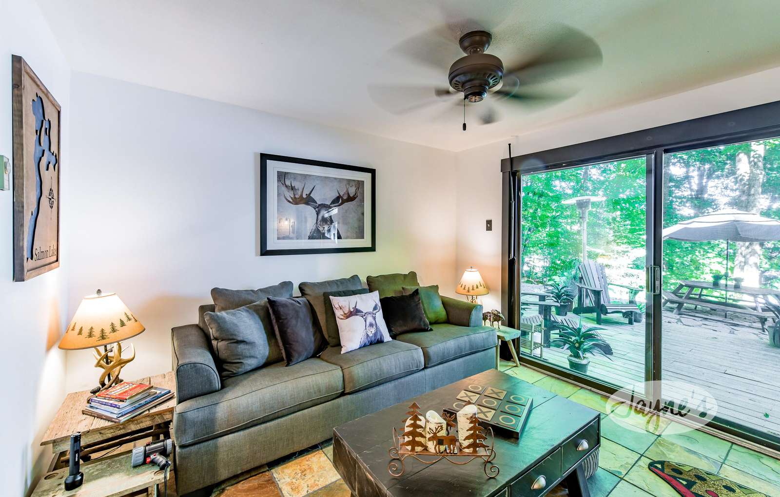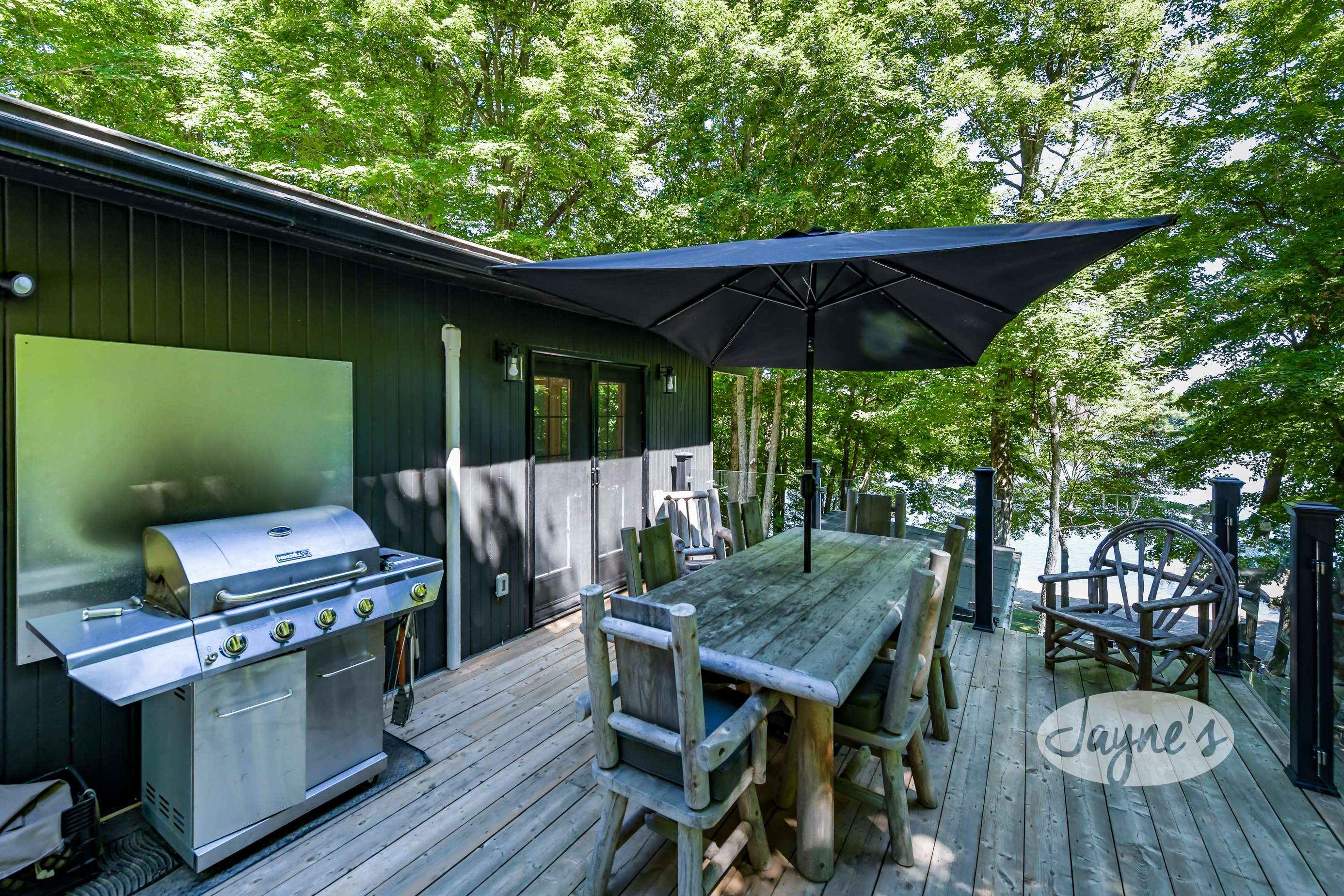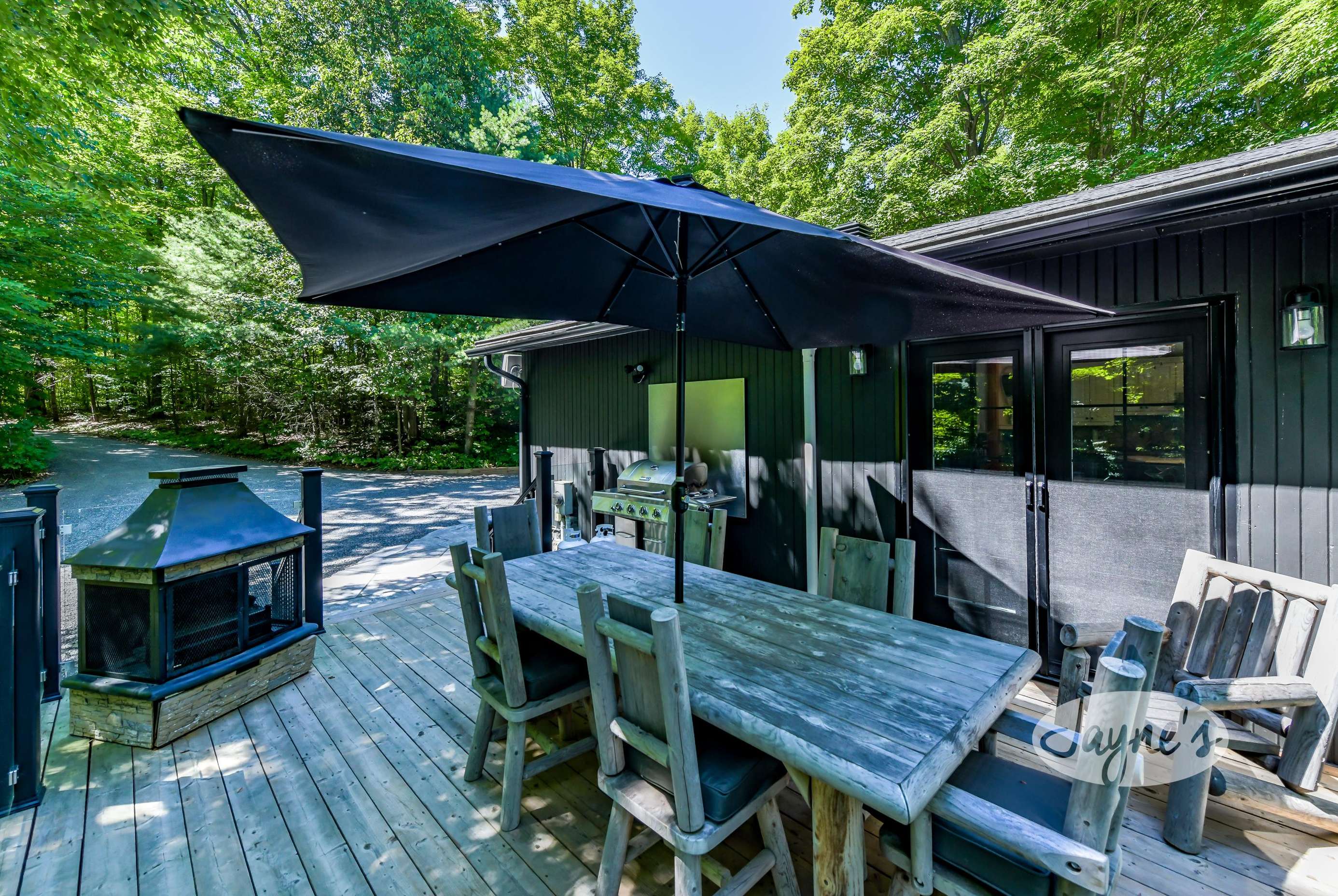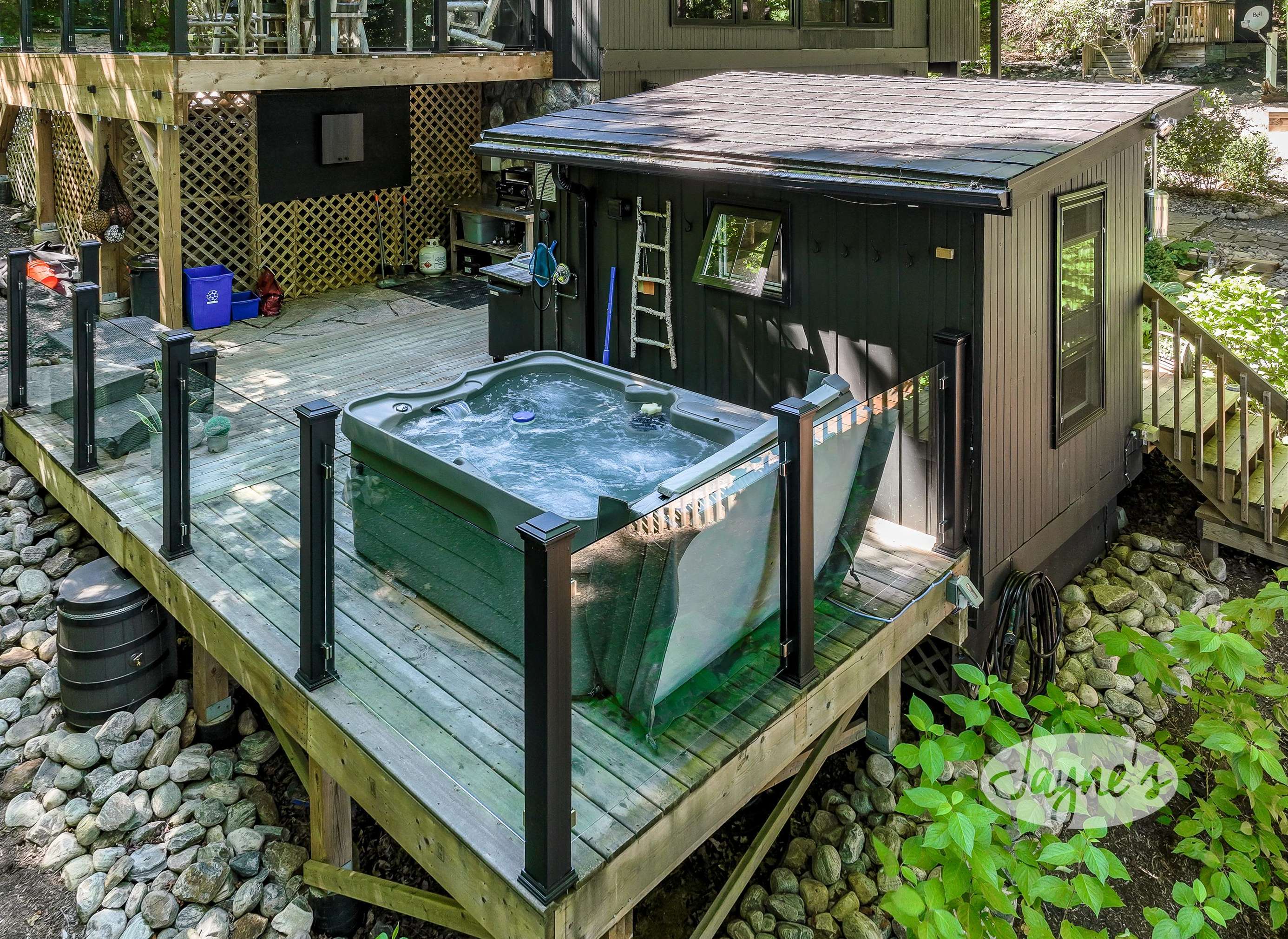 TREEHOUSE is a cottage that integrates right into its environment that is surrounded by trees, providing guests with a cozy atmospheric feeling. The guests will enjoy this in the summer especially, as the majority of the property is fully shaded! There is ample outdoor parking. As guests head up a couple of stairs to the outdoor patio on the right side of the cottage, they will find an outdoor gas fireplace, a seating area for 6 with an umbrella and a BBQ. This area is enclosed by glass railings that don’t obstruct the guests from appreciating the beautiful view. Guests will continue alongside the cottage where guests will see a BBQ, a round hot tub, an outside shower the additional outdoor kitchen and patio. With a spacious patio that has 6 Muskoka chairs, a hexagon shaped picnic table with an umbrella and a portable cooler. Whether guests want to admire the morning view while sipping on their beverage of choice or to have dinner out here one evening, the options are limitless! As guests head down the wooden stairs with a handrail, guests will find this area has a lot of fun features as well! A picnic table off to the right and directly in front will be the fire pit area that seats four. Slightly to the left side, guests will see a seating area for 2 with a card table, a ninja line and tether ball. It doesn’t stop there for the different activities you can do as there is a very generous sized beach that comes loaded with water toys and a change room! Guests will find they arrive at a spacious beach on Salmon Lake. Salmon Lake is a