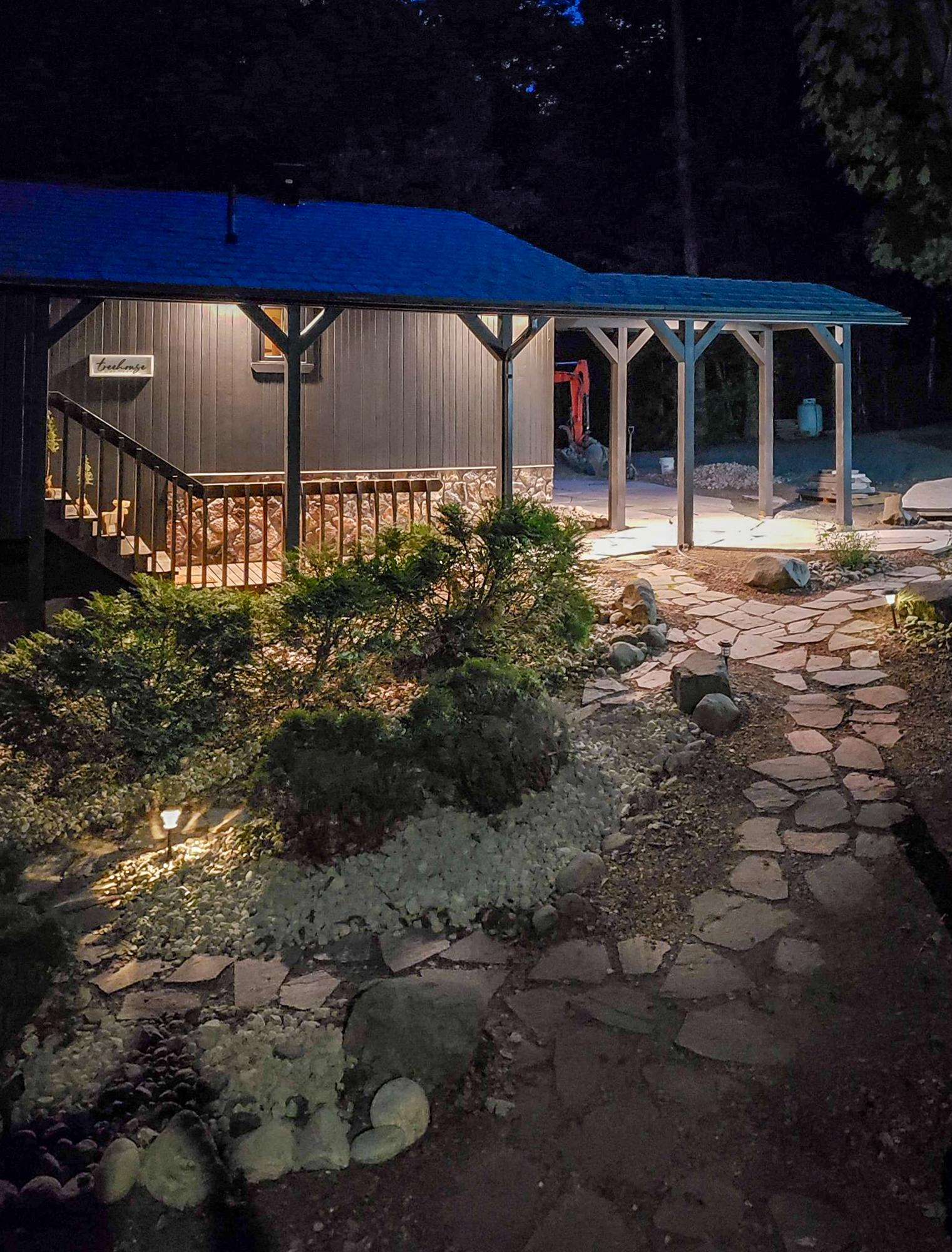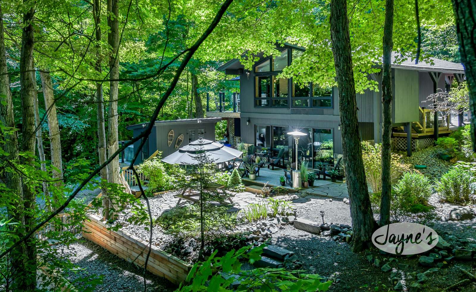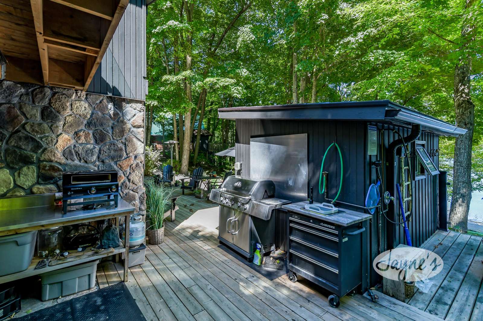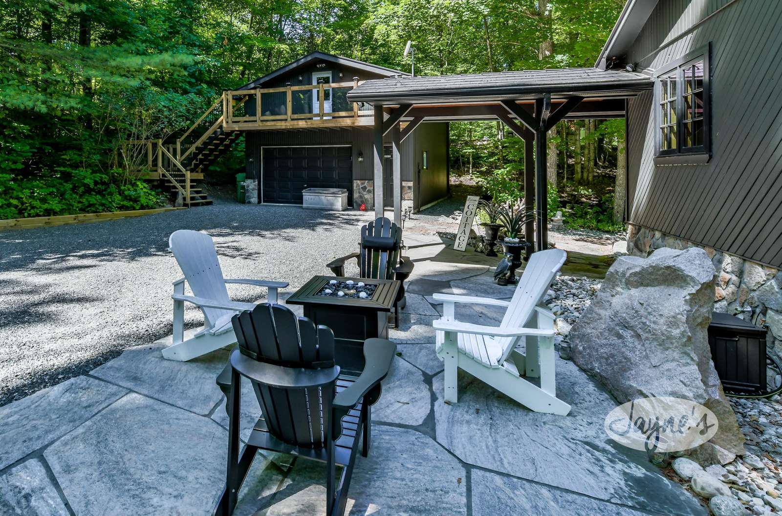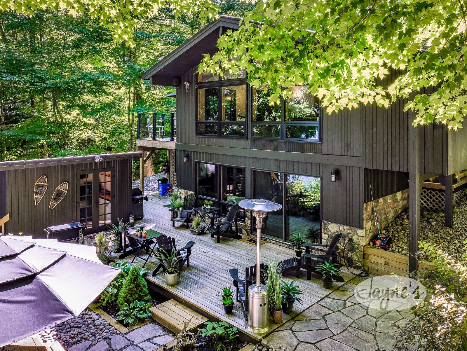 TREEHOUSE is a cottage that integrates right into its environment that is surrounded by trees, providing guests with a cozy atmospheric feeling. The guests will enjoy this in the summer especially, as the majority of the property is fully shaded! There is ample outdoor parking. As guests head up a couple of stairs to the outdoor patio on the right side of the cottage, they will find an outdoor gas fireplace, a seating area for 6 with an umbrella and a BBQ. This area is enclosed by glass railings that don’t obstruct the guests from appreciating the beautiful view. Guests will continue alongside the cottage where guests will see a BBQ, a round hot tub, an outside shower the additional outdoor kitchen and patio. With a spacious patio that has 6 Muskoka chairs, a hexagon shaped picnic table with an umbrella and a portable cooler. Whether guests want to admire the morning view while sipping on their beverage of choice or to have dinner out here one evening, the options are limitless! As guests head down the wooden stairs with a handrail, guests will find this area has a lot of fun features as well! A picnic table off to the right and directly in front will be the fire pit area that seats four. Slightly to the left side, guests will see a seating area for 2 with a card table, a ninja line and tether ball. It doesn’t stop there for the different activities you can do as there is a very generous sized beach that comes loaded with water toys and a change room! Guests will find they arrive at a spacious beach on Salmon Lake. Salmon Lake is a