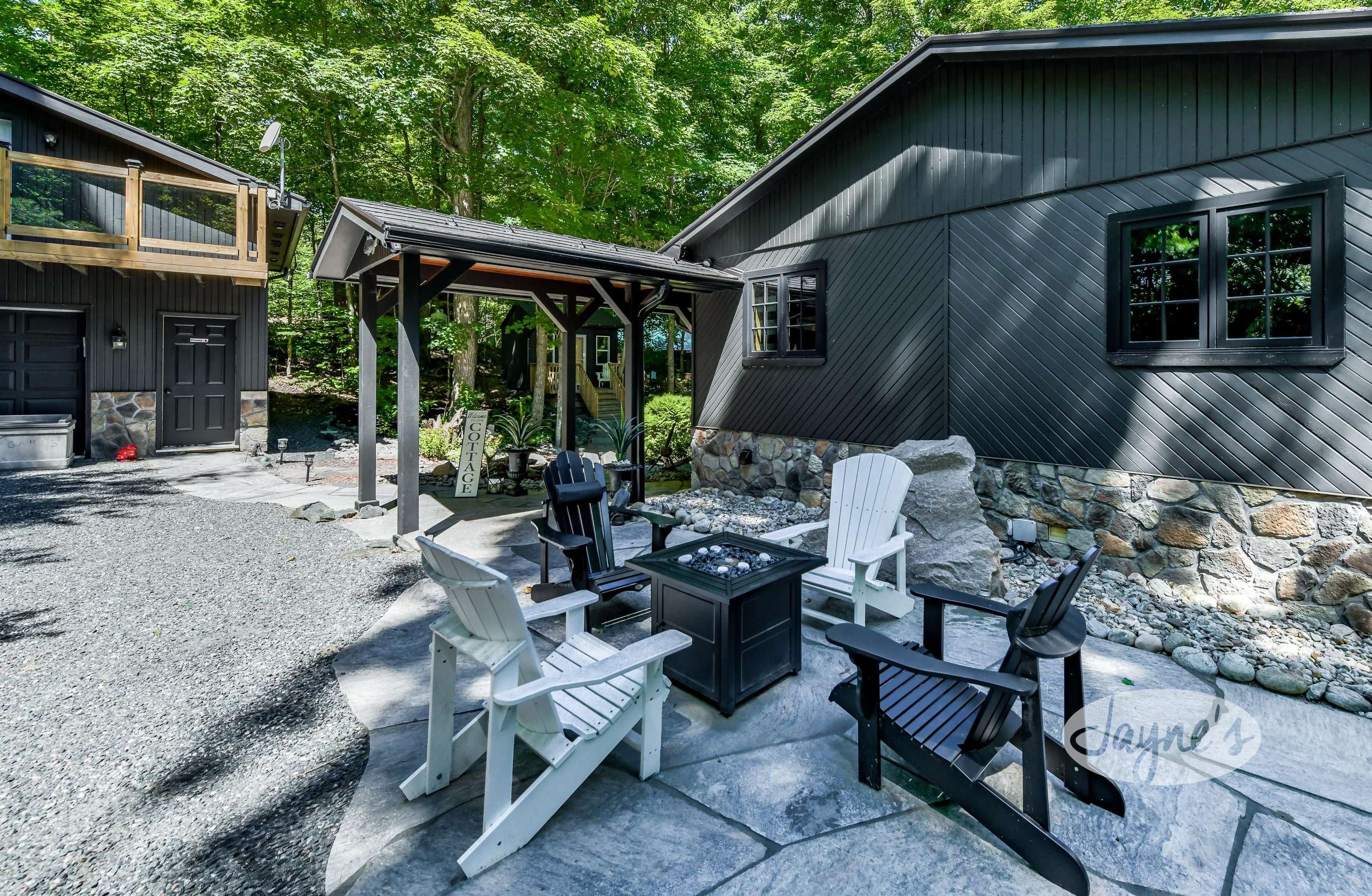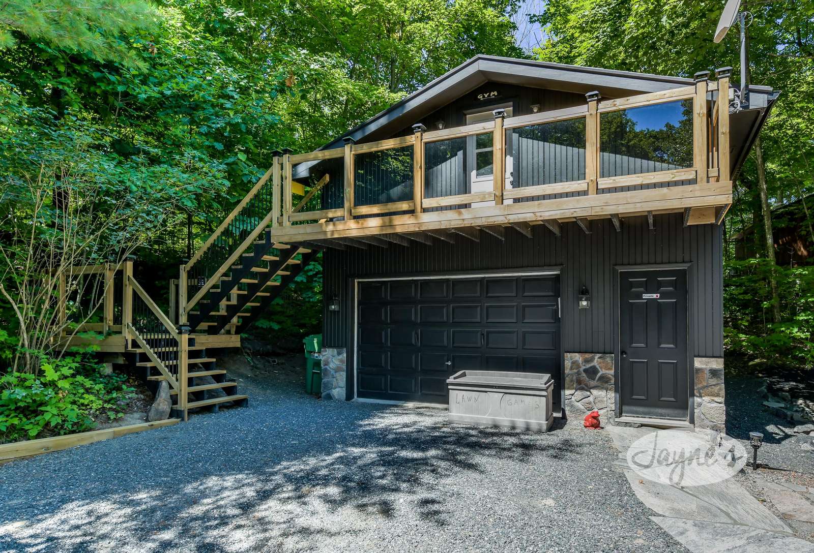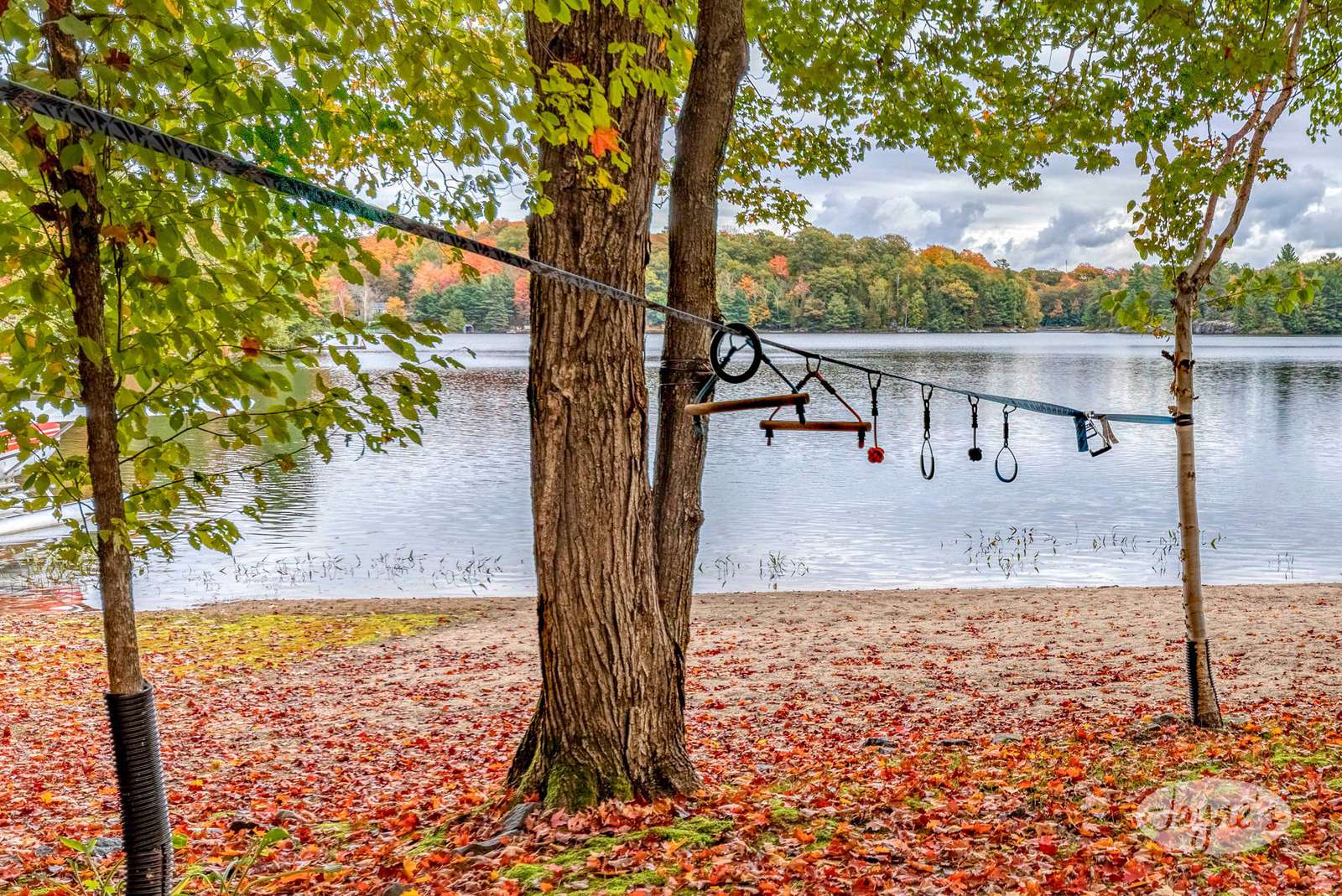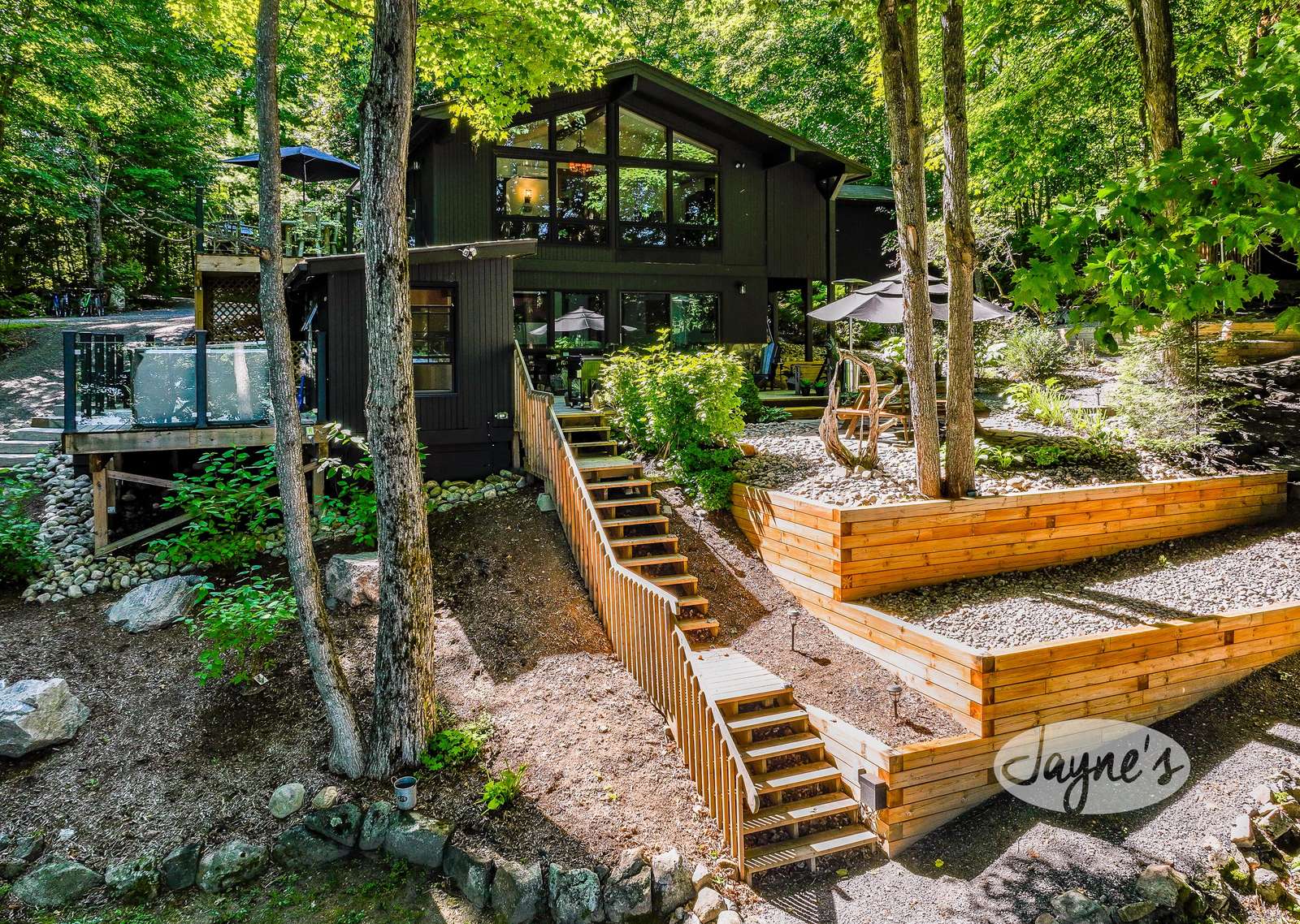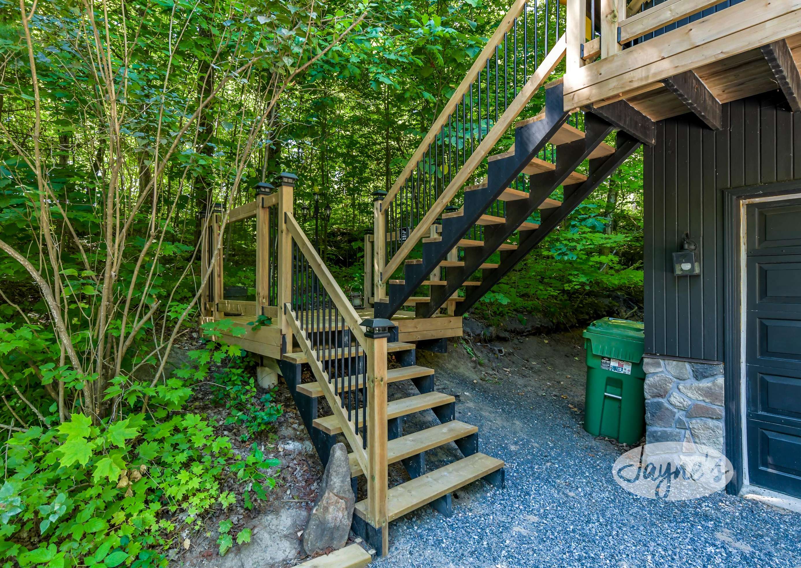 TREEHOUSE is a cottage that integrates right into its environment that is surrounded by trees, providing guests with a cozy atmospheric feeling. The guests will enjoy this in the summer especially, as the majority of the property is fully shaded! There is ample outdoor parking. As guests head up a couple of stairs to the outdoor patio on the right side of the cottage, they will find an outdoor gas fireplace, a seating area for 6 with an umbrella and a BBQ. This area is enclosed by glass railings that don’t obstruct the guests from appreciating the beautiful view. Guests will continue alongside the cottage where guests will see a BBQ, a round hot tub, an outside shower the additional outdoor kitchen and patio. With a spacious patio that has 6 Muskoka chairs, a hexagon shaped picnic table with an umbrella and a portable cooler. Whether guests want to admire the morning view while sipping on their beverage of choice or to have dinner out here one evening, the options are limitless! As guests head down the wooden stairs with a handrail, guests will find this area has a lot of fun features as well! A picnic table off to the right and directly in front will be the fire pit area that seats four. Slightly to the left side, guests will see a seating area for 2 with a card table, a ninja line and tether ball. It doesn’t stop there for the different activities you can do as there is a very generous sized beach that comes loaded with water toys and a change room! Guests will find they arrive at a spacious beach on Salmon Lake. Salmon Lake is a