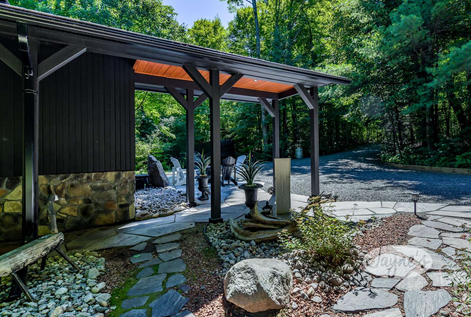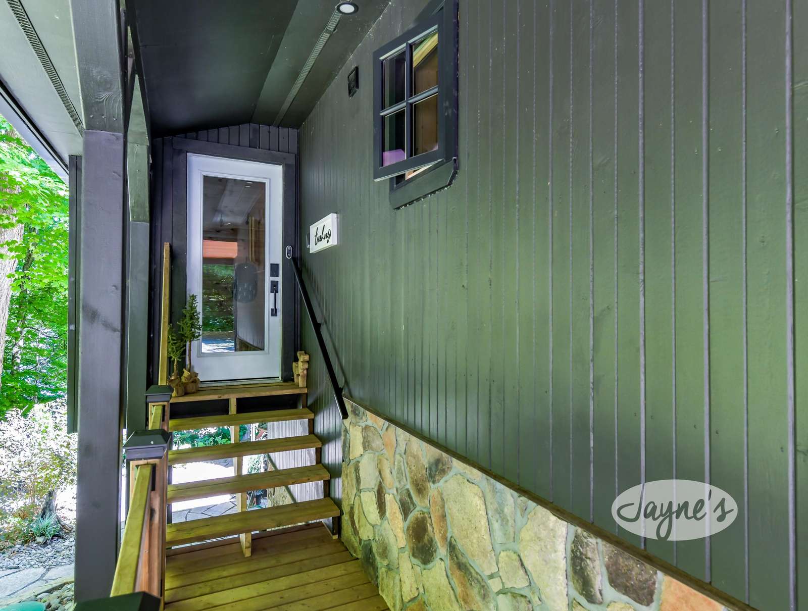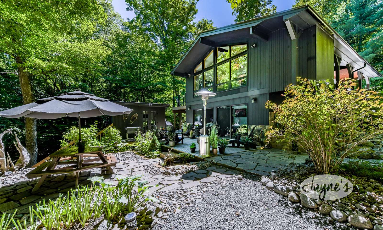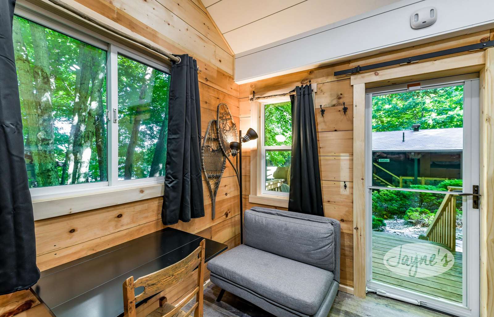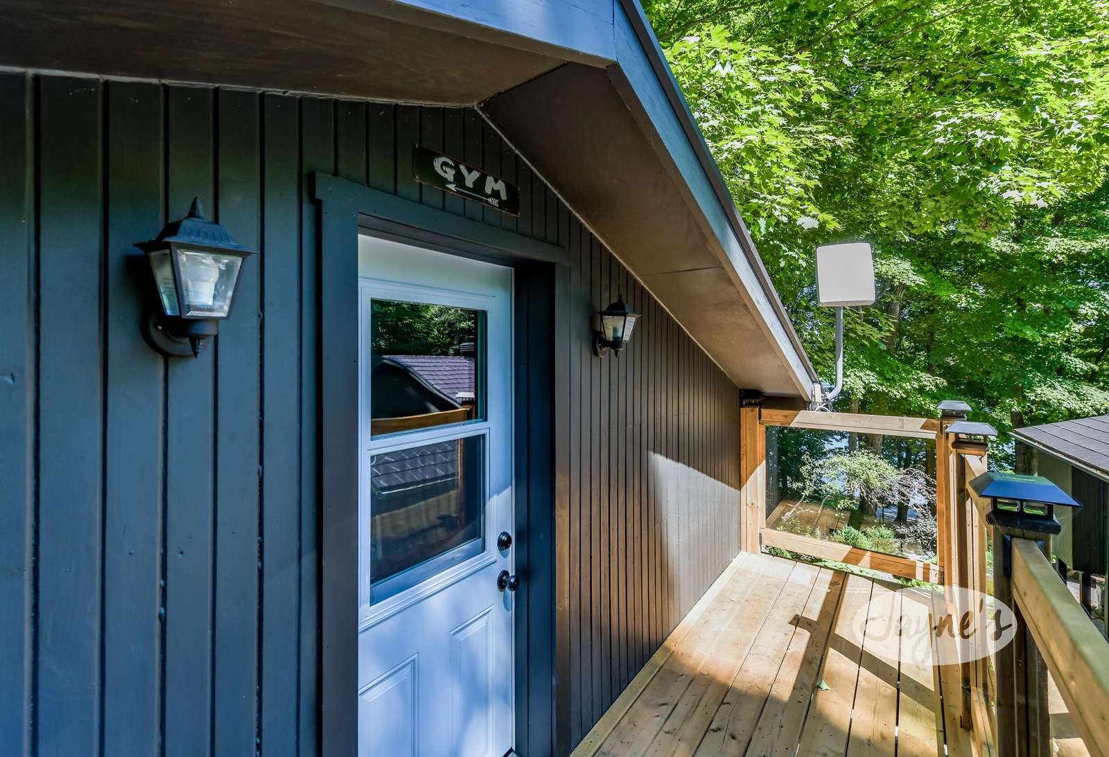 TREEHOUSE is a cottage that integrates right into its environment that is surrounded by trees, providing guests with a cozy atmospheric feeling. The guests will enjoy this in the summer especially, as the majority of the property is fully shaded! There is ample outdoor parking. As guests head up a couple of stairs to the outdoor patio on the right side of the cottage, they will find an outdoor gas fireplace, a seating area for 6 with an umbrella and a BBQ. This area is enclosed by glass railings that don’t obstruct the guests from appreciating the beautiful view. Guests will continue alongside the cottage where guests will see a BBQ, a round hot tub, an outside shower the additional outdoor kitchen and patio. With a spacious patio that has 6 Muskoka chairs, a hexagon shaped picnic table with an umbrella and a portable cooler. Whether guests want to admire the morning view while sipping on their beverage of choice or to have dinner out here one evening, the options are limitless! As guests head down the wooden stairs with a handrail, guests will find this area has a lot of fun features as well! A picnic table off to the right and directly in front will be the fire pit area that seats four. Slightly to the left side, guests will see a seating area for 2 with a card table, a ninja line and tether ball. It doesn’t stop there for the different activities you can do as there is a very generous sized beach that comes loaded with water toys and a change room! Guests will find they arrive at a spacious beach on Salmon Lake. Salmon Lake is a