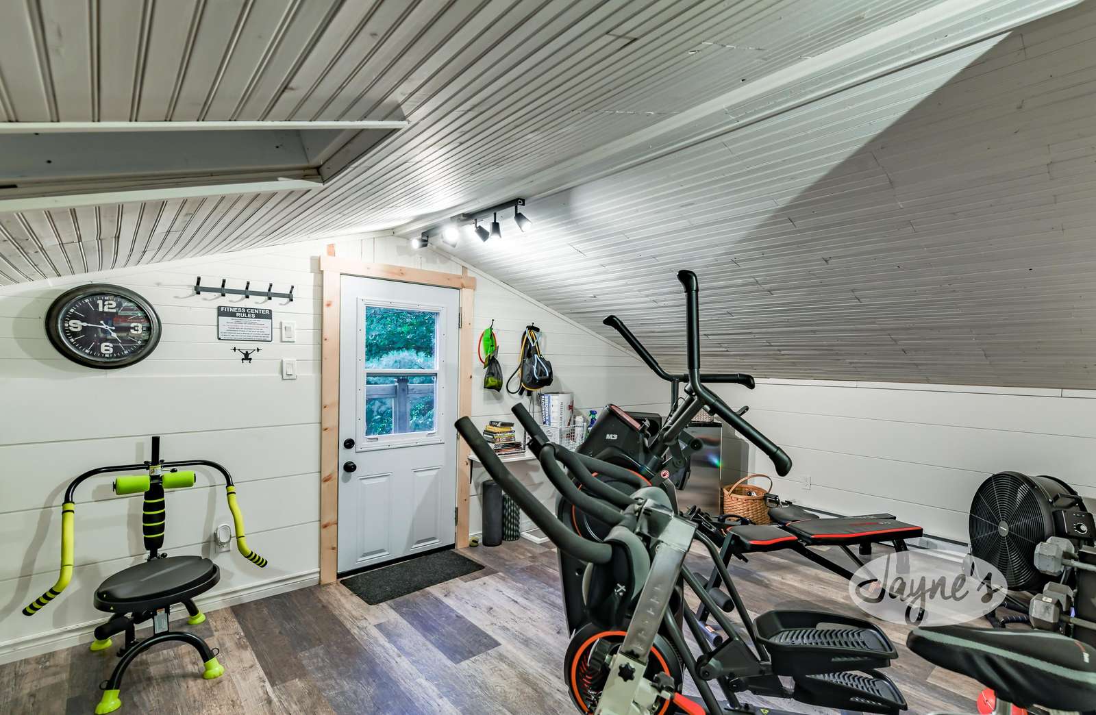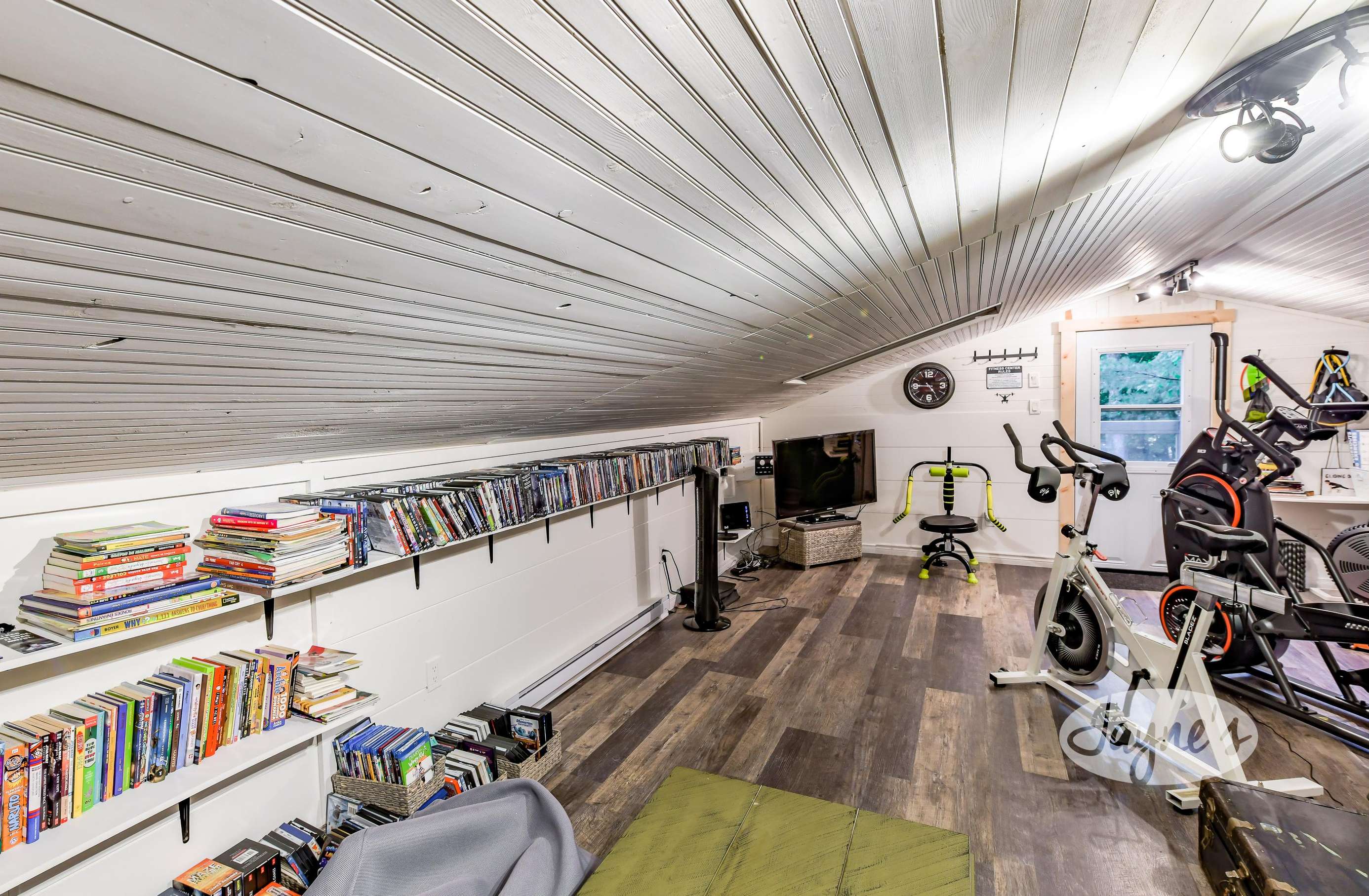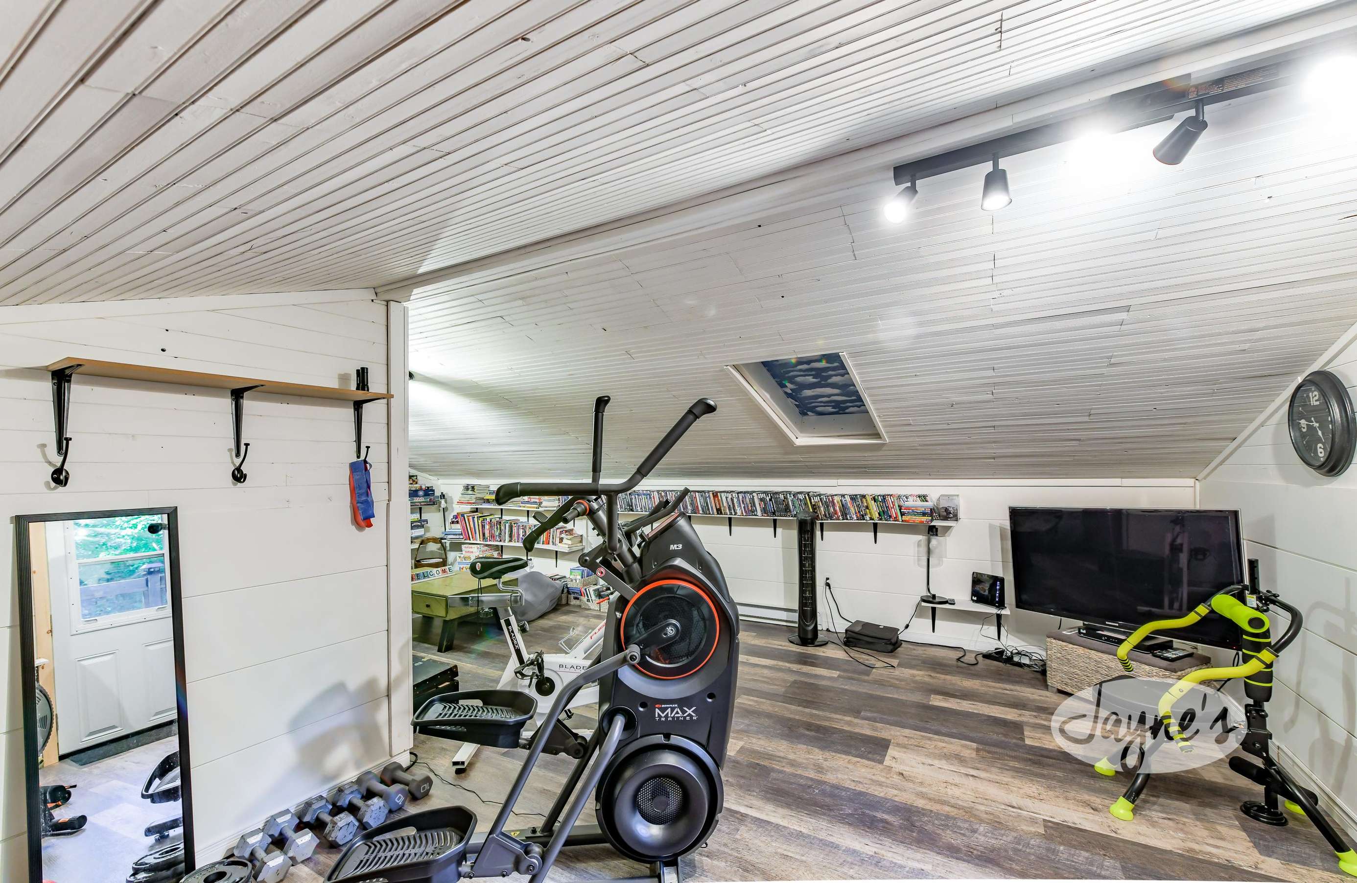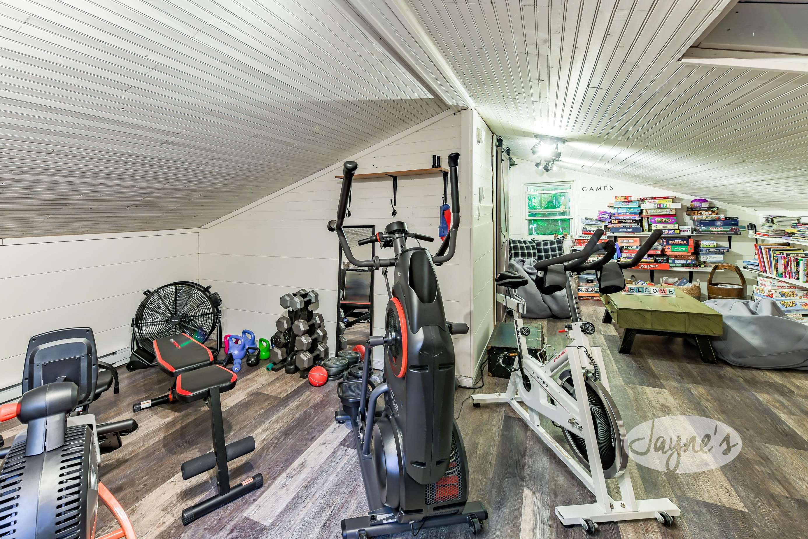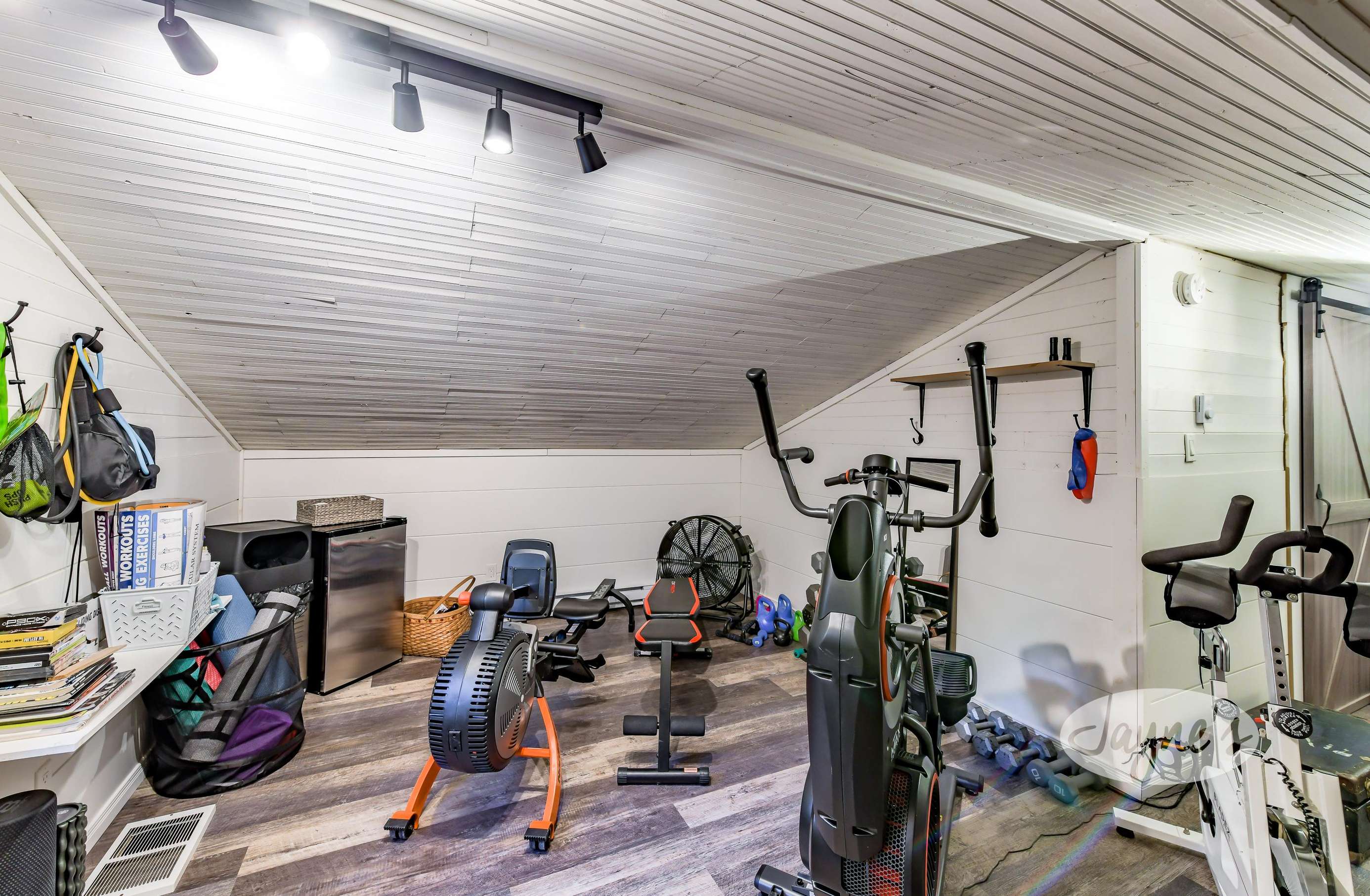 This is where the workout equipment will be. There is an elliptical, rowing machine, bike, satellite TV, weights, kettlebells, yoga mats, tons of books, a bench, and small fridge for