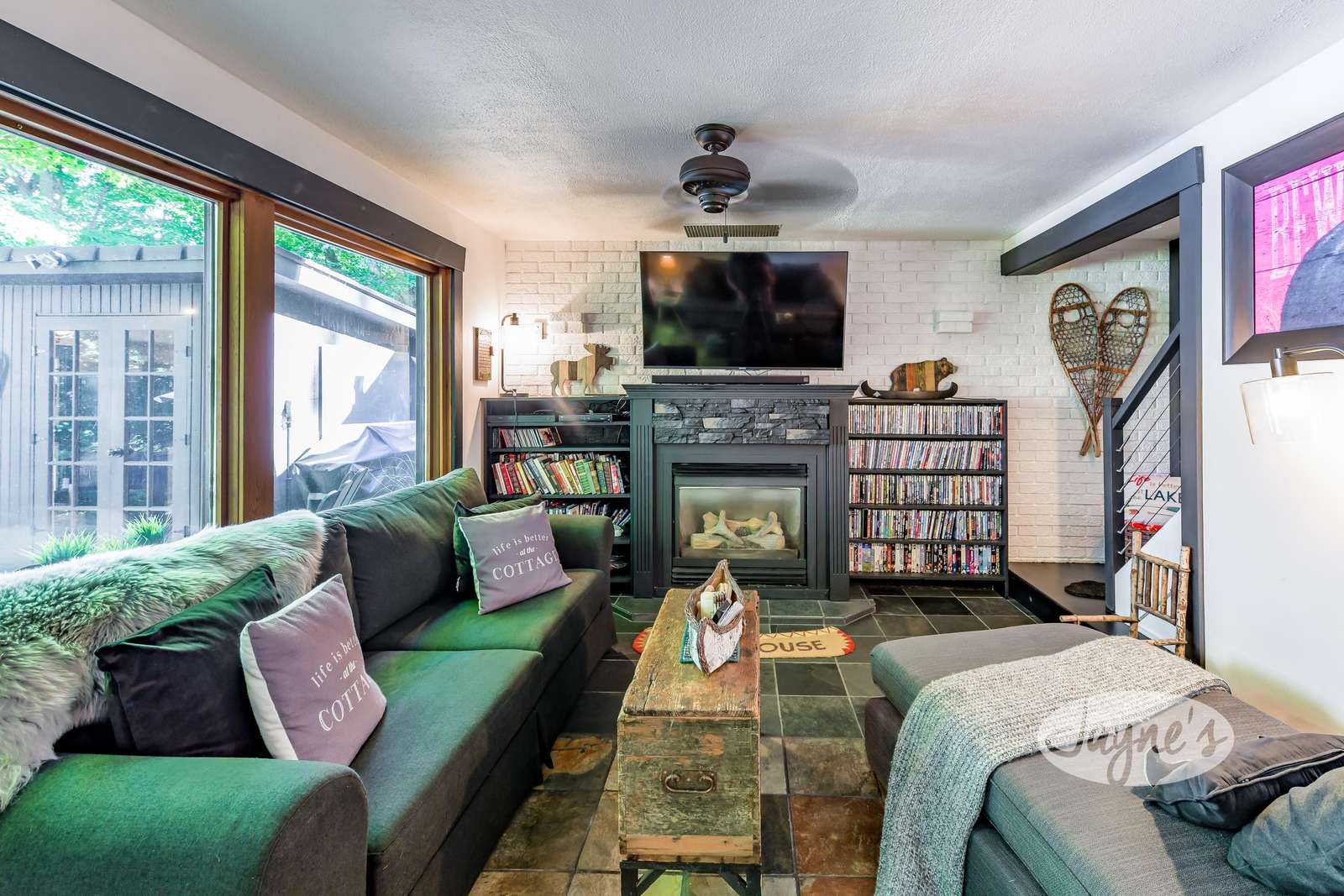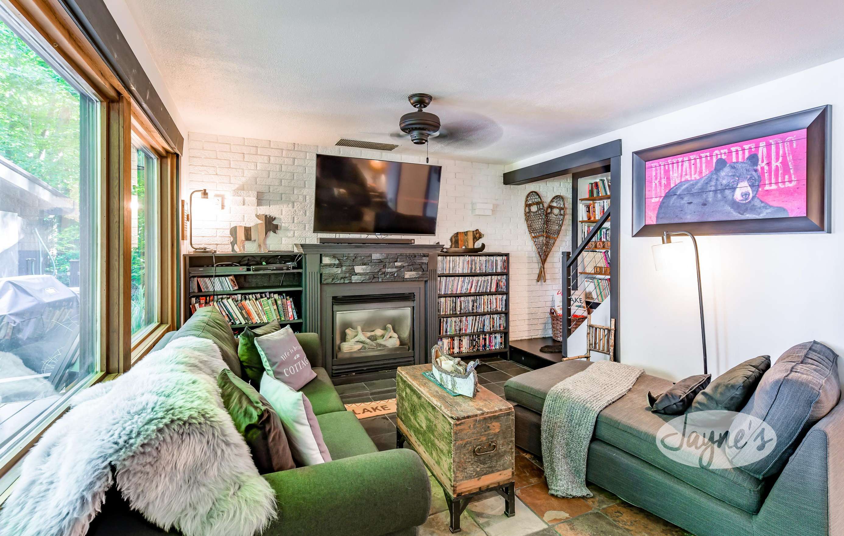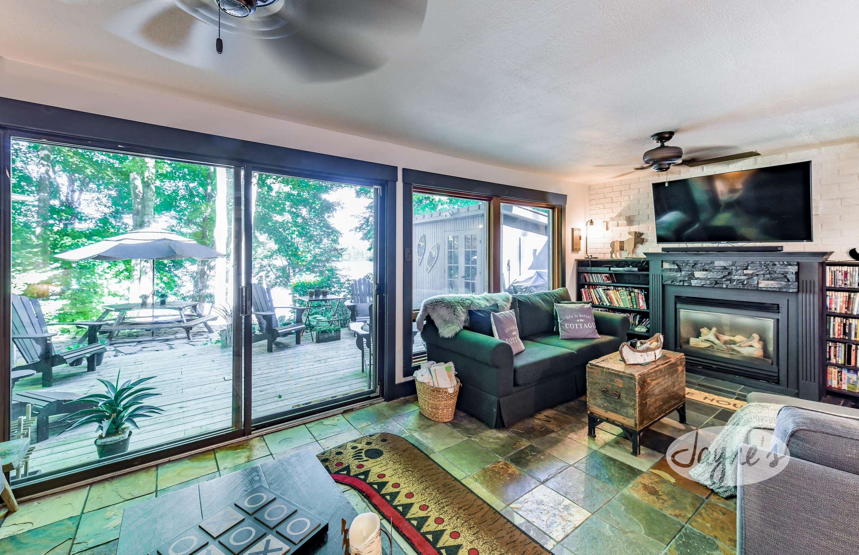 The lower level of this cottage has it all! With a sofa, love seat, gas fireplace, and plenty of board games, books and movies the guest can choose from! Walkout to outdoor patio and lake.