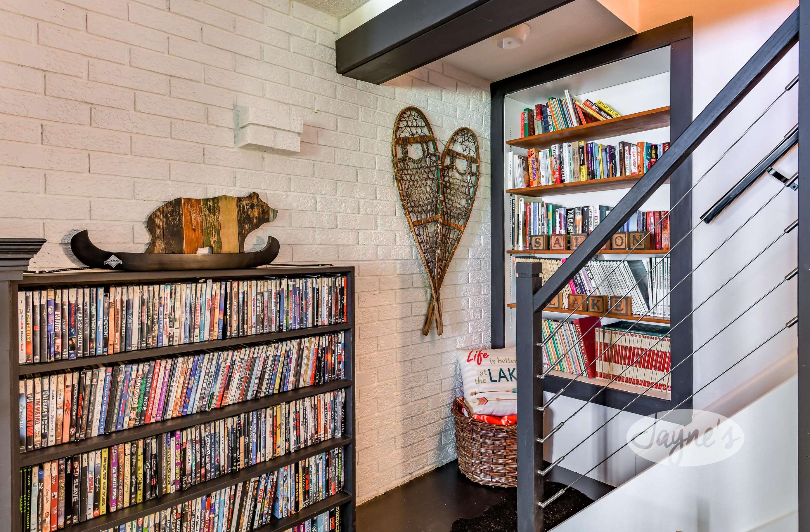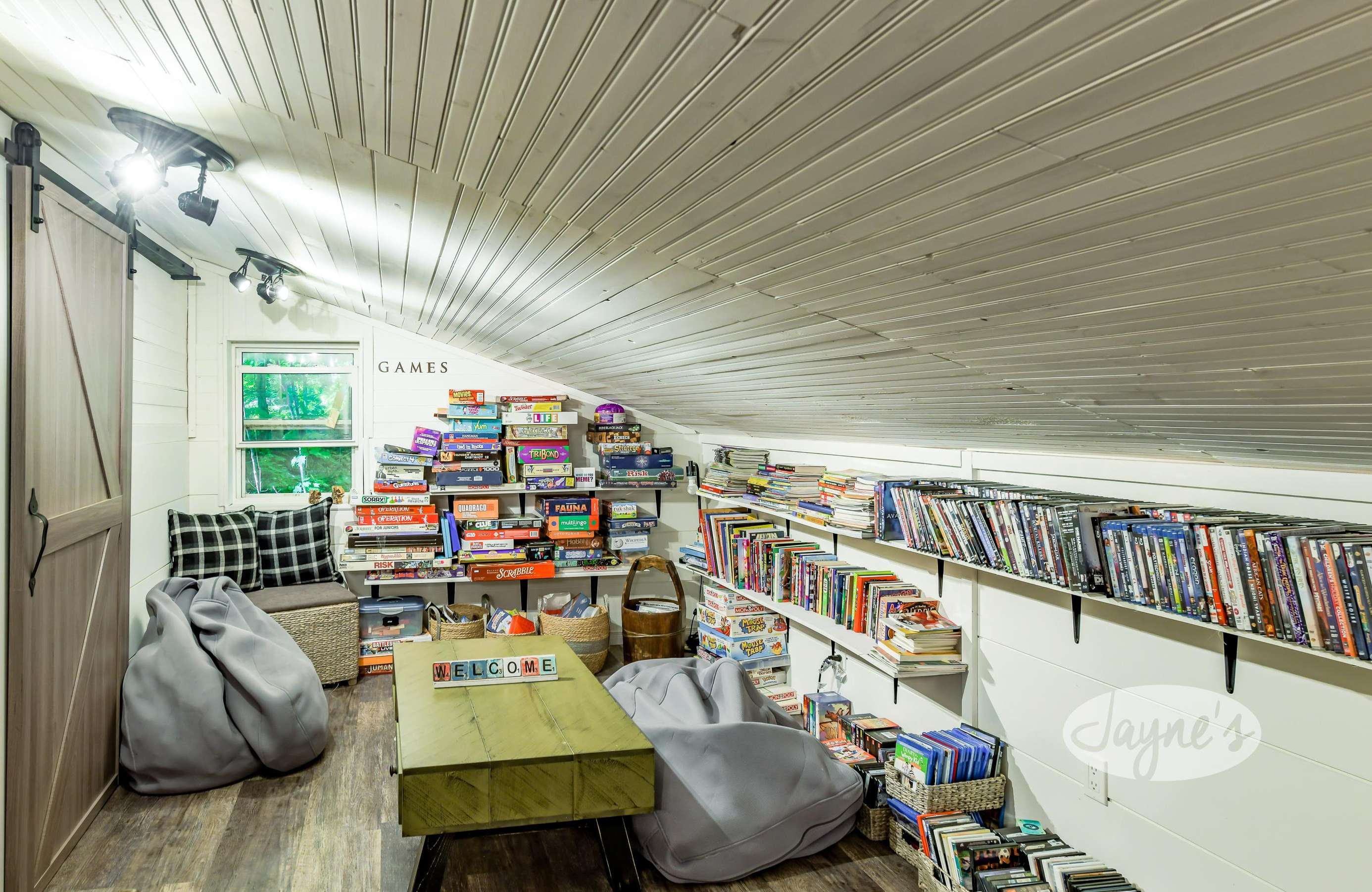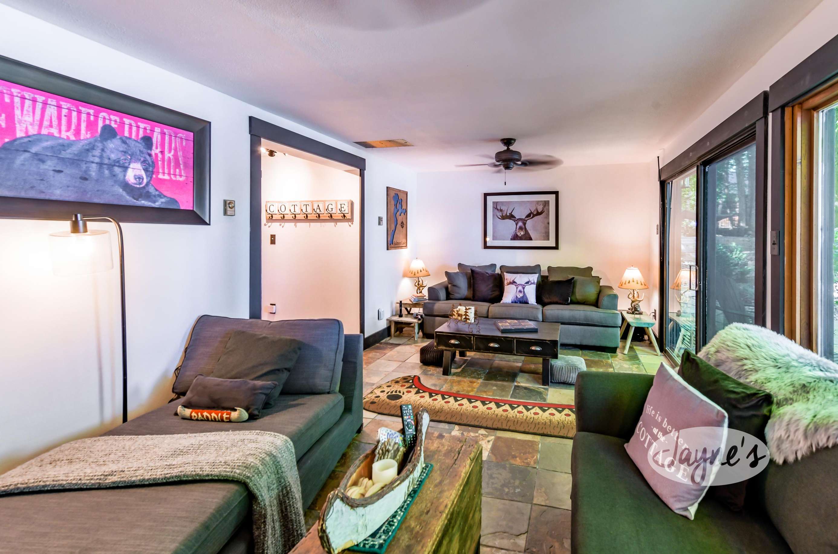 The lower level of this cottage has it all! With a sofa, love seat, gas fireplace, and plenty of board games, books and movies the guest can choose from! Walkout to outdoor patio and lake.