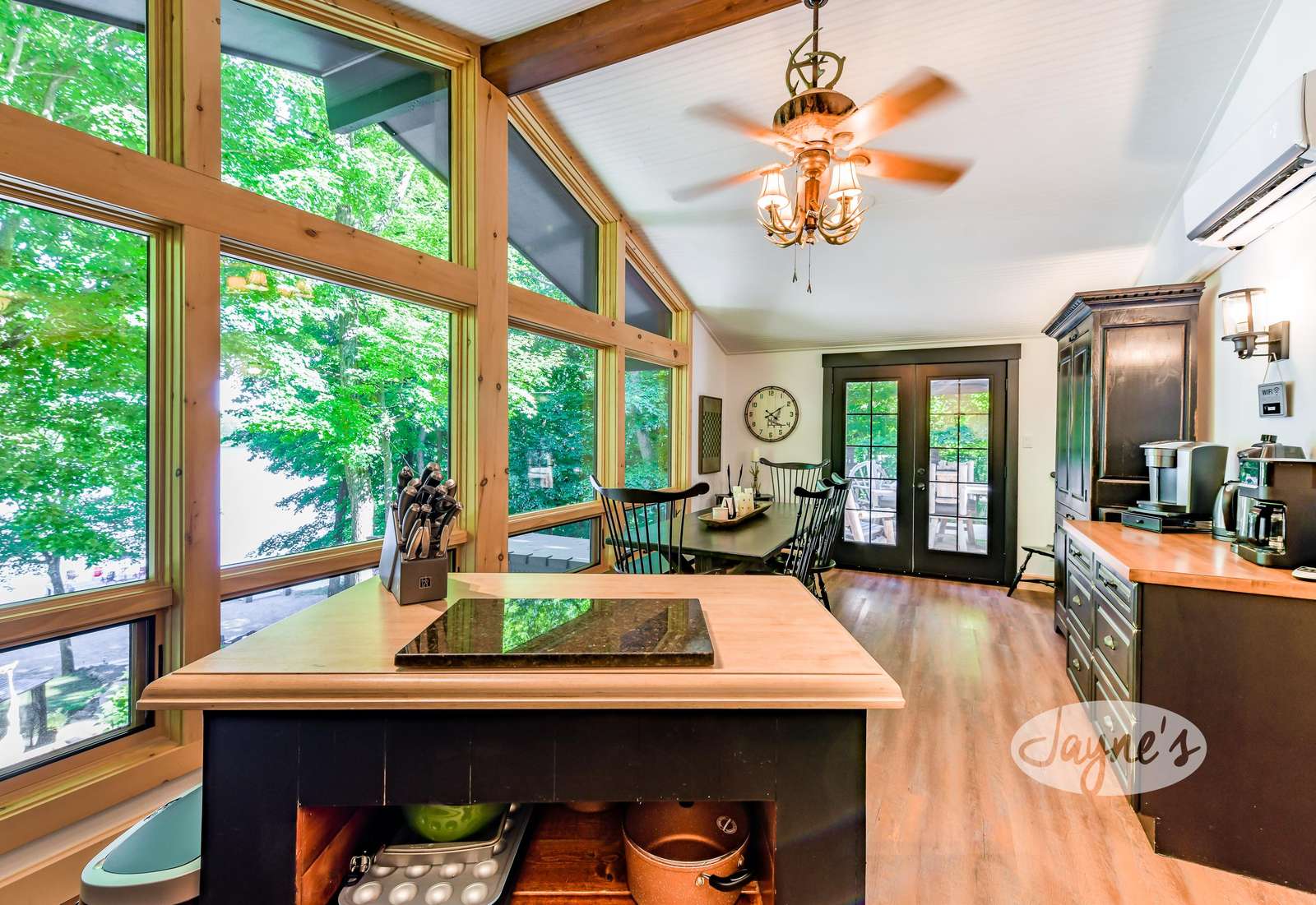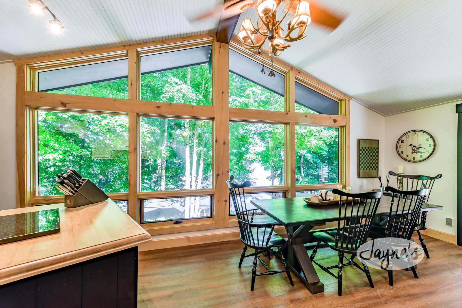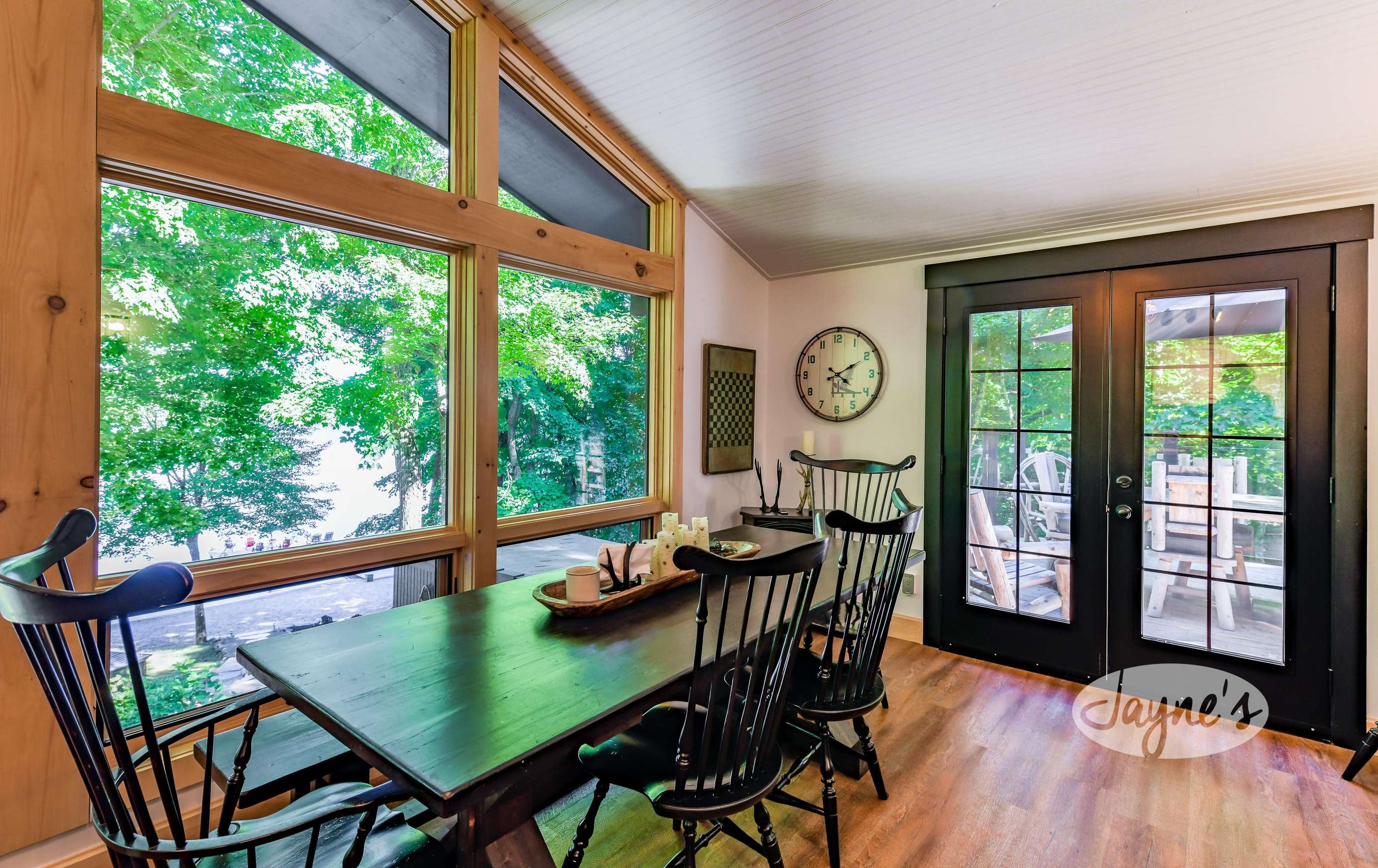 The open-concept dining room provides seating for 6, with lakeview and walkout to outdoor deck