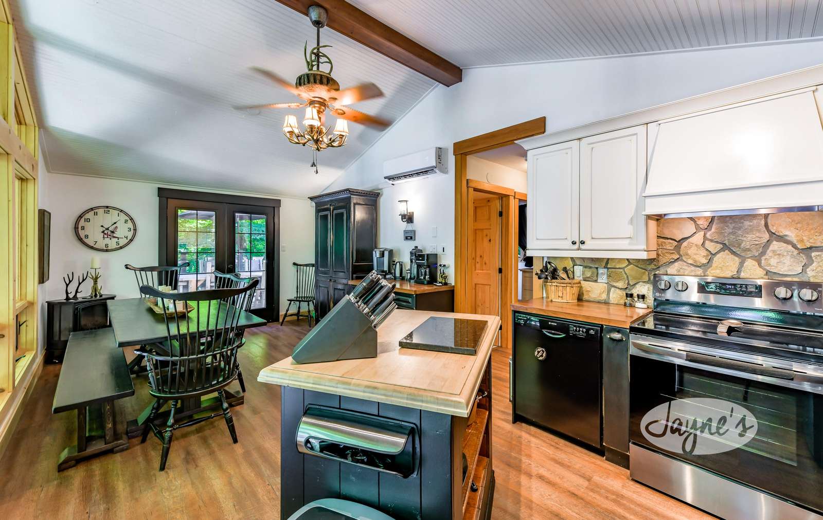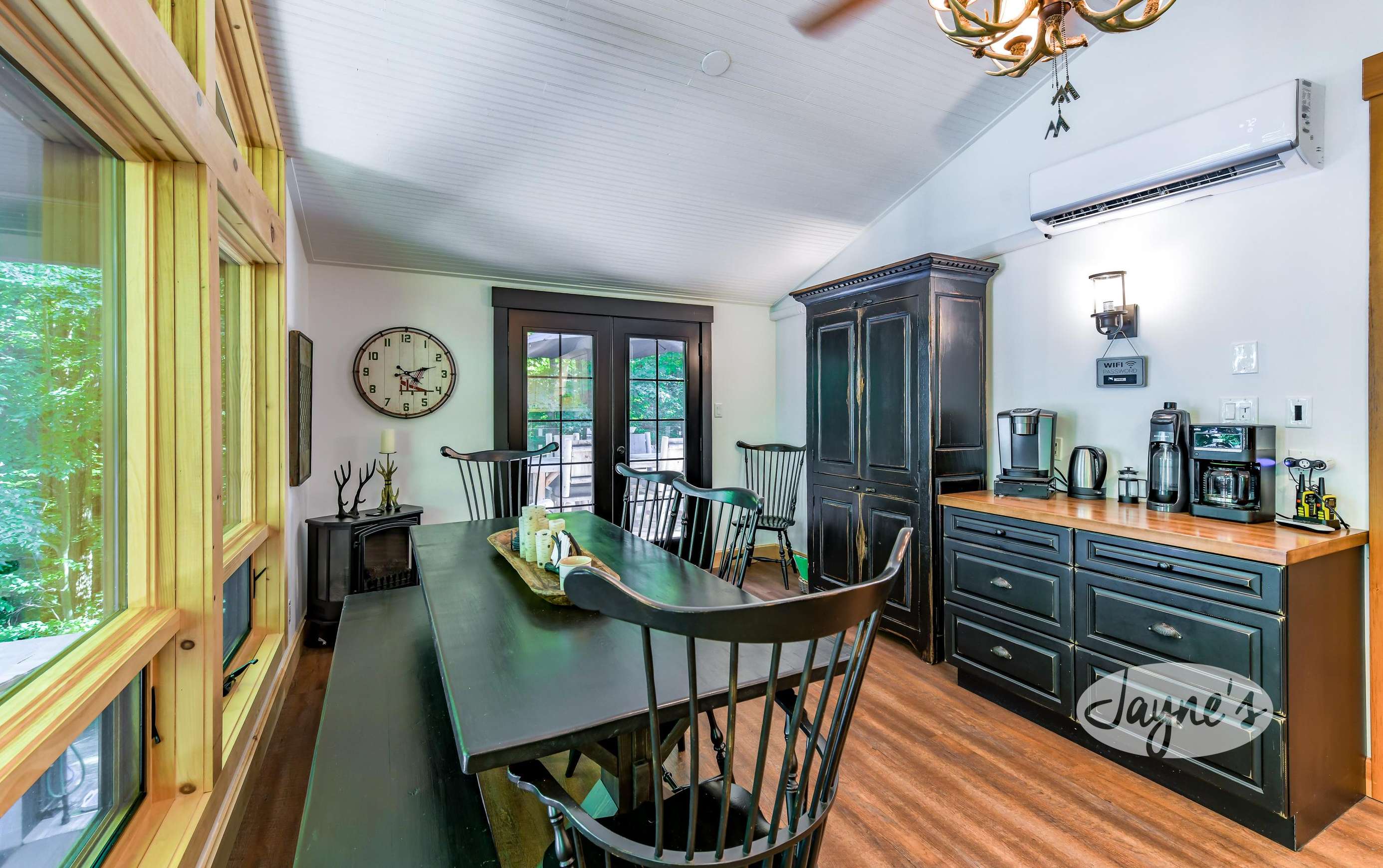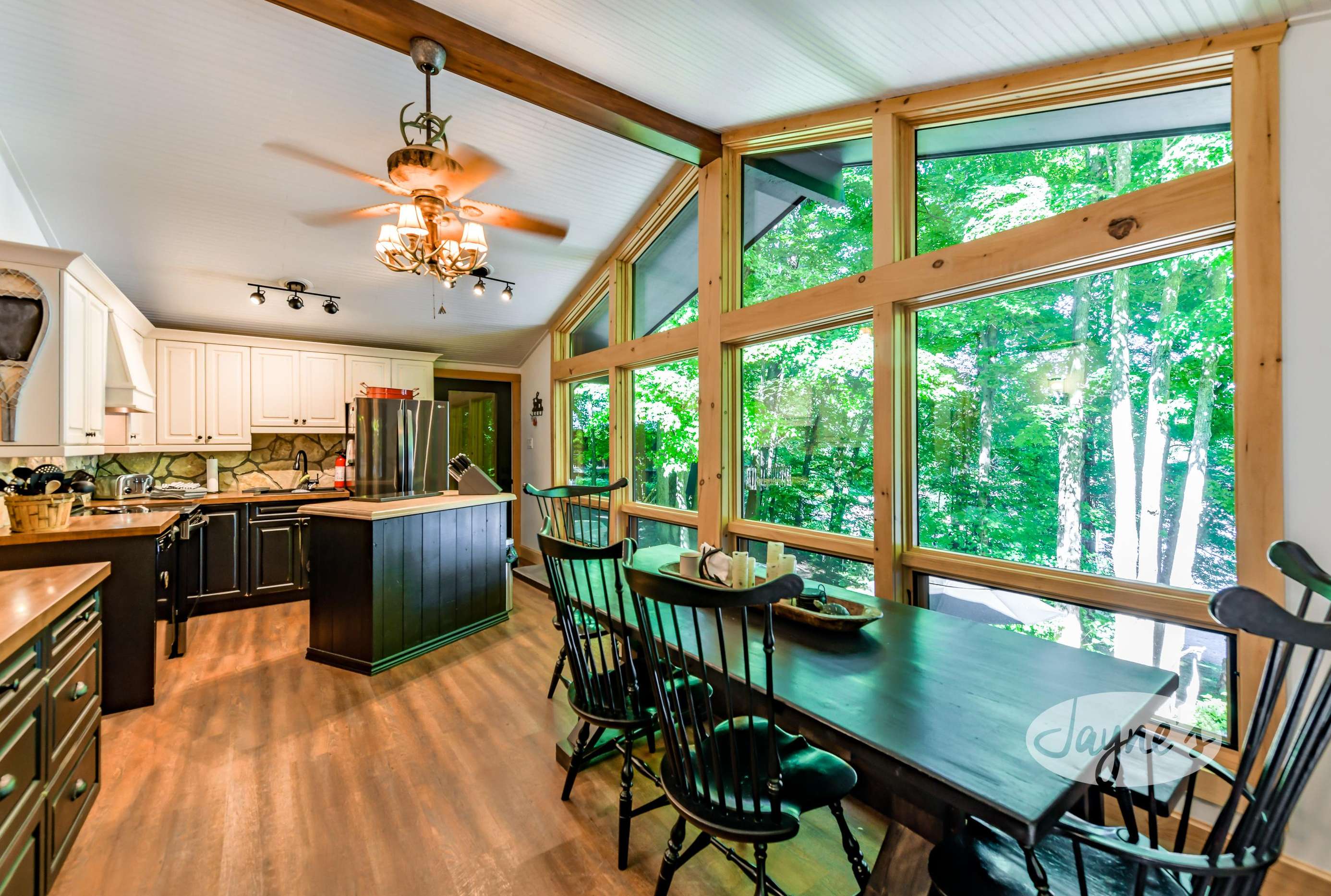The open-concept dining room provides seating for 6, with lakeview and walkout to outdoor deck