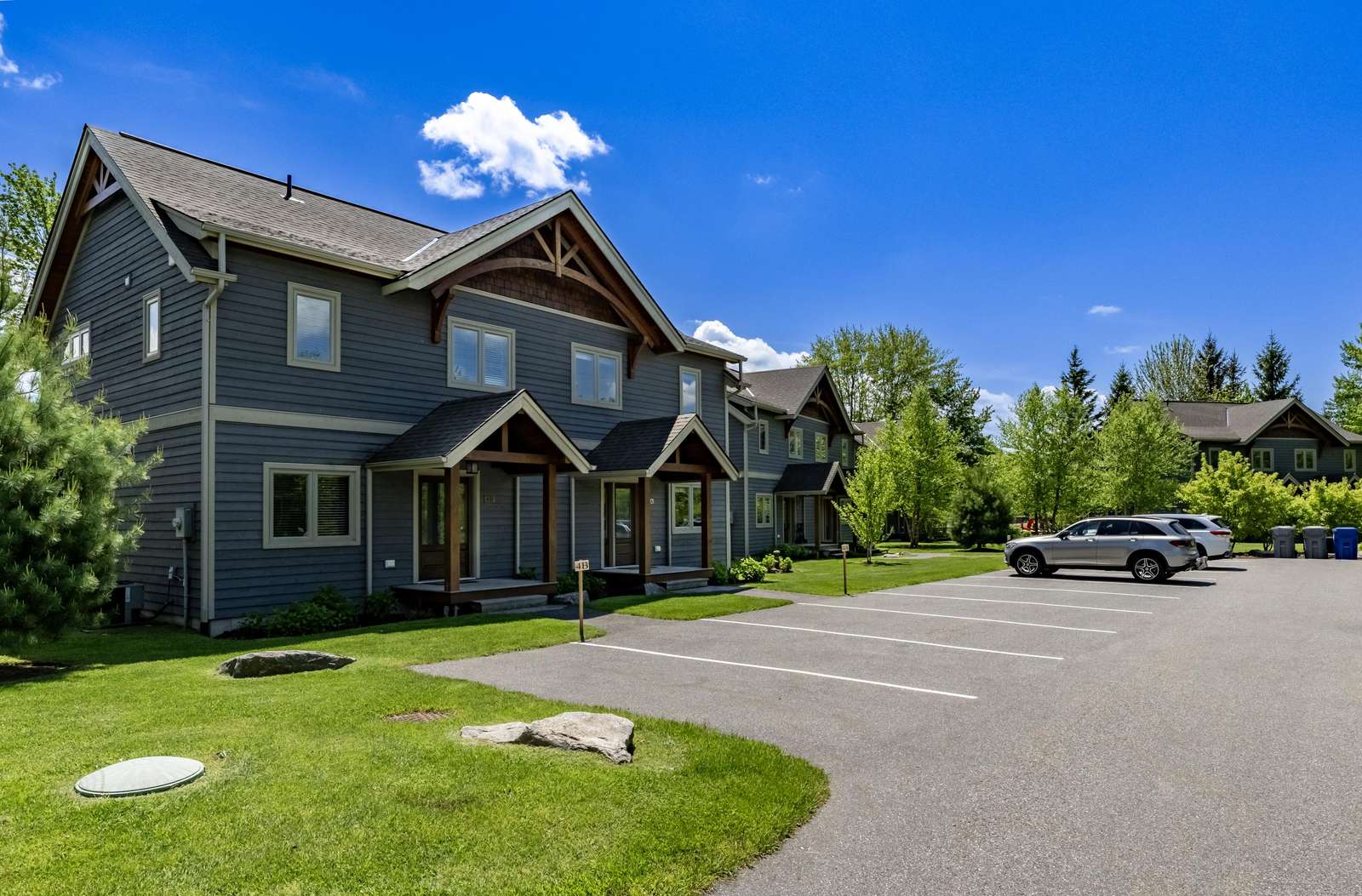 Villa 7B Large shared waterfront resort with a large dock, water bouncer. Each unit has it's own outdoor seating area to enjoy a sunset or some quiet activities on the deck or patio. Landscaped lawn with three shared fire pits to relax and enjoy the views of Lake Muskoka. Equipped with a pickleball /basketball court, horseshoes and many other family activities. There is also a clubhouse with games for everyone to enjoy.