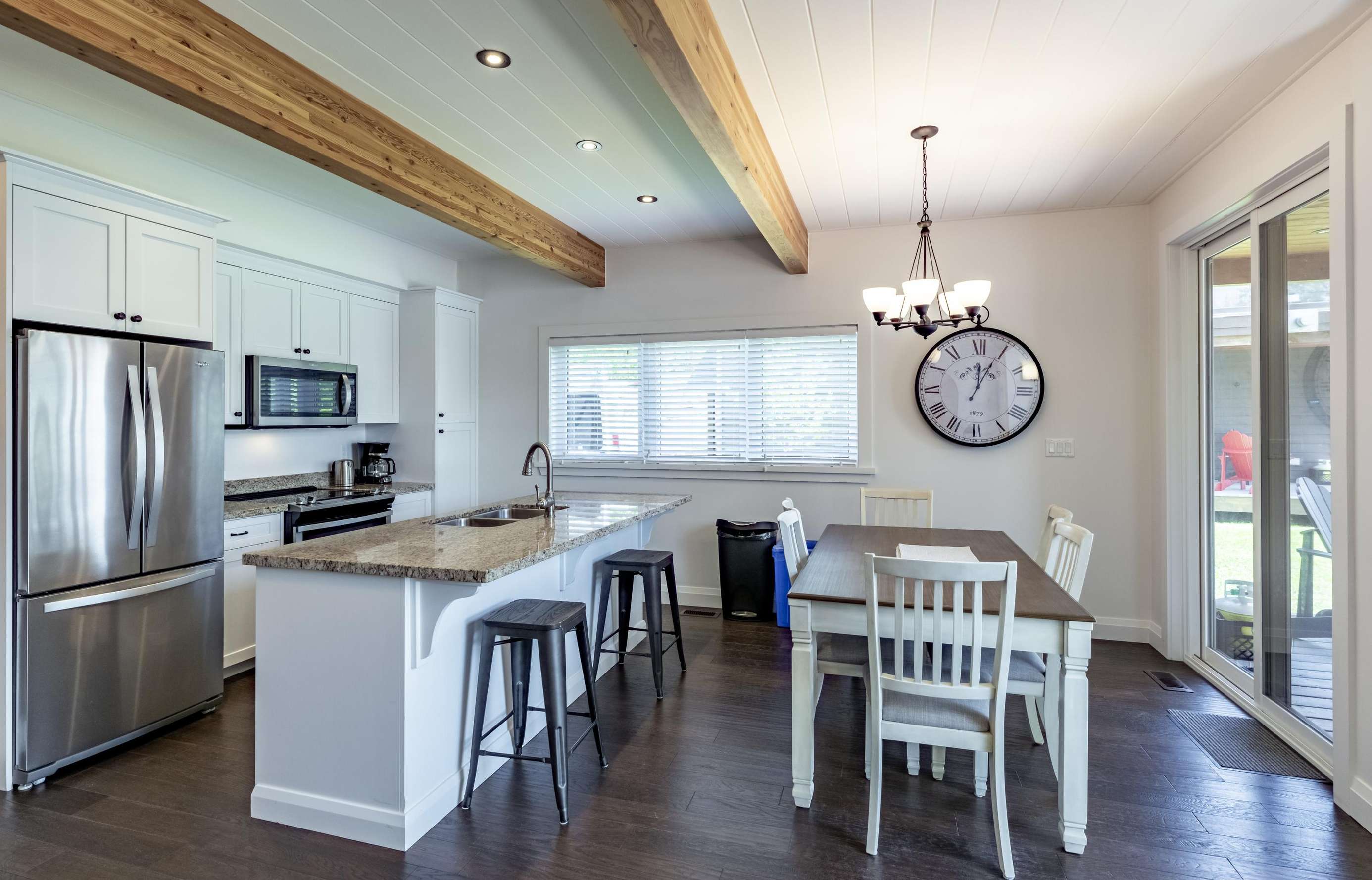 Open concept dining with seating for 7 and a walkout to the patio