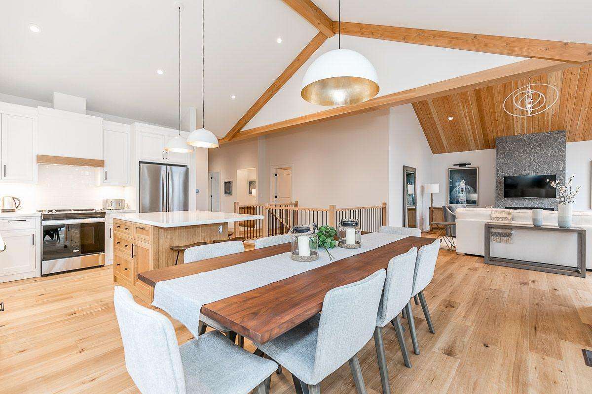 Open concept dining with seating for 8 and a walkout to the patio