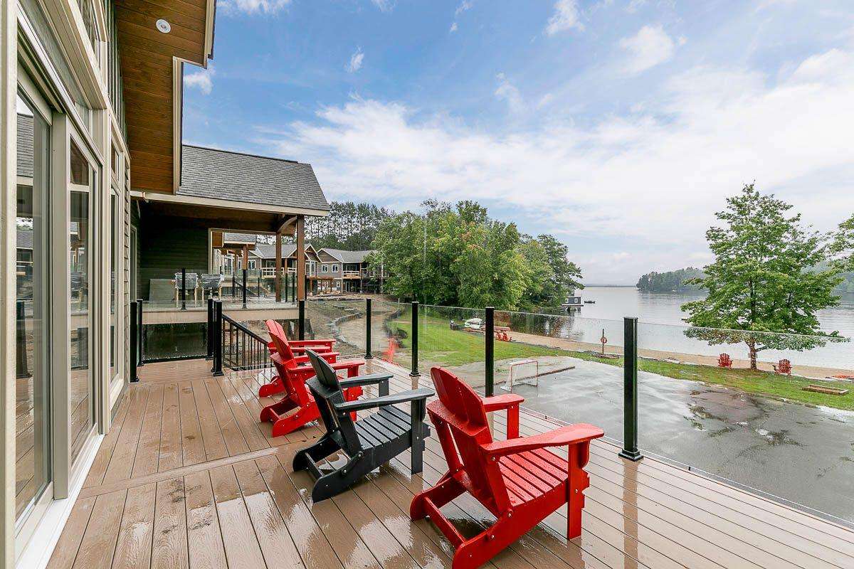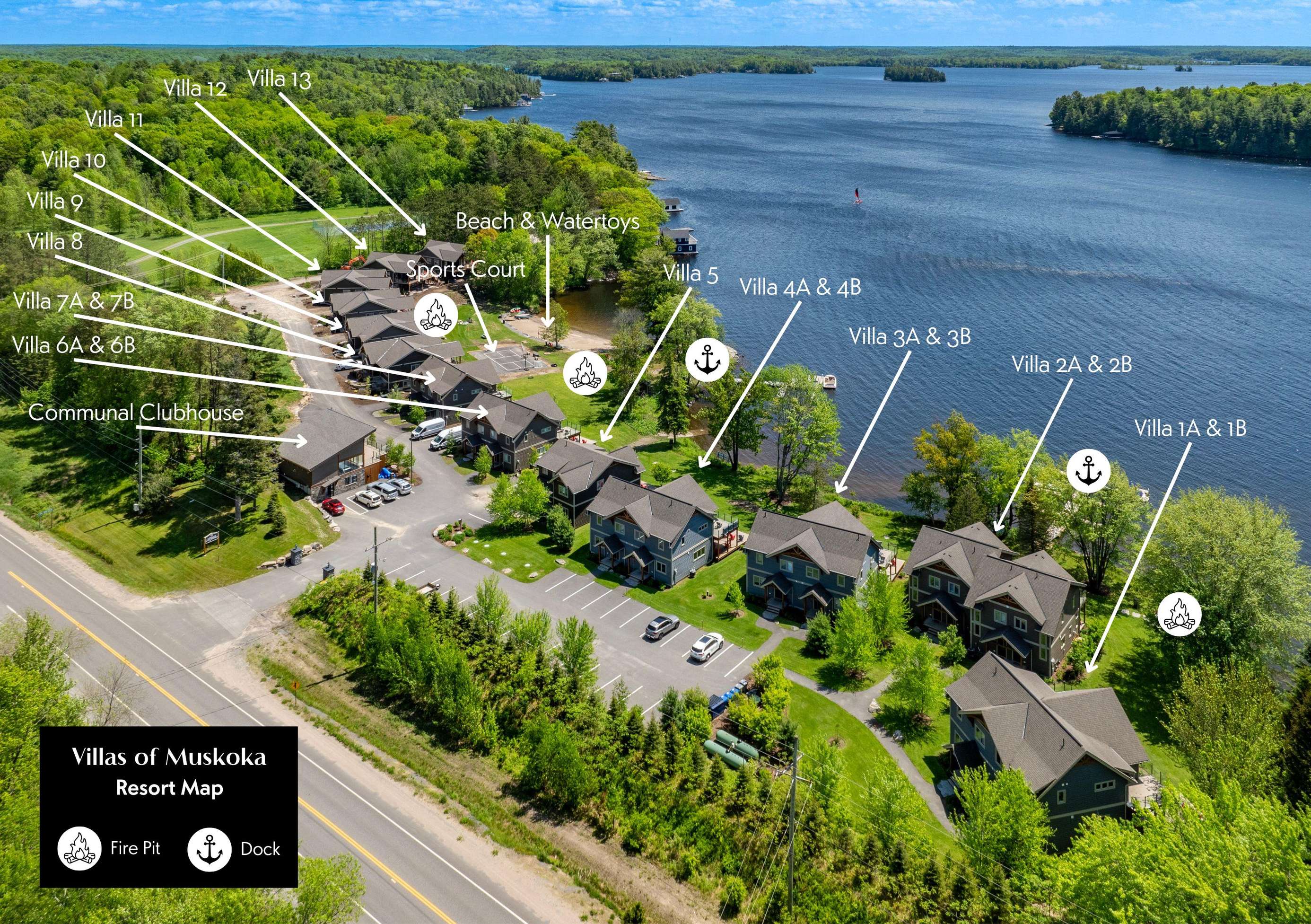 VIlla 8 Large shared waterfront resort with a large dock, water bouncer. Enjoy sunsets or quiet relaxation from your own balcony or patio. Landscaped lawn with three shared fire pits to relax and enjoy the views of Lake Muskoka. Equipped with a pickleball /basketball court, horseshoes and many other family activities. There is also a clubhouse with games for everyone to enjoy.
