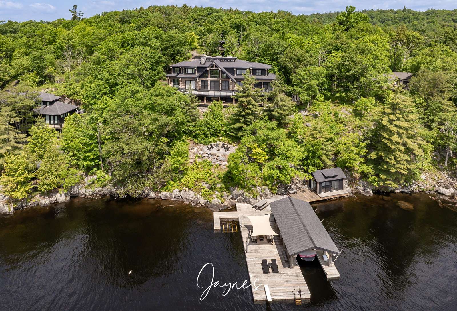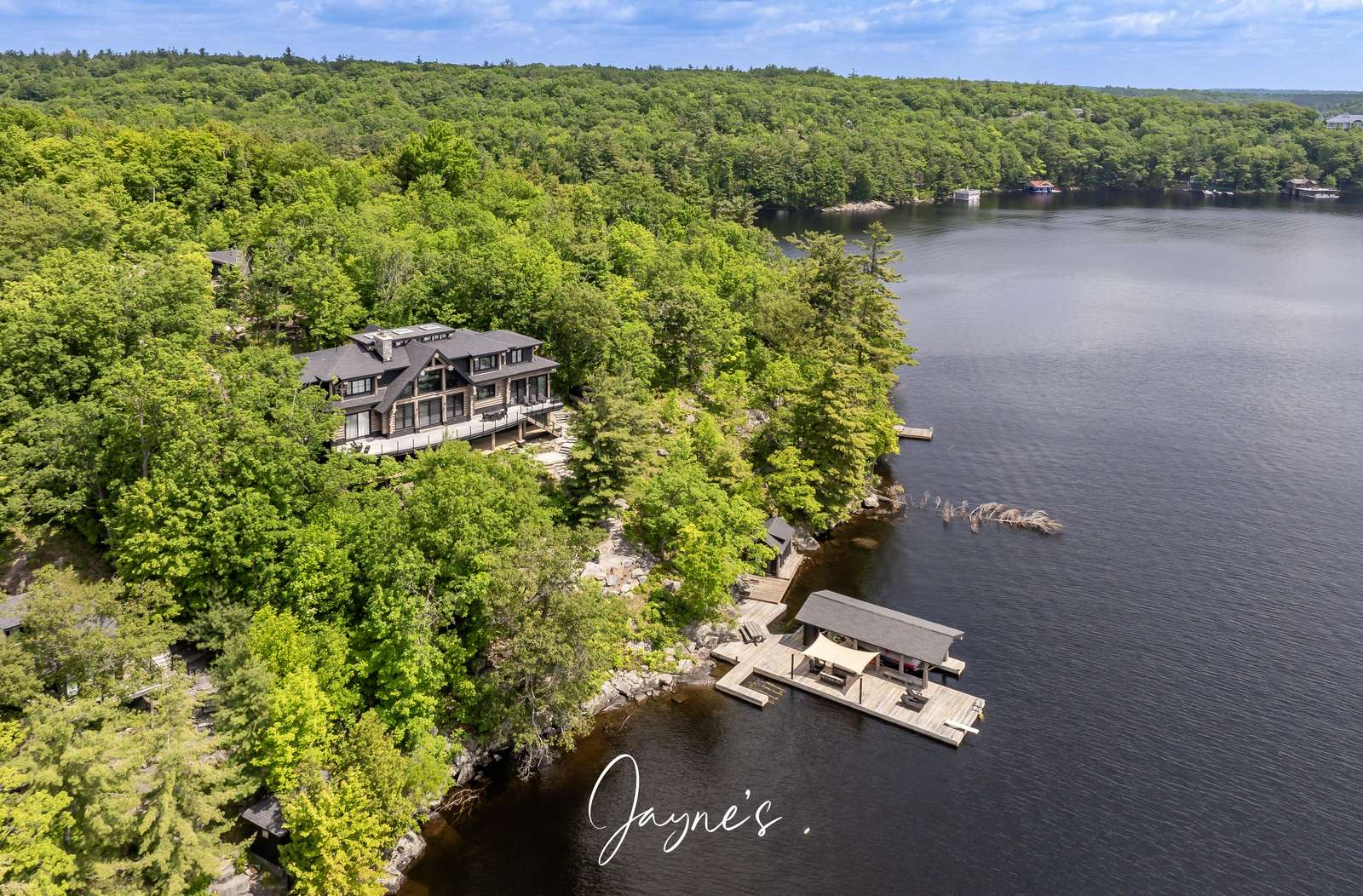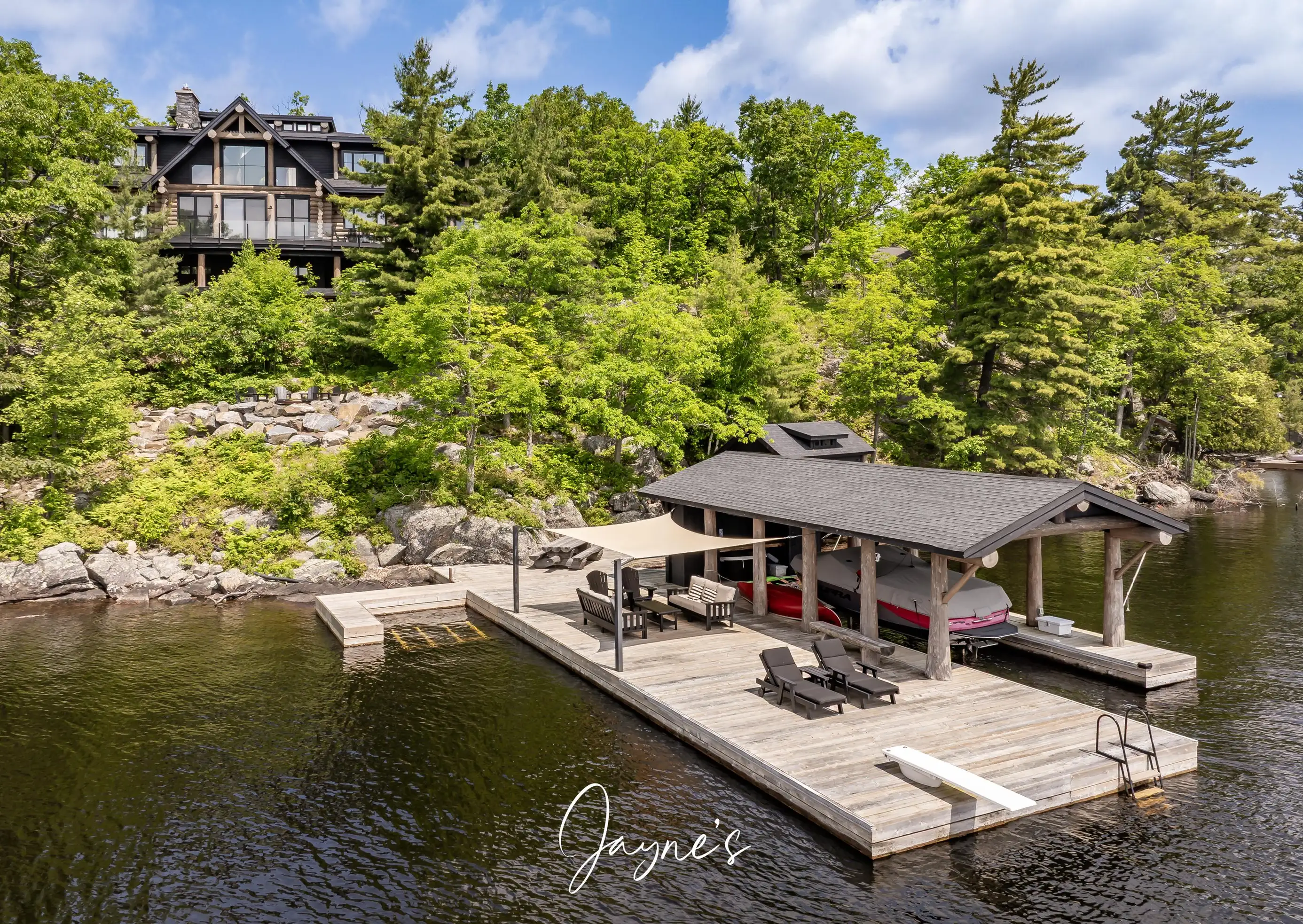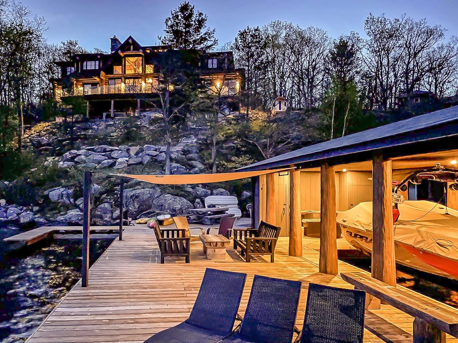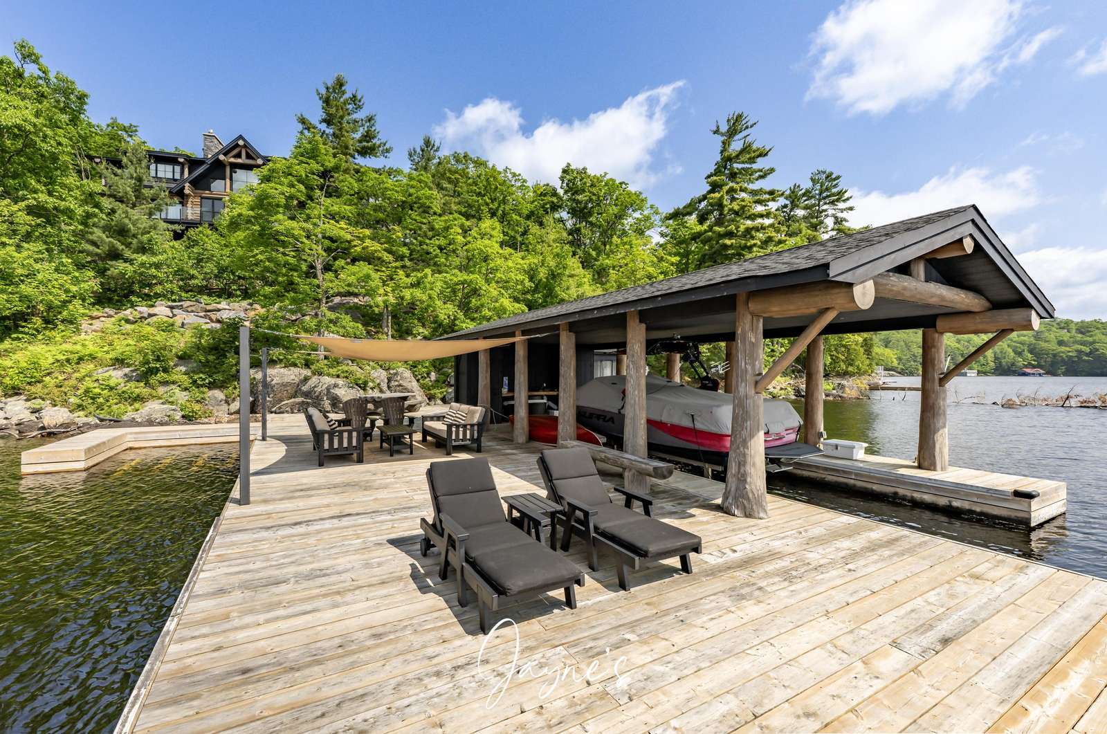 WYLDEWOOD LODGE - A circular driveway leads to the loft above the garage with 2 bedrooms and 1 bathroom, and then further down to the main cottage. Stunning views on Lake Muskoka from the main decks or from the dock with boat-port at the private waterfront. The waterfront also features the Cabana with powder-room and kitchenette. Enjoy all day-sun on the water and the sunset at the landscaped fire pit, overlooking Lake Muskoka.