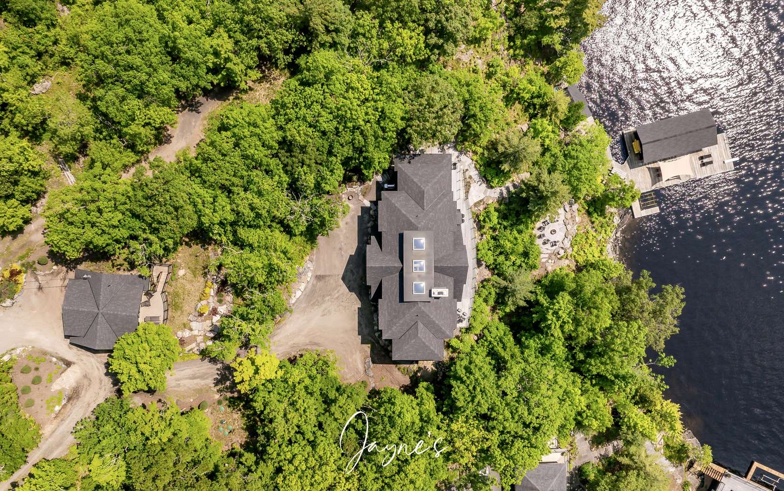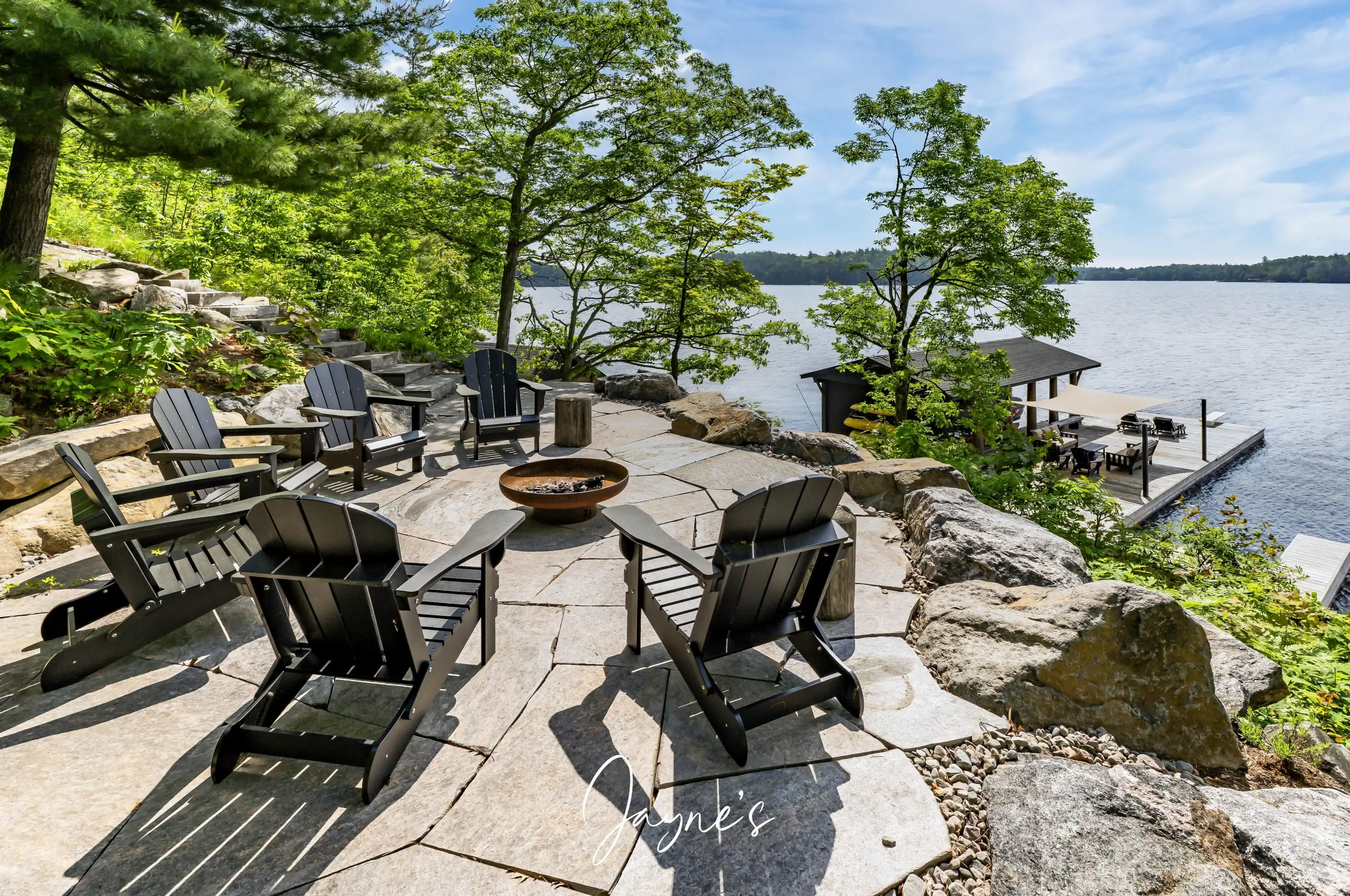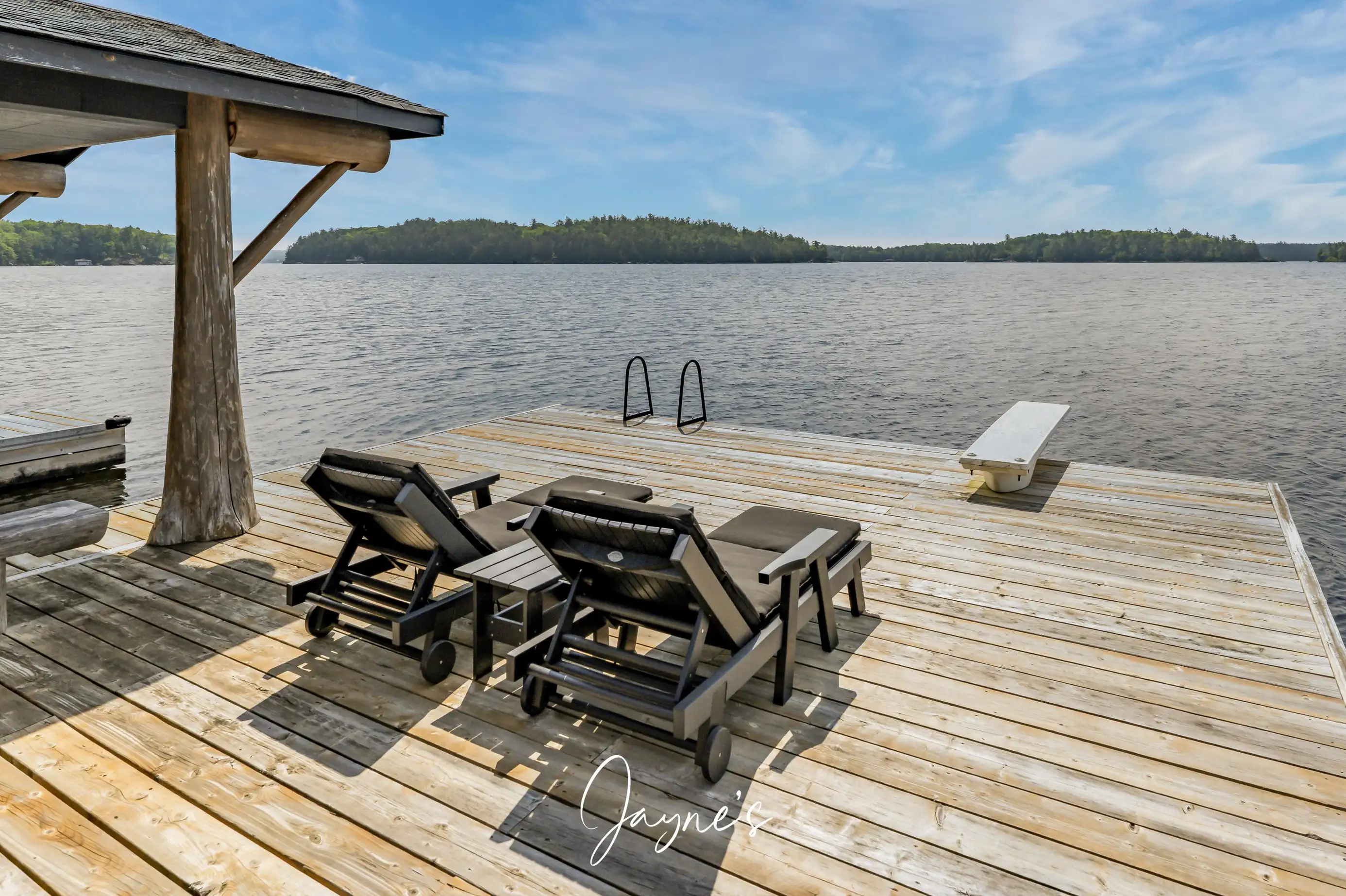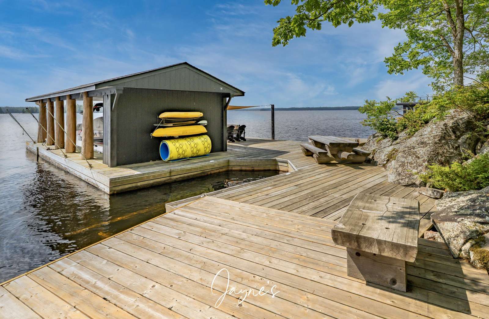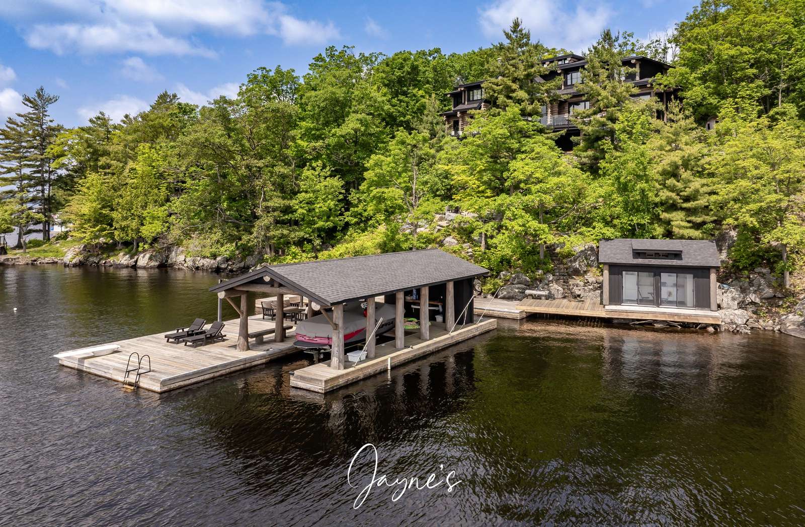 WYLDEWOOD LODGE - A circular driveway leads to the loft above the garage with 2 bedrooms and 1 bathroom, and then further down to the main cottage. Stunning views on Lake Muskoka from the main decks or from the dock with boat-port at the private waterfront. The waterfront also features the Cabana with powder-room and kitchenette. Enjoy all day-sun on the water and the sunset at the landscaped fire pit, overlooking Lake Muskoka.