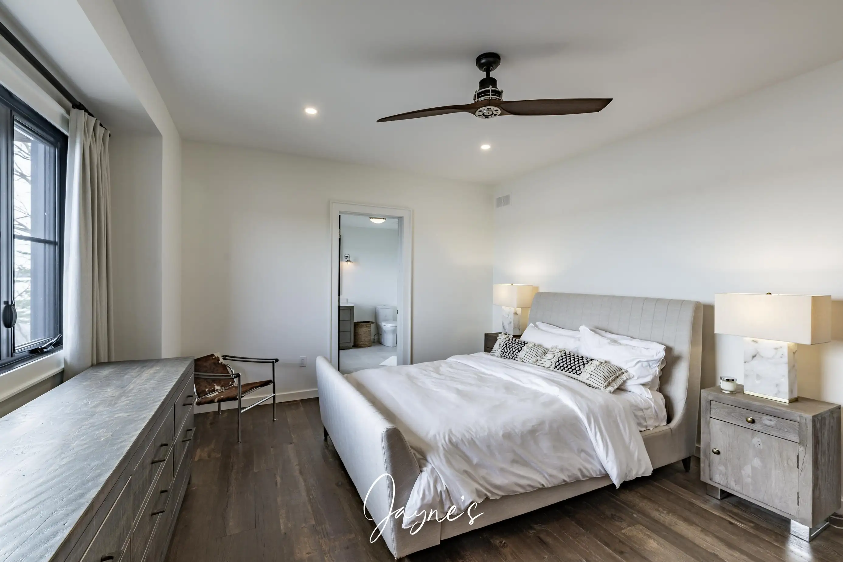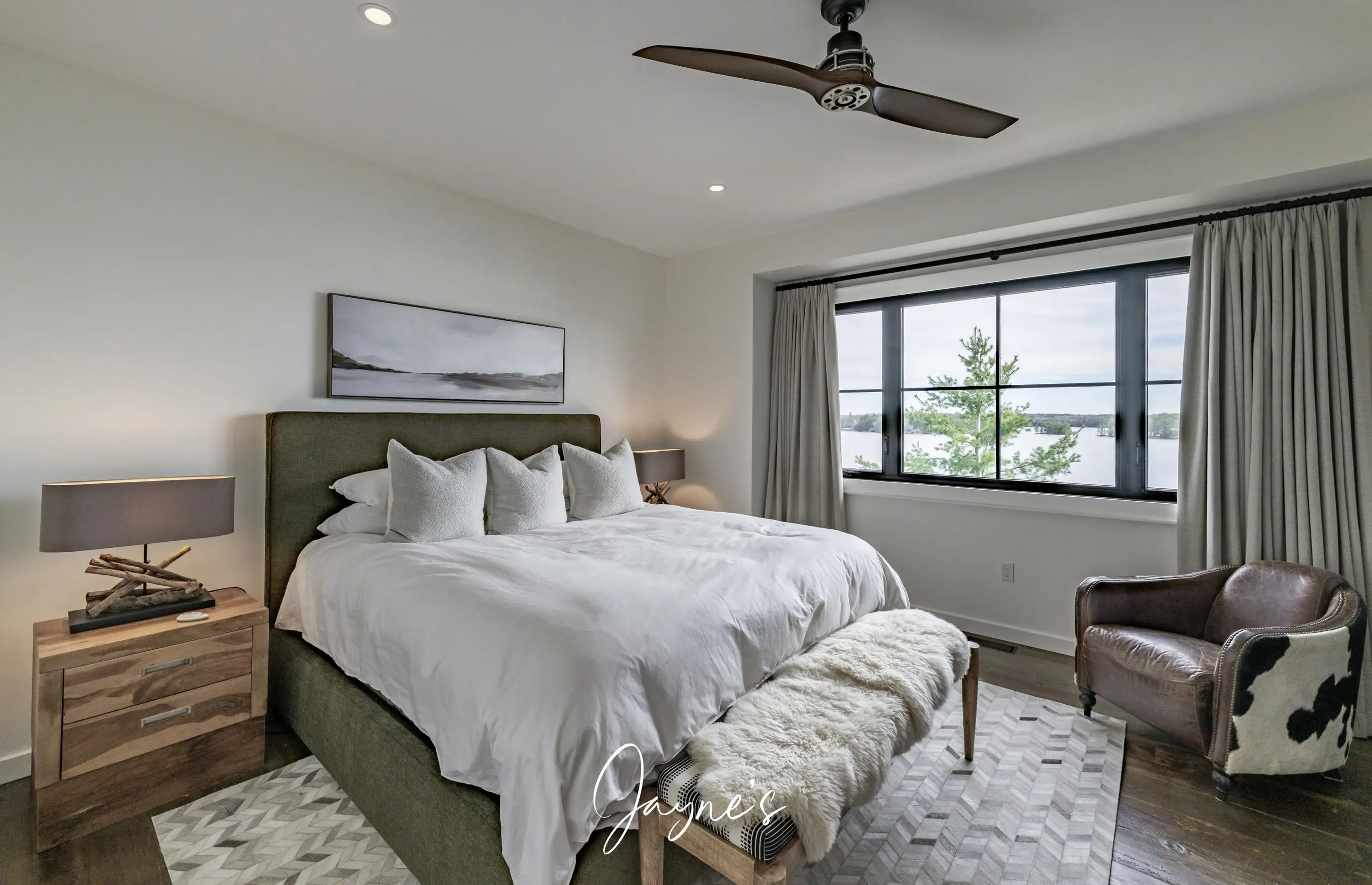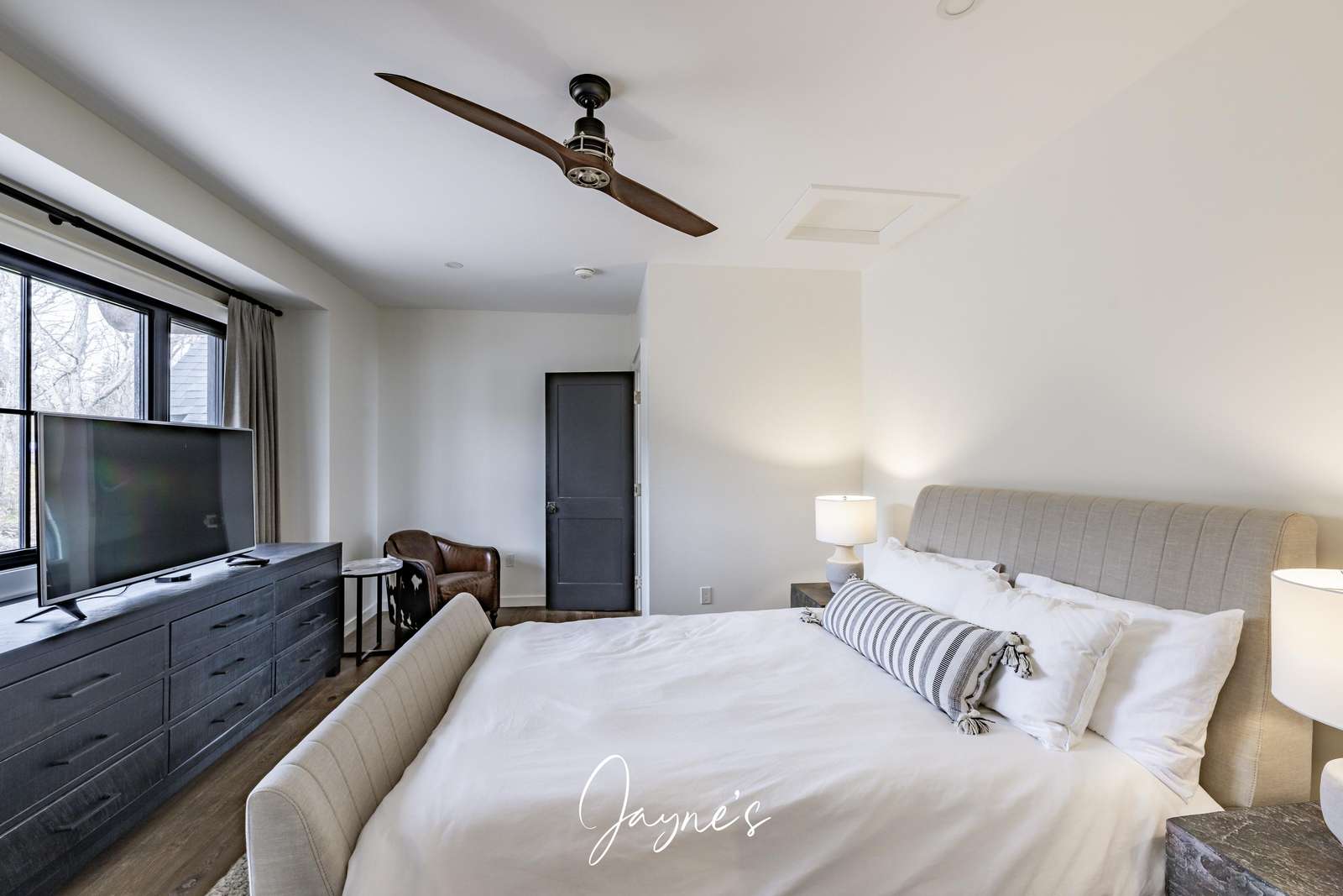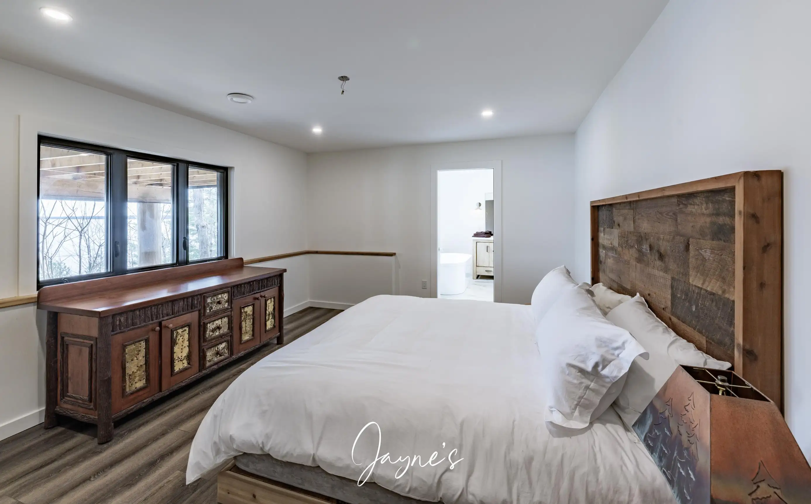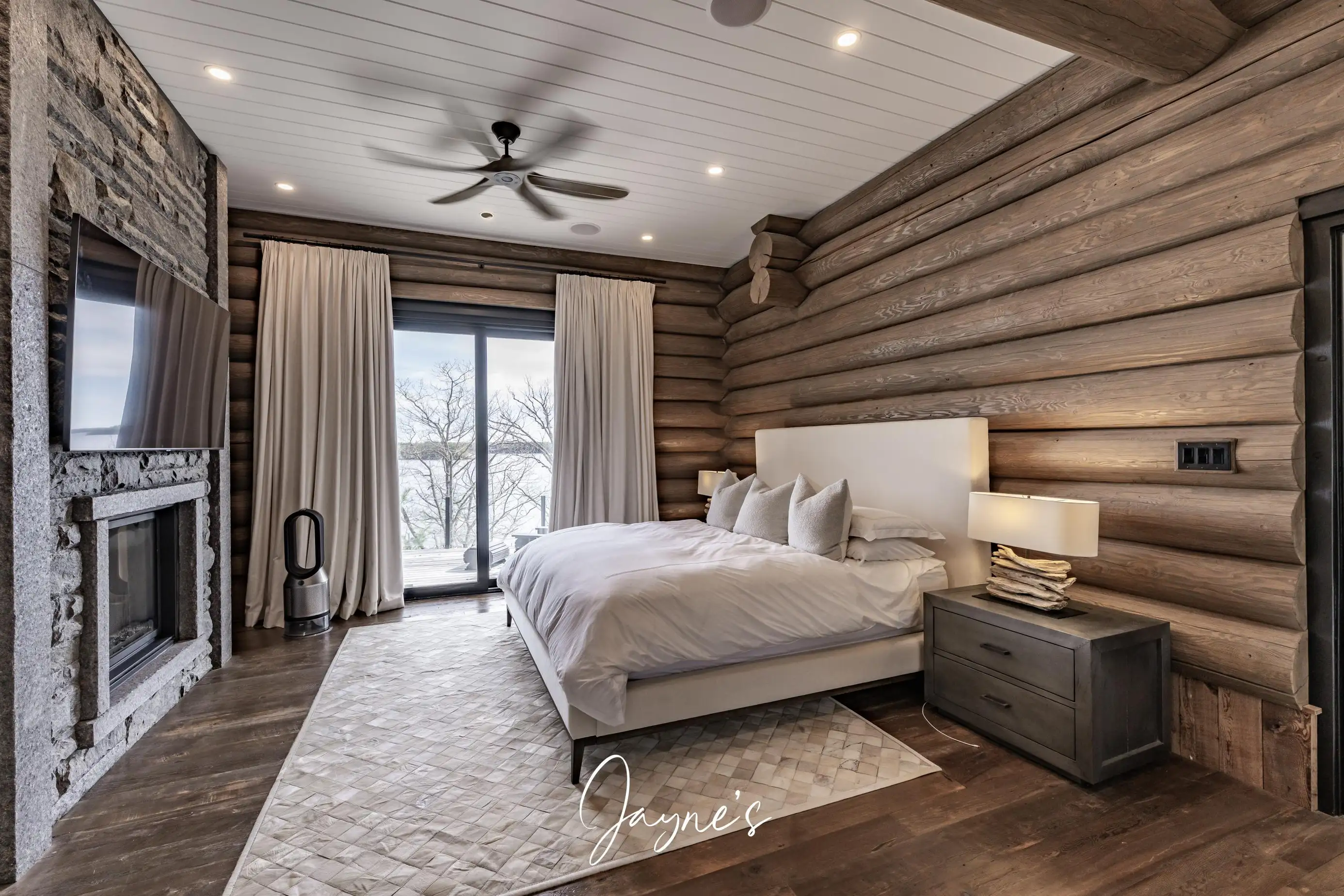Bedroom 1 - King (Primary) with ensuite, gas-burning fireplace, walkout to deck, walk-in closet