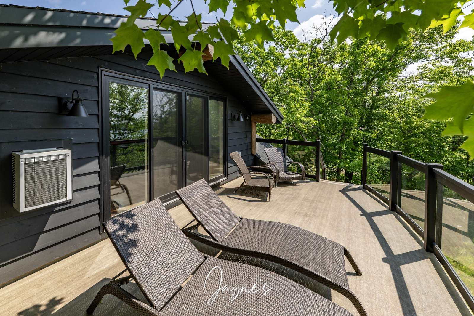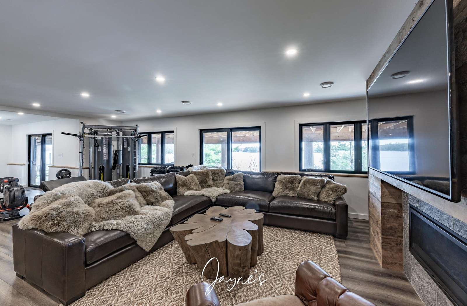 - 2 couches, coffee table in front of gas fireplace, walkout to deck.