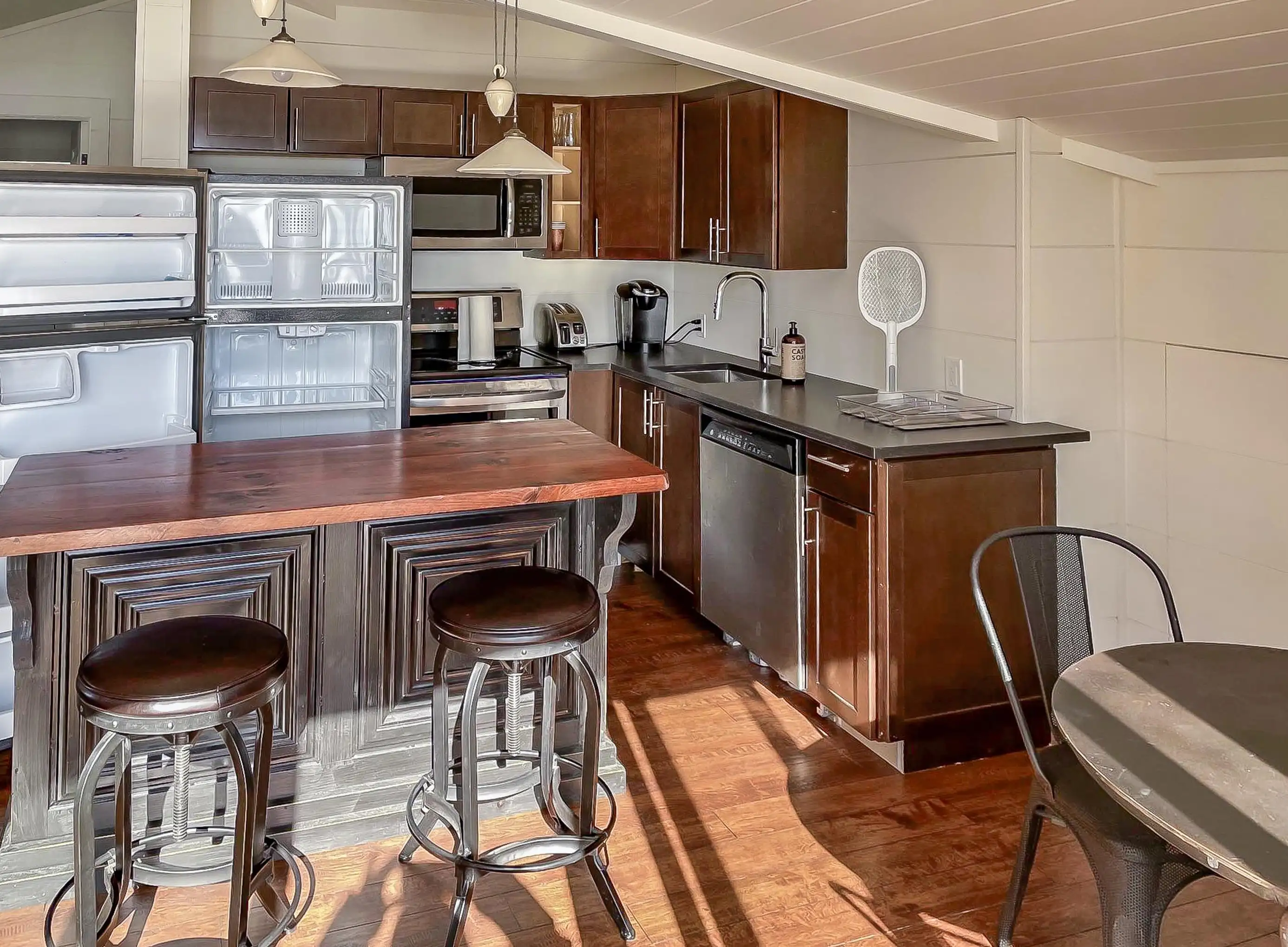 Full kitchen with fridge, stove, sink, dishwasher and microwave, small island with 2 stools.
