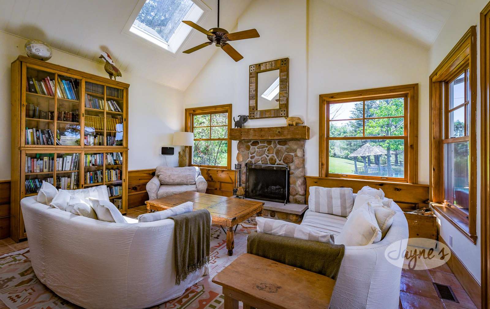 The Great Room features a charming wood-burning stone fireplace and an abundance of cozy seating. Double glass doors lead guests outside to the oversized deck, which is equipped with dining for 10, plenty of outdoor furniture, a Weber propane BBQ and a Green Egg BBQ.