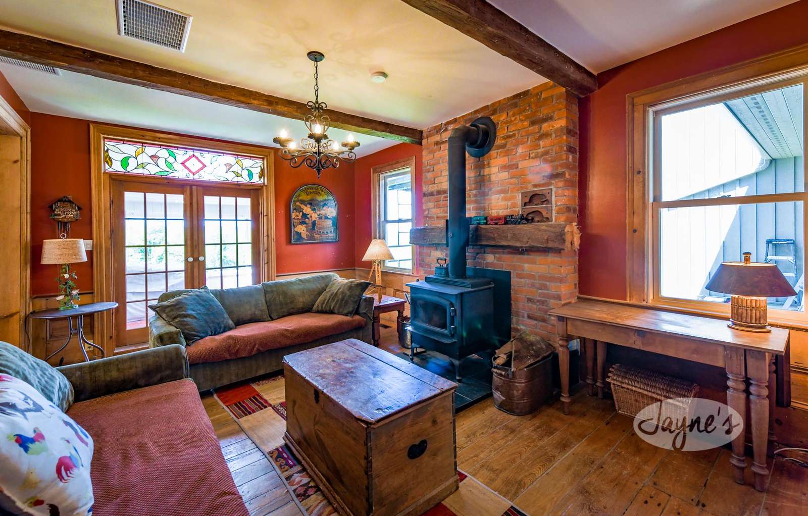 Also located off the kitchen is a separate TV room which offers cozy couches, a wood-burning stove, a desk area and glass doors leading to the 3-season sunroom.