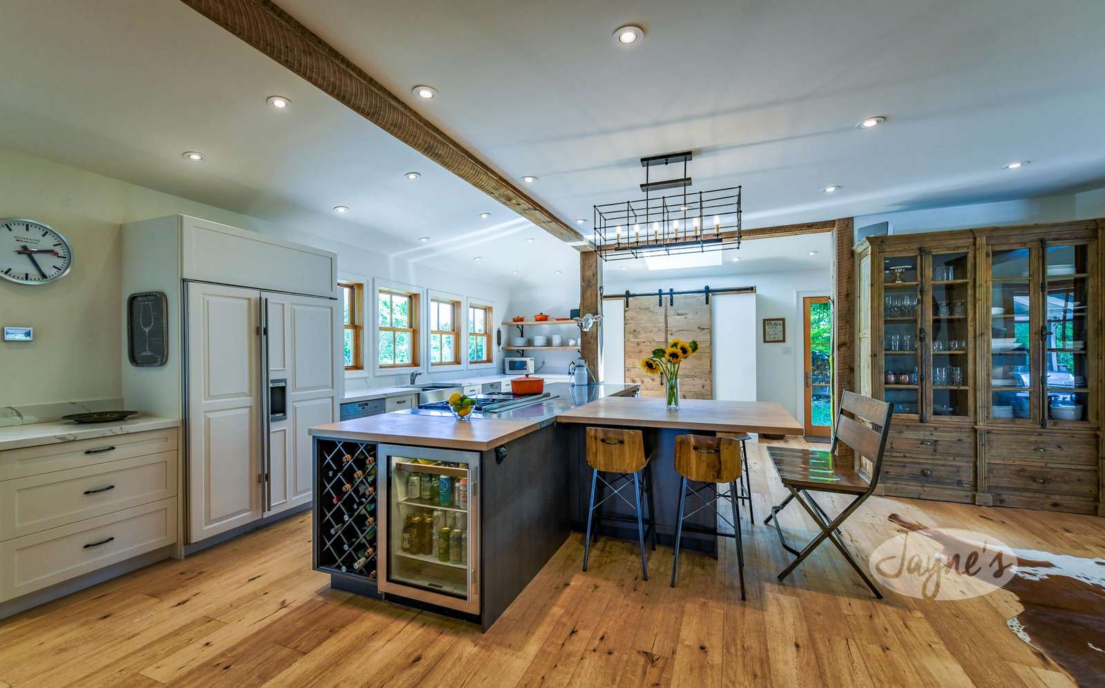 Entirely separate from the original farmhouse, this newly built addition serves as the perfect guest or nanny suite! Featuring an open-concept, fully equipped kitchen with fridge, dishwasher, cooktop, island seating for 5 and an additional eating nook with built-in seating. Just beyond the kitchen is the living area which boasts several cozy couches, a TV and a wood-burning stove. Guests will also find two spacious bedrooms in the upper addition as well as a Jack-and-Jill bathroom that connects the two rooms. In-floor heating throughout!
