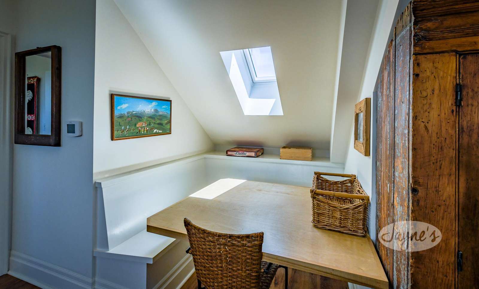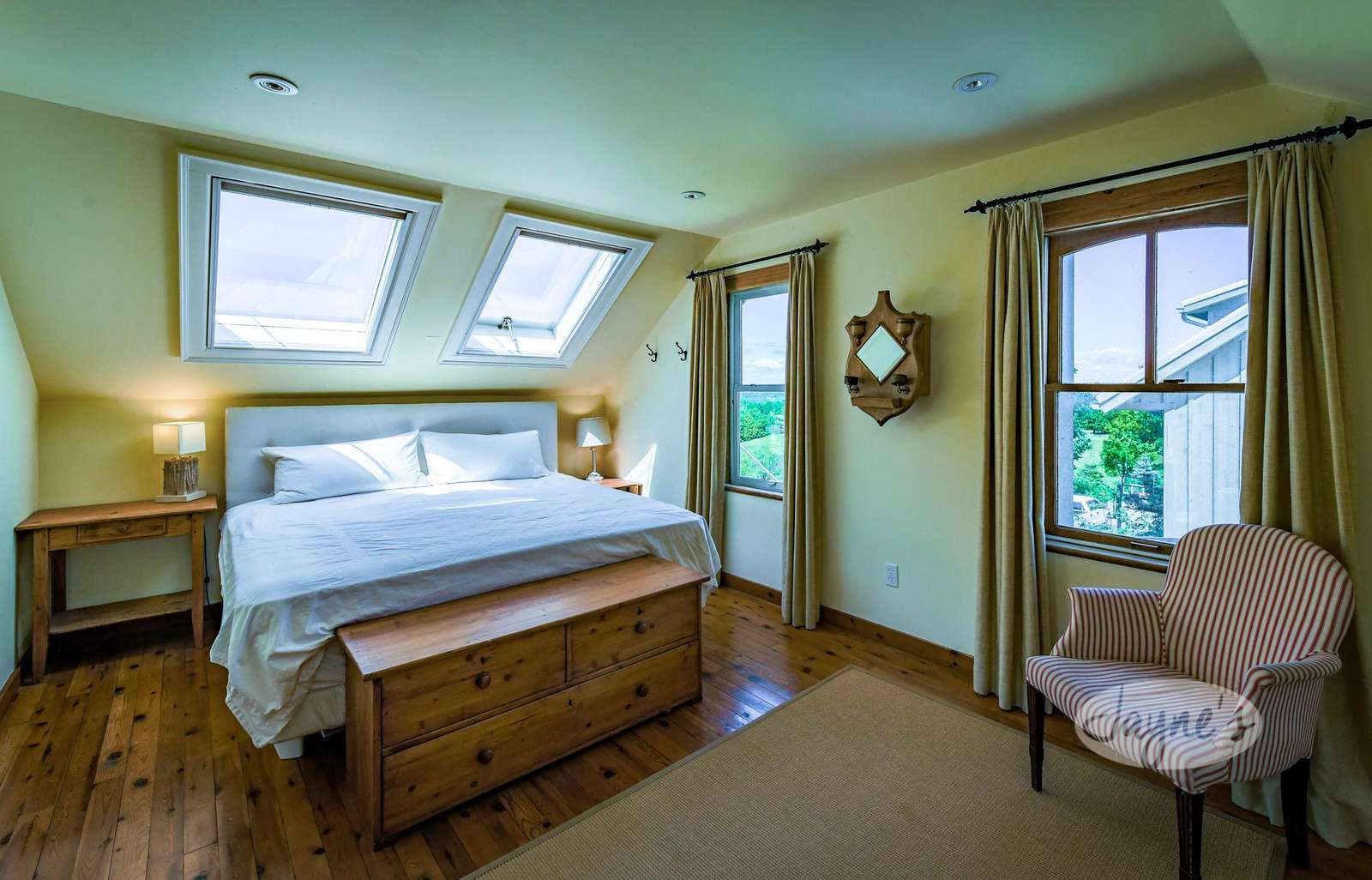Follow the winding staircase past the landing area to the three upstairs bedrooms. The first bedroom offers a King-sized bed, skylights and a sitting area; the second is equipped with a Queen bed and a built-in desk area, and the third features twin bunk beds and an additional twin bed. Guests will also find two full bathrooms on the upper level of the original farmhouse - one with a tub/shower combination, and the other with a stand-alone shower.