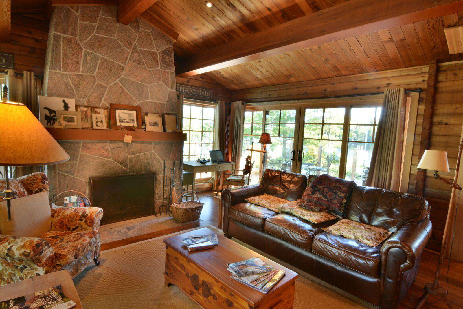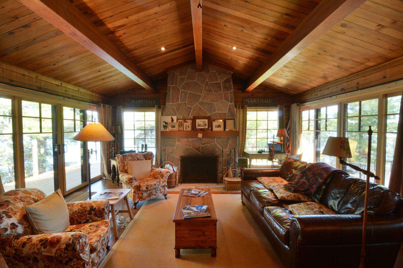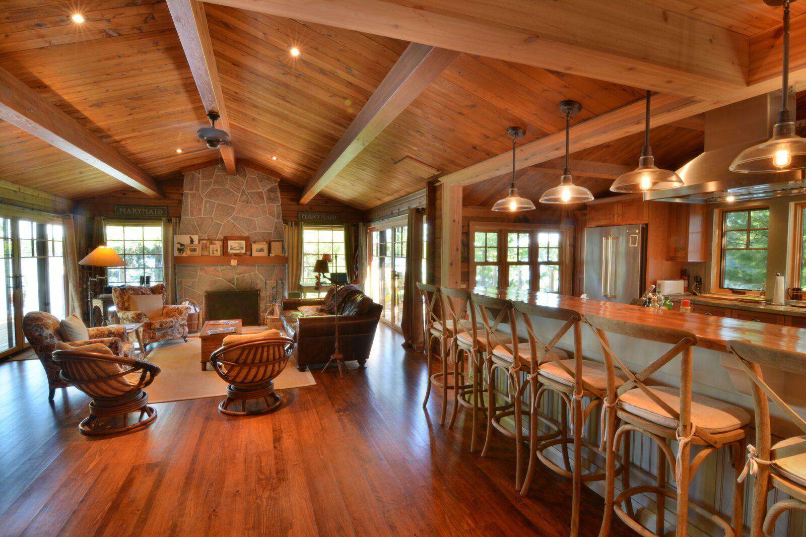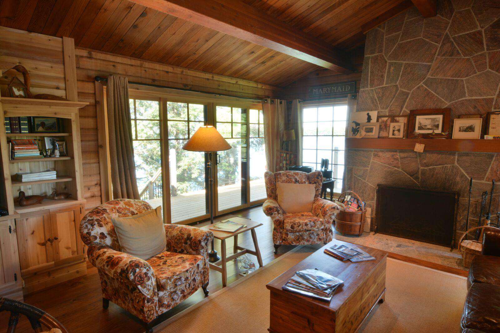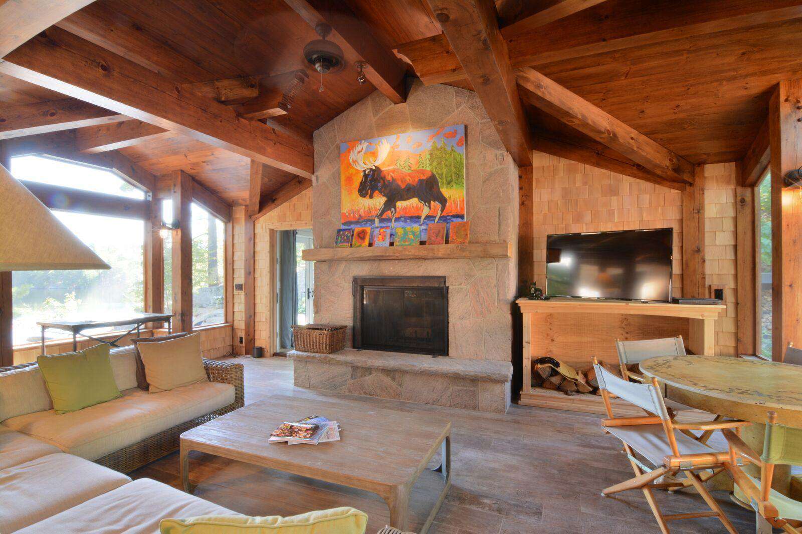 The huge custom-built kitchen is to be admired with massive granite counters, stainless steel appliances, including beverage centre and ice maker, and a 12 foot island with seating for 6 and hardwood flooring throughout the cottage. The original cottage fireplace is the centerpiece of the Muskoka living room with the TV to relax. From the Great Room you can walk out to the wrap around deck to enjoy the stunning views of Lake Muskoka. The Muskoka Room houses a huge stone fireplace and comfortable seating with a TV and a large dining table with enough seating for 10 at the rustic hardwood table.