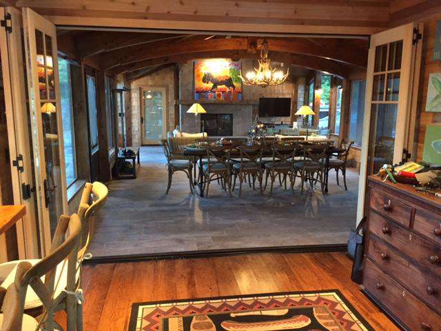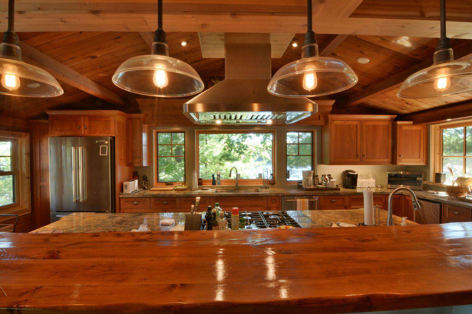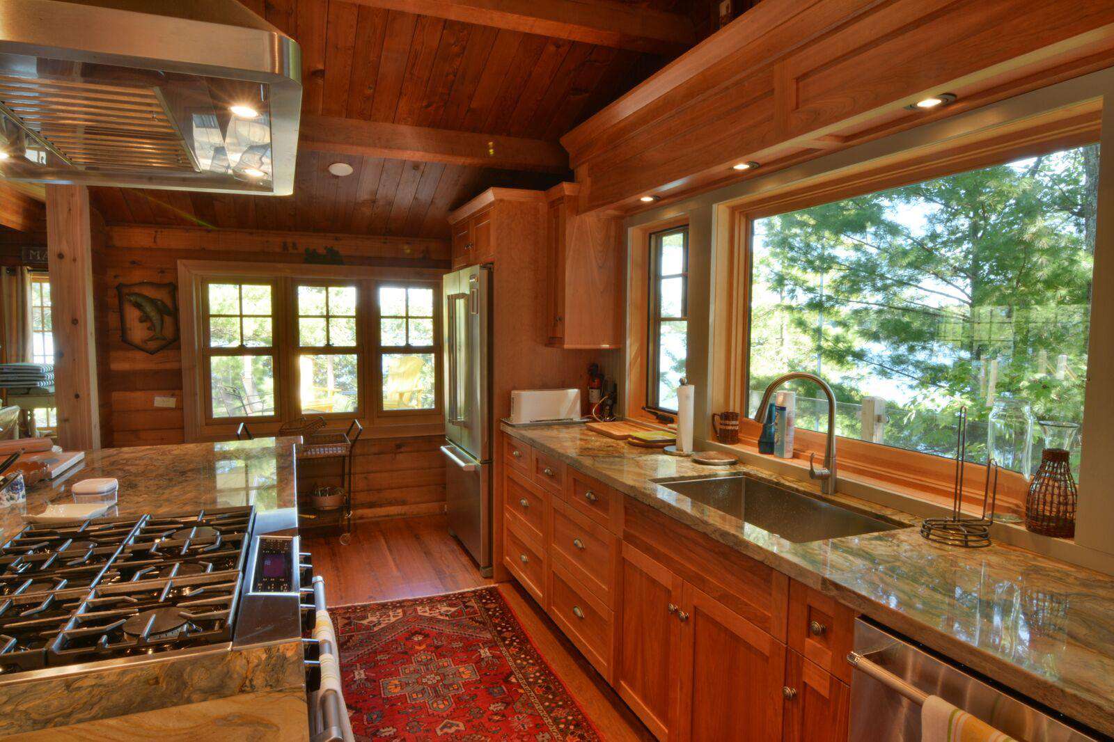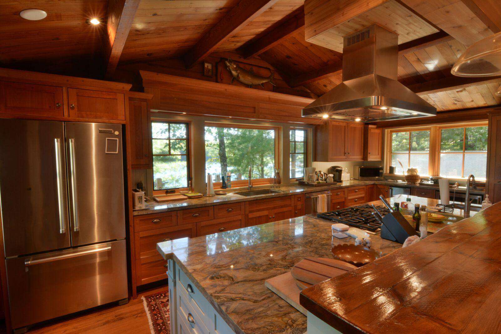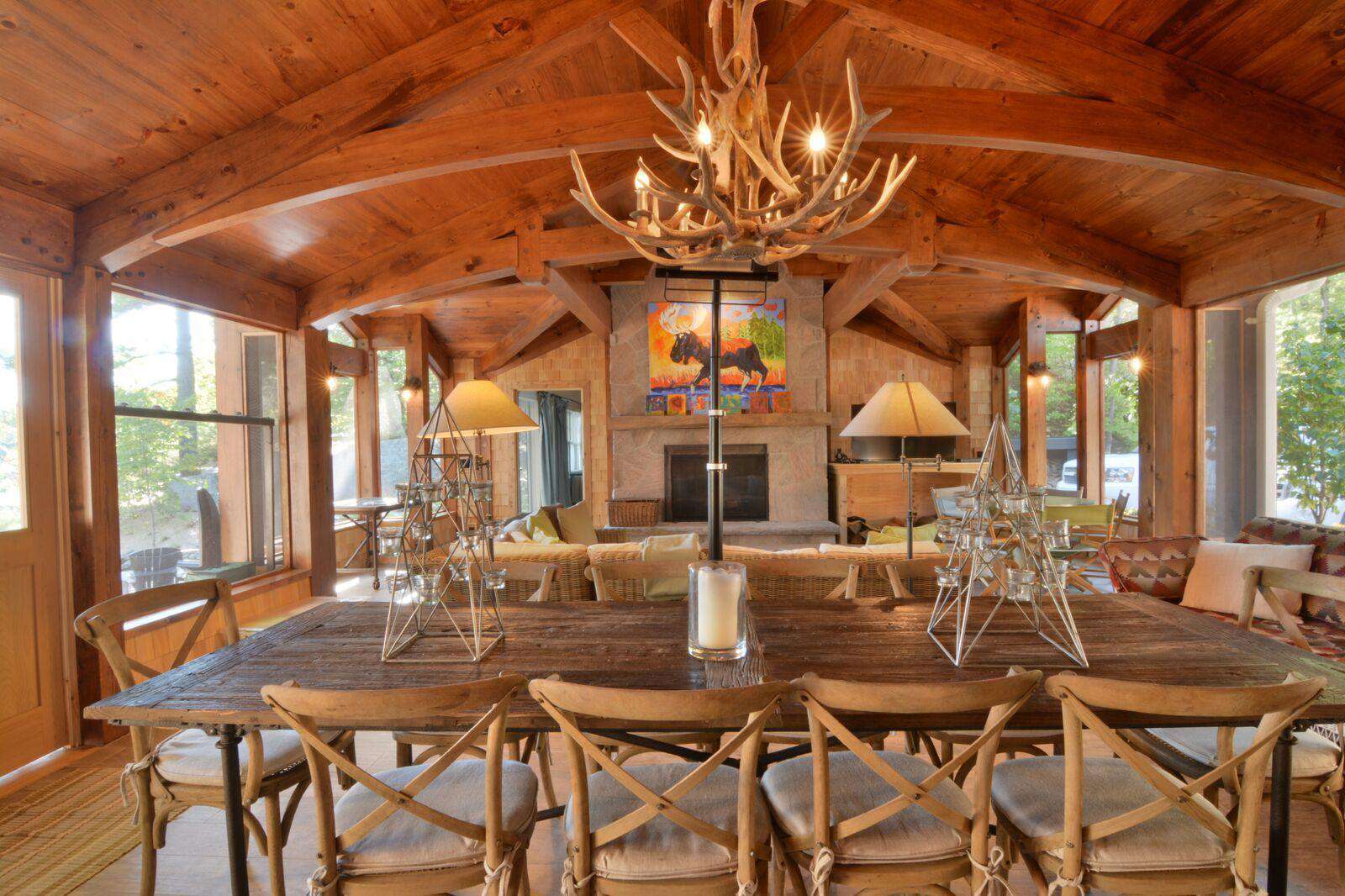 The huge custom-built kitchen is to be admired with massive granite counters, stainless steel appliances, including beverage centre and ice maker, and a 12 foot island with seating for 6 and hardwood flooring throughout the cottage. The original cottage fireplace is the centerpiece of the Muskoka living room with the TV to relax. From the Great Room you can walk out to the wrap around deck to enjoy the stunning views of Lake Muskoka. The Muskoka Room houses a huge stone fireplace and comfortable seating with a TV and a large dining table with enough seating for 10 at the rustic hardwood table.