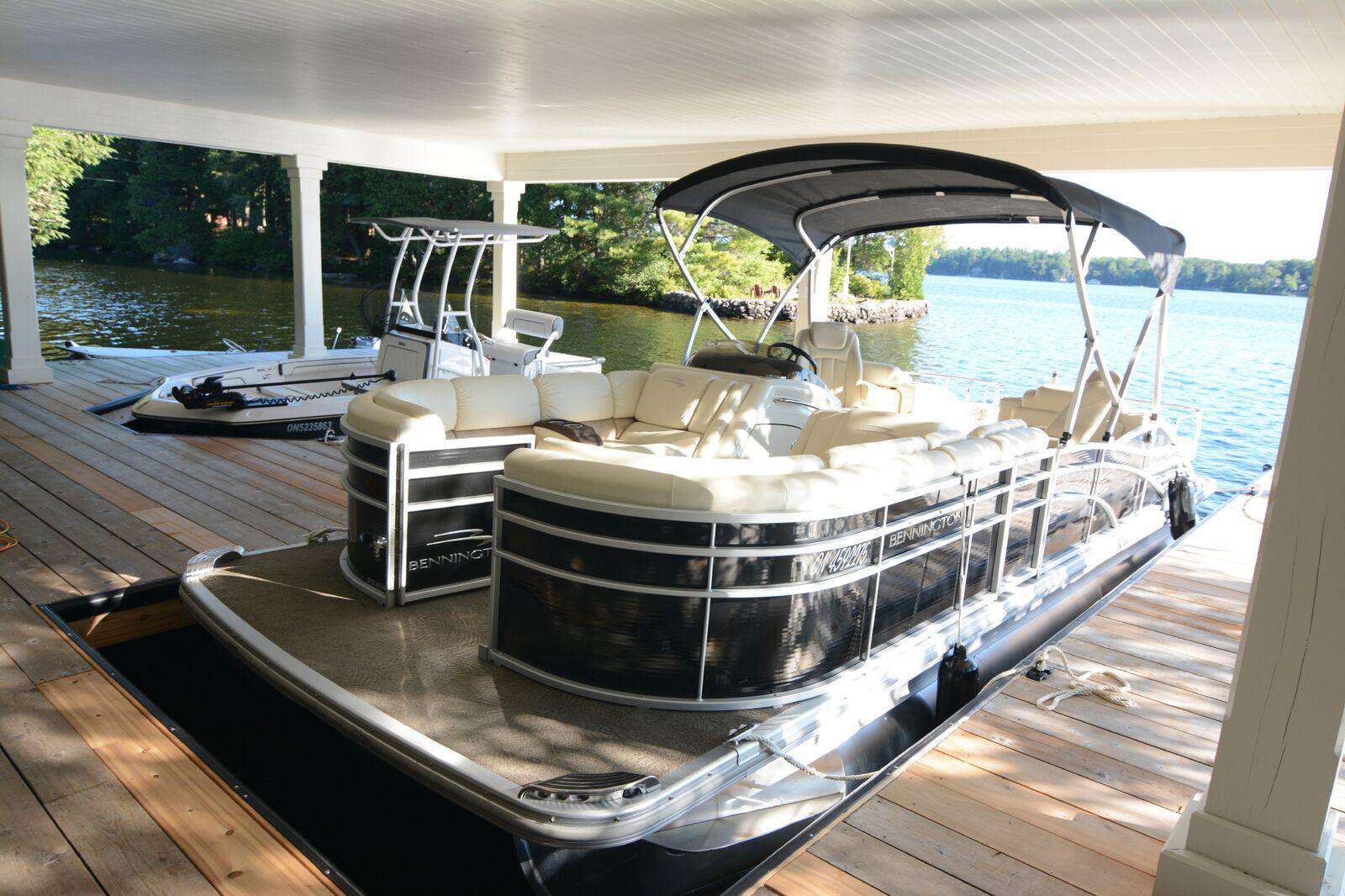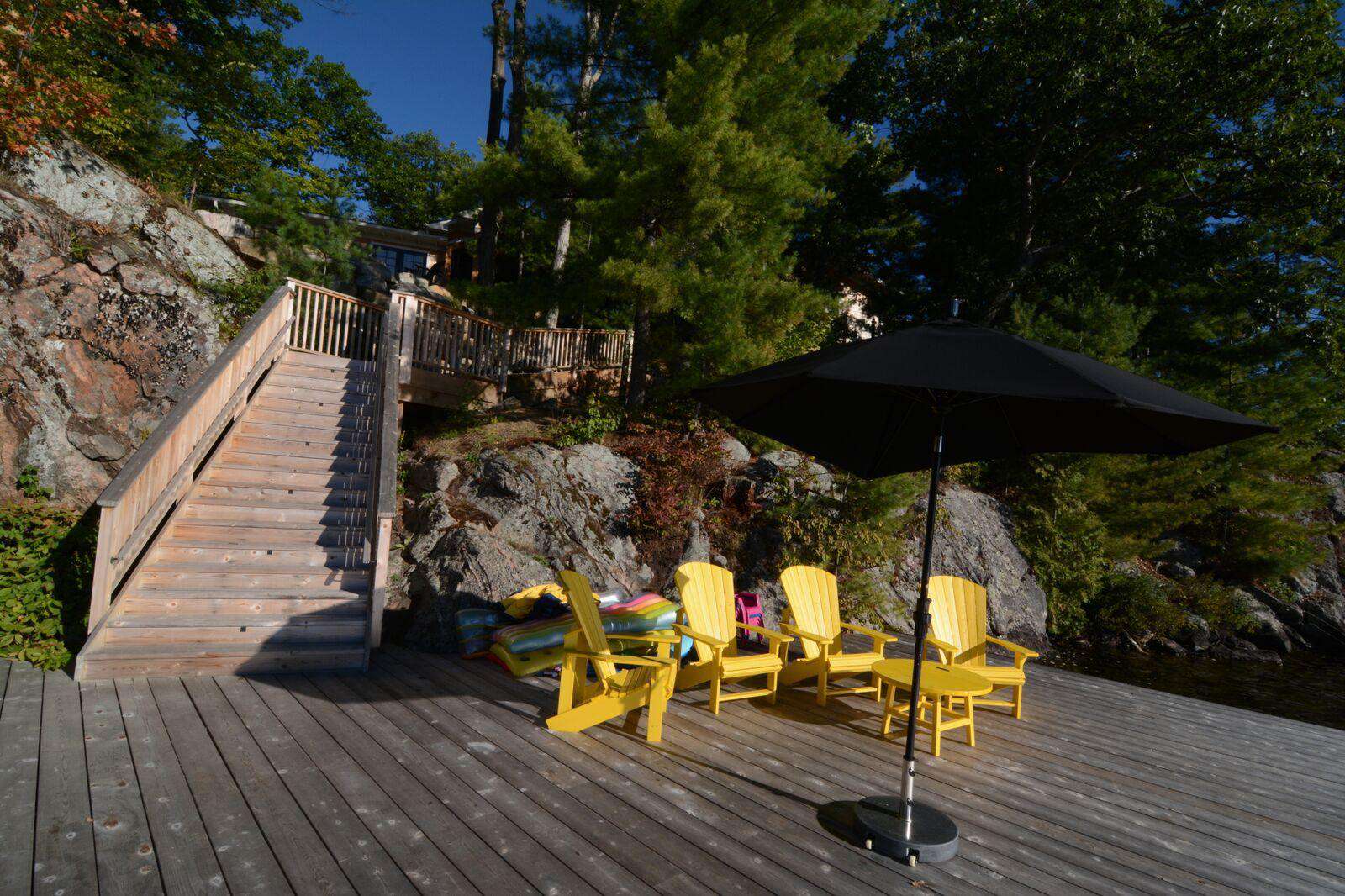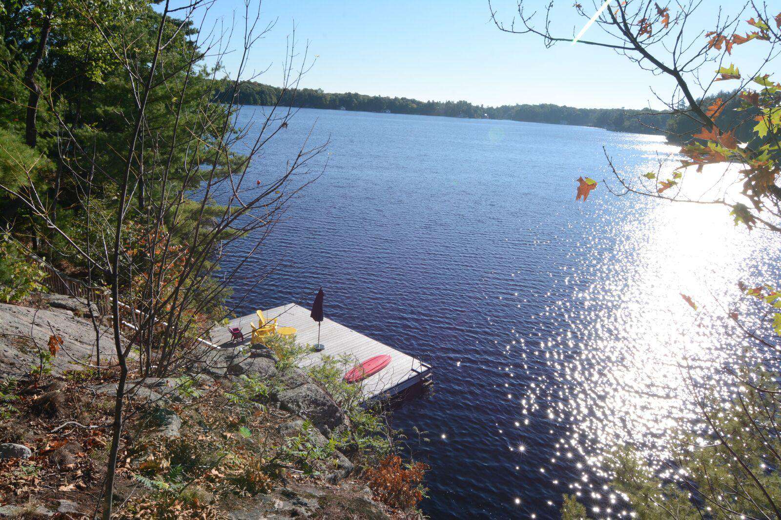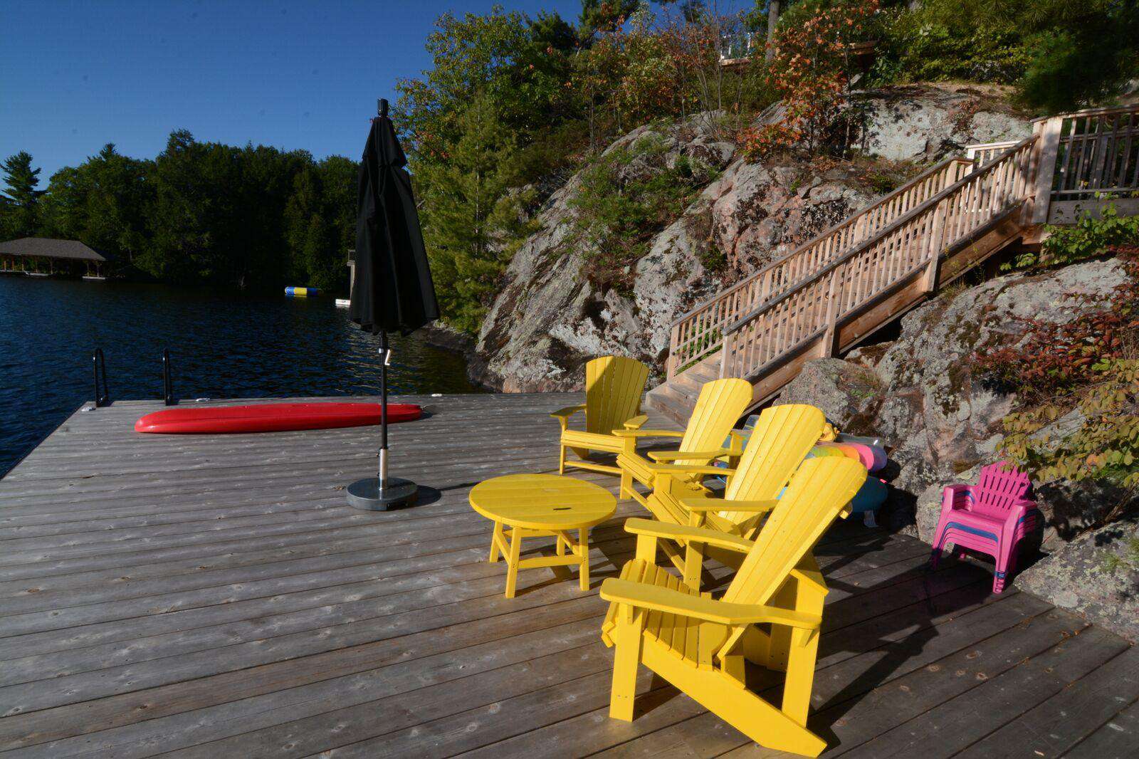 YOL POINT with it's 900' lakefront outdoors is very private with a gentle path down to a grass play area and very large new boat dock where there are 2 covered boat slips plus 2 outside docking landings. Leading out to the front of the cottage from the Muskoka Room and from the one Master Suite is a stone landing area with Muskoka chairs and propane fire pit then a walk down flagstone steps leads to a new swimming dock which extends from the front of the cottage. Deep water surrounds. From the boat dock there is a small protected bay, great for kids to paddle around. Plenty of fun water activities and toys for guests to enjoy!