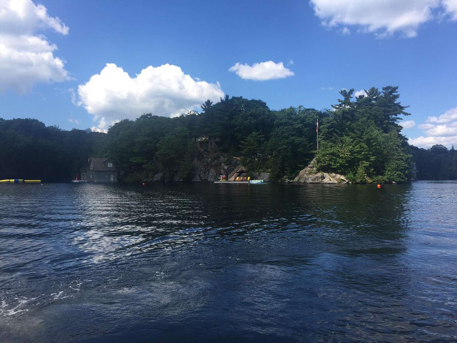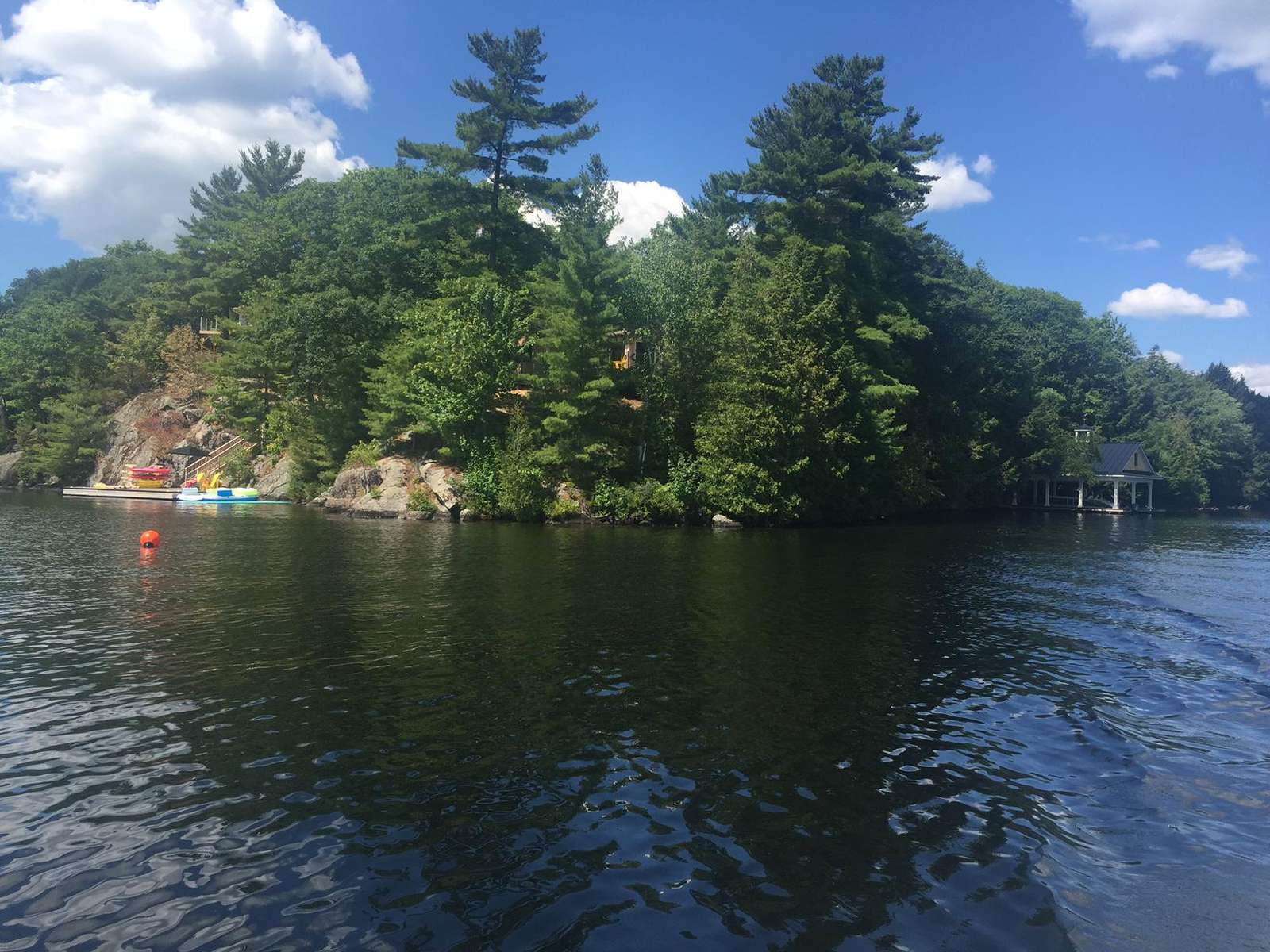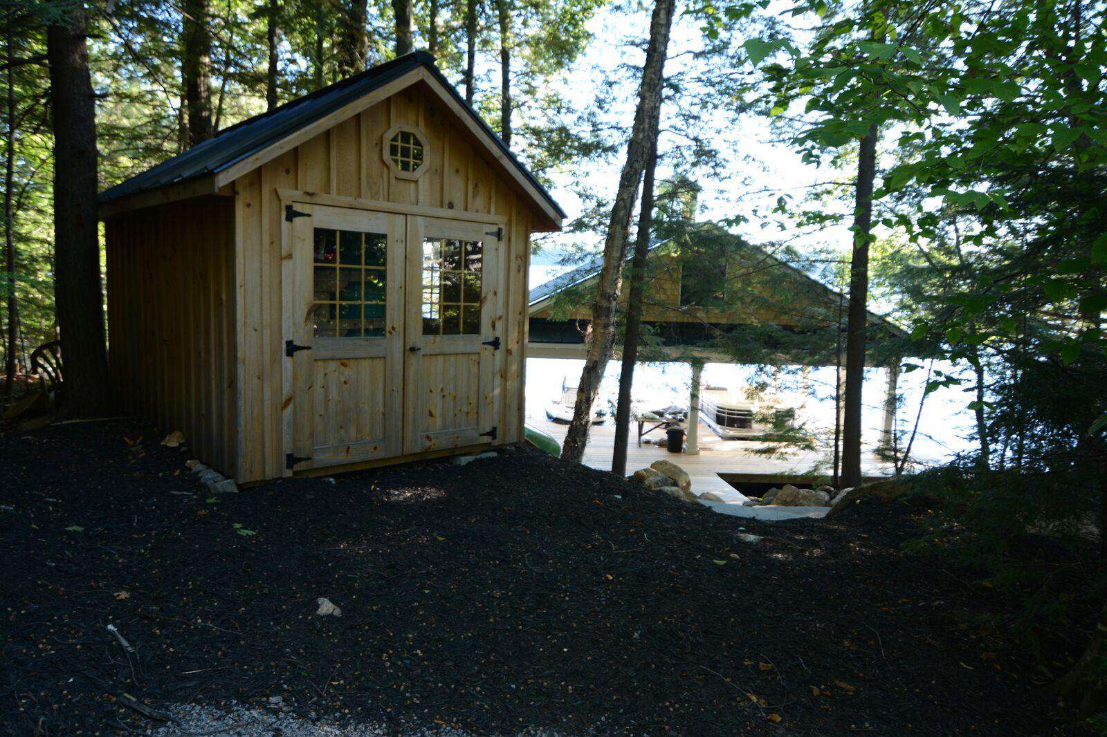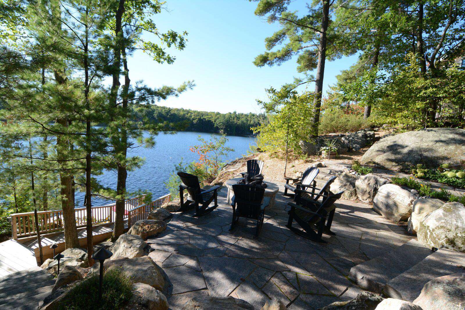 YOL POINT with it's 900' lakefront outdoors is very private with a gentle path down to a grass play area and very large new boat dock where there are 2 covered boat slips plus 2 outside docking landings. Leading out to the front of the cottage from the Muskoka Room and from the one Master Suite is a stone landing area with Muskoka chairs and propane fire pit then a walk down flagstone steps leads to a new swimming dock which extends from the front of the cottage. Deep water surrounds. From the boat dock there is a small protected bay, great for kids to paddle around. Plenty of fun water activities and toys for guests to enjoy!