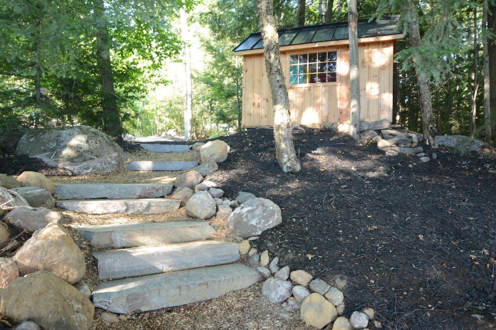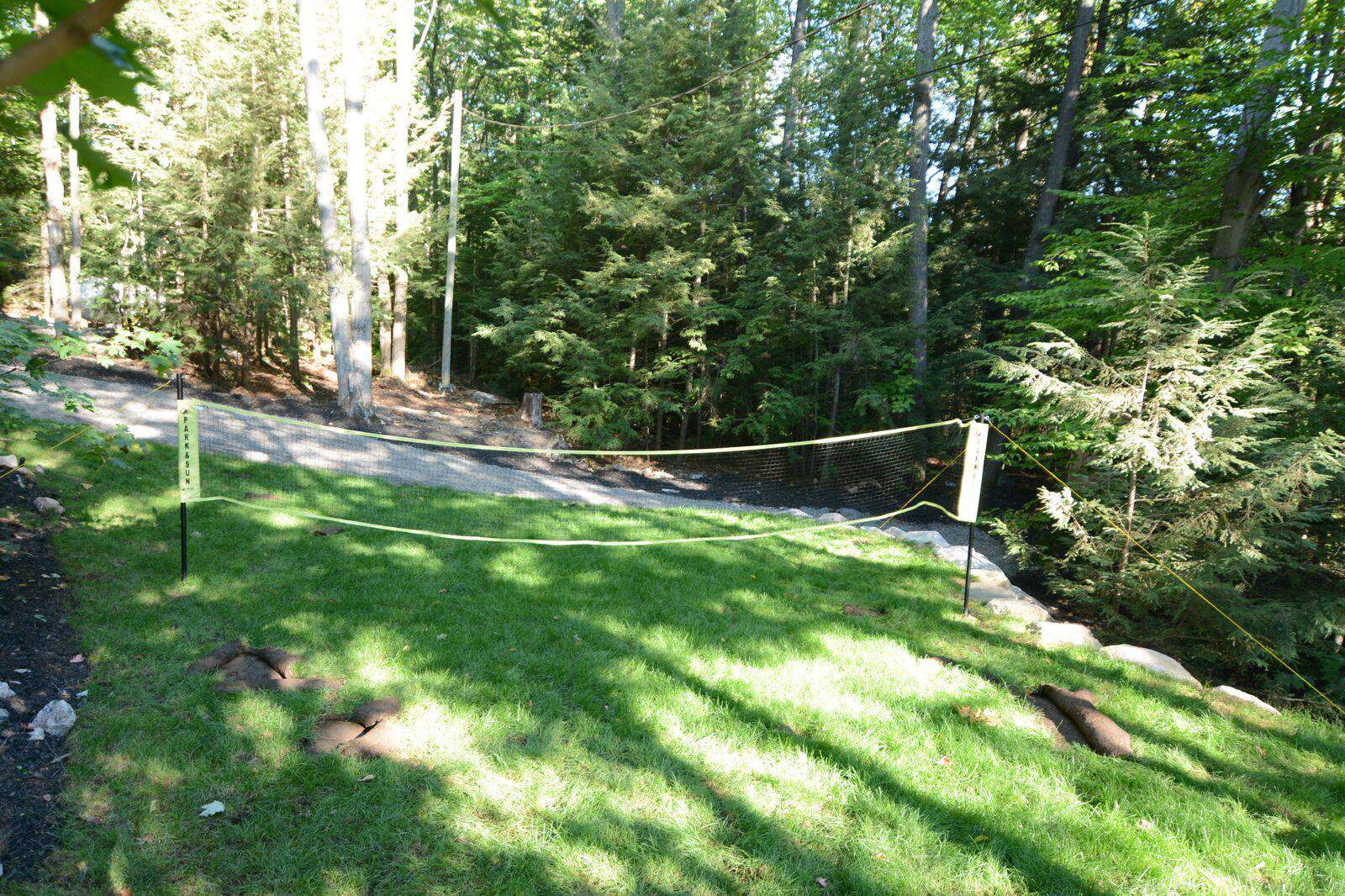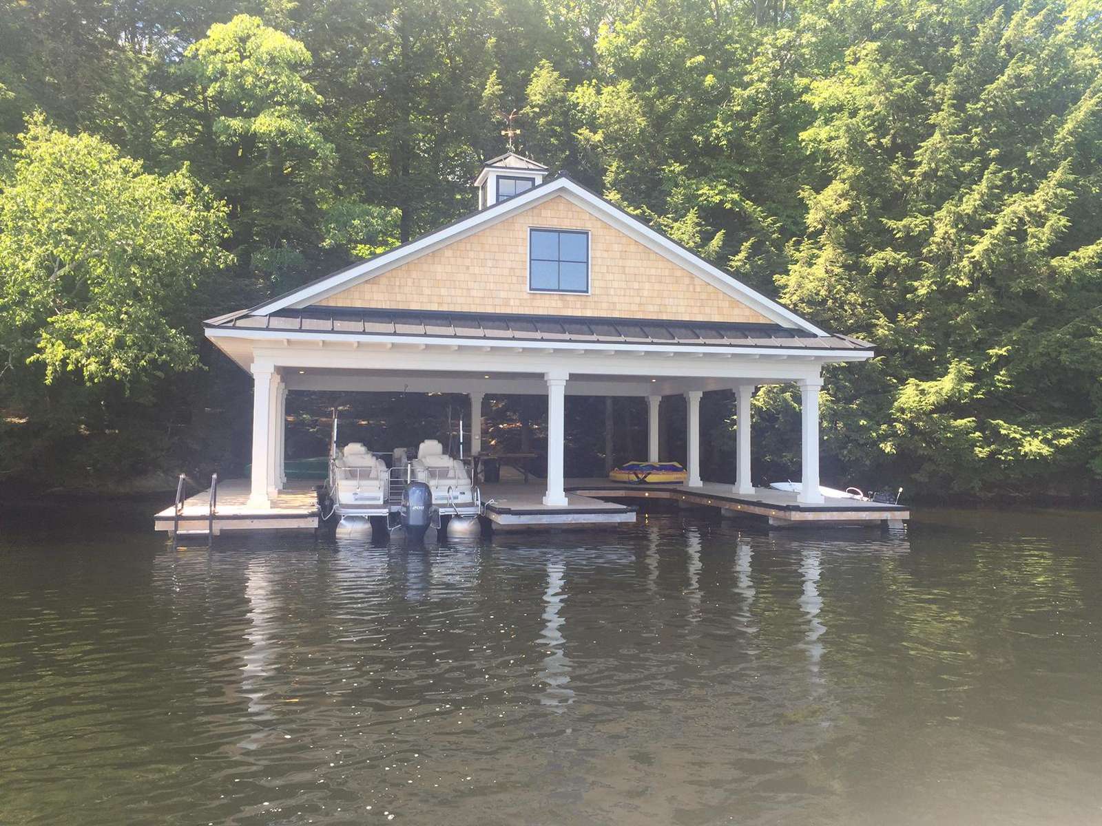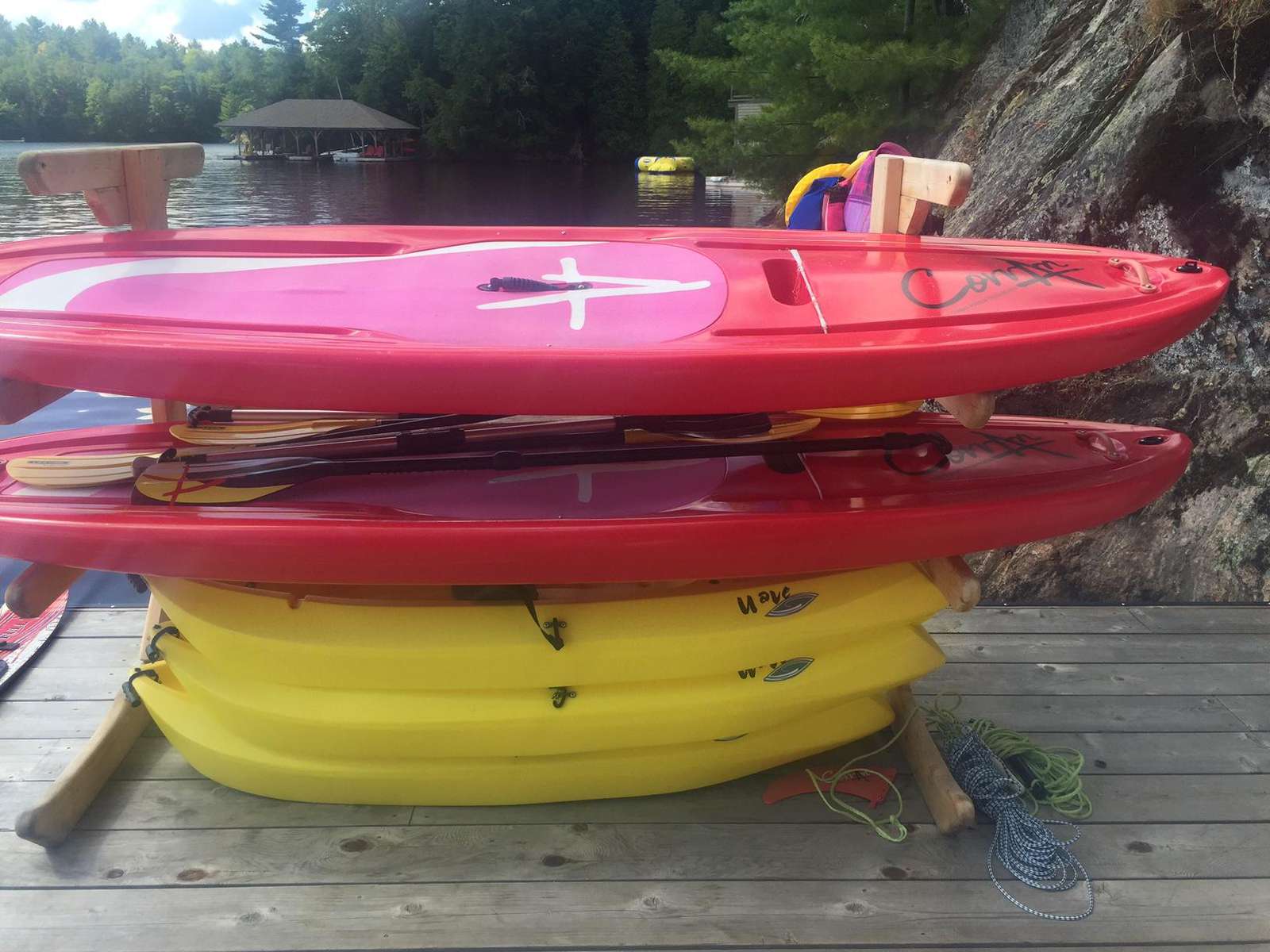 YOL POINT with it's 900' lakefront outdoors is very private with a gentle path down to a grass play area and very large new boat dock where there are 2 covered boat slips plus 2 outside docking landings. Leading out to the front of the cottage from the Muskoka Room and from the one Master Suite is a stone landing area with Muskoka chairs and propane fire pit then a walk down flagstone steps leads to a new swimming dock which extends from the front of the cottage. Deep water surrounds. From the boat dock there is a small protected bay, great for kids to paddle around. Plenty of fun water activities and toys for guests to enjoy!
