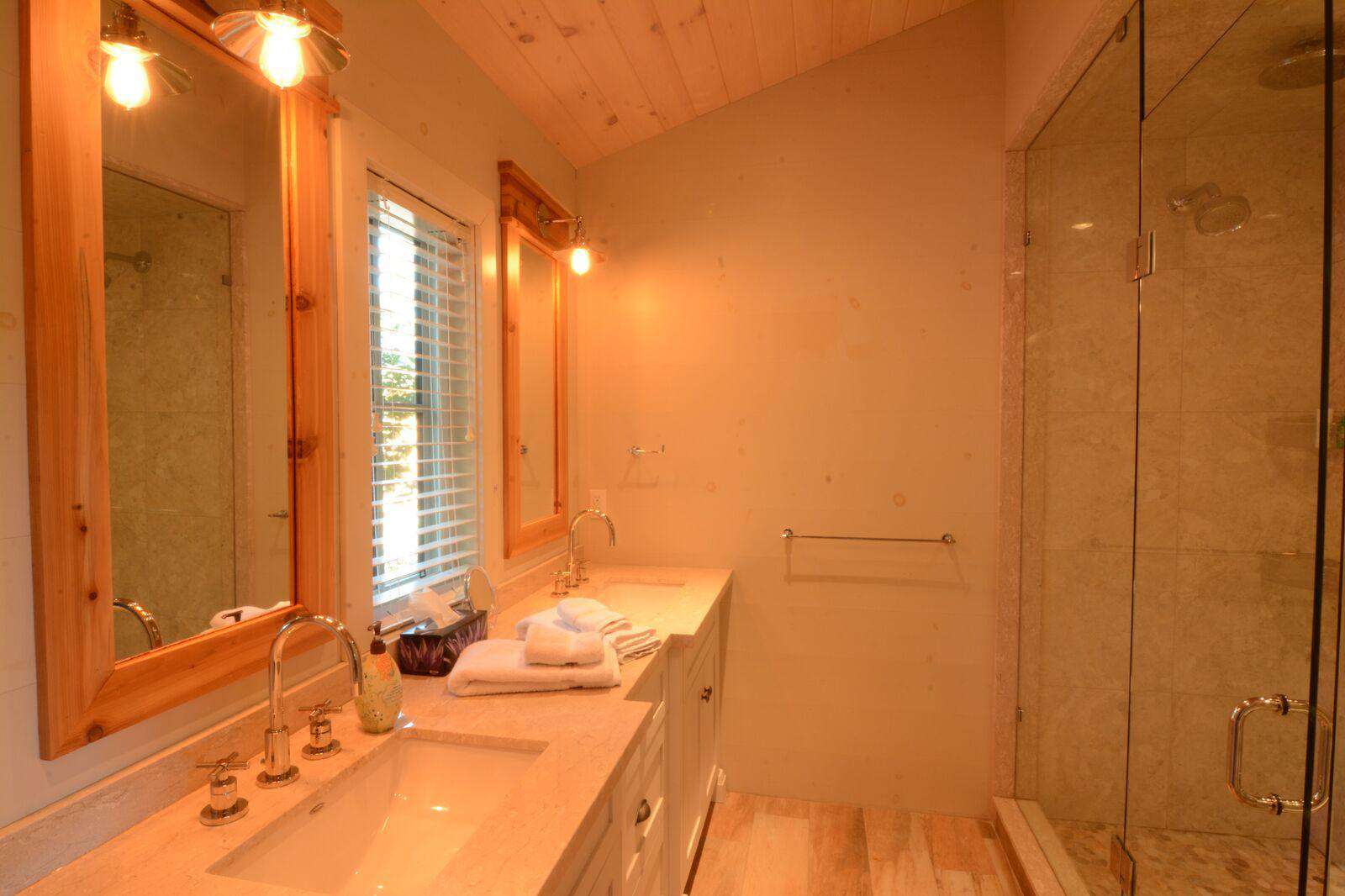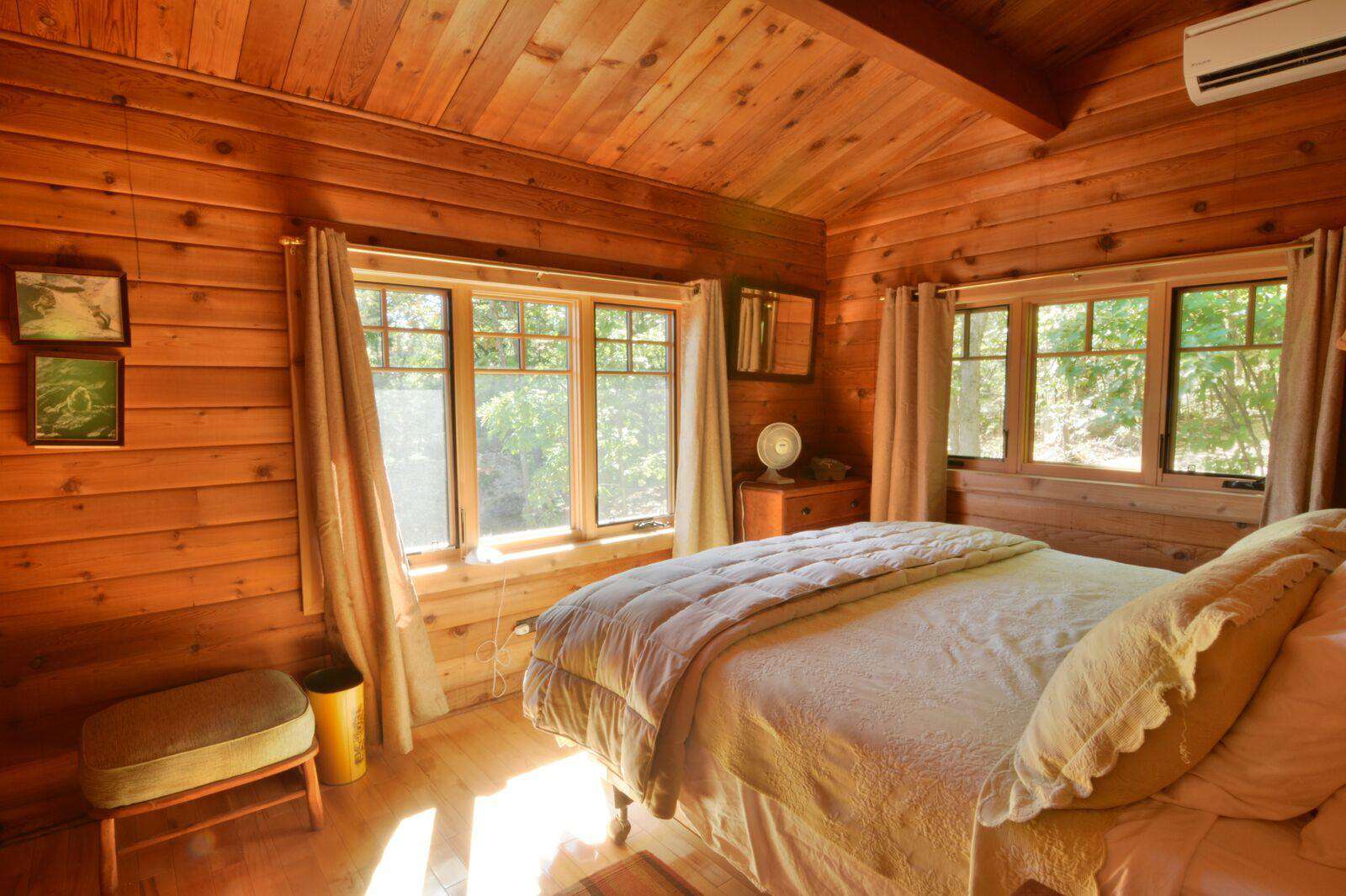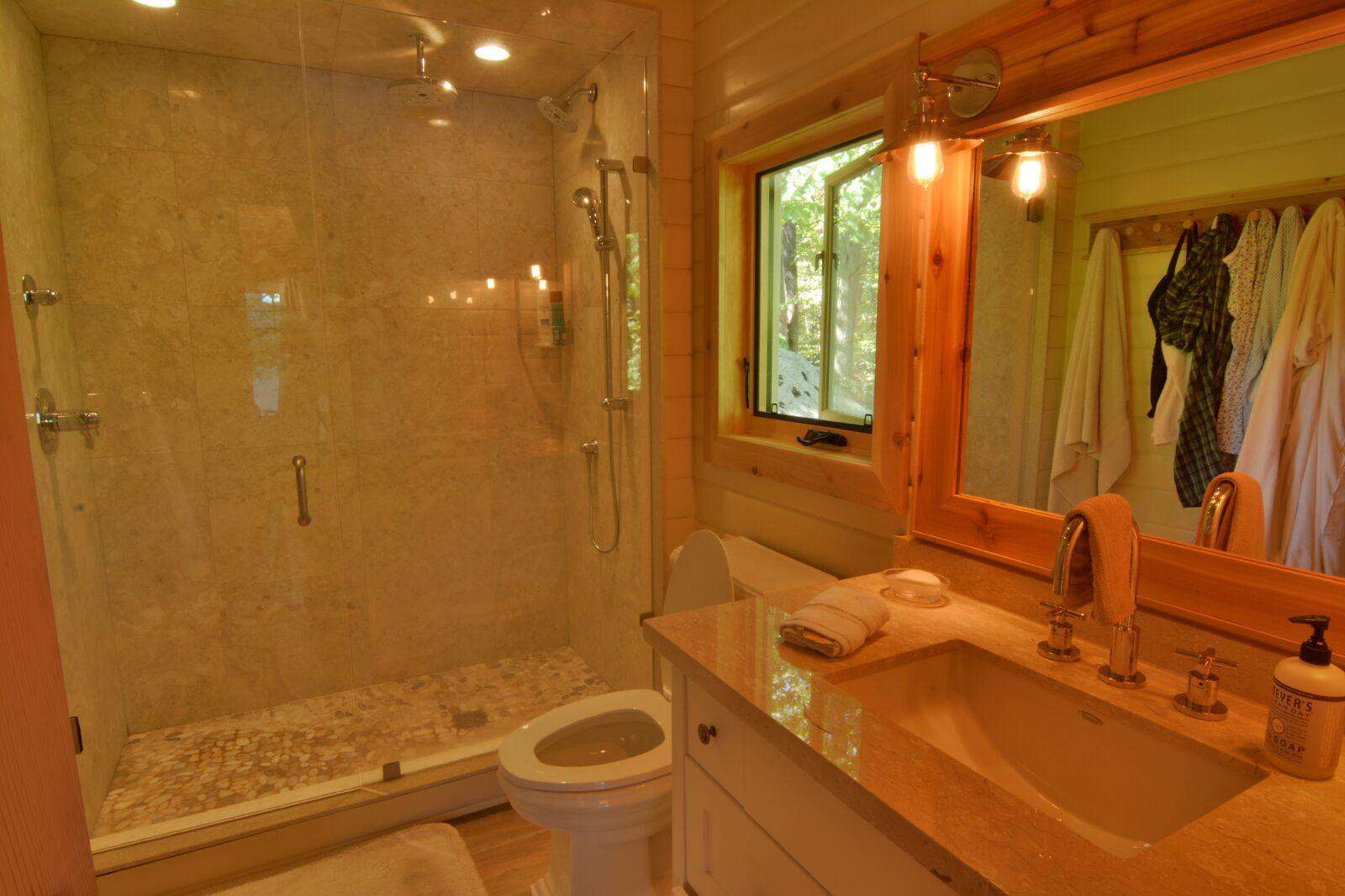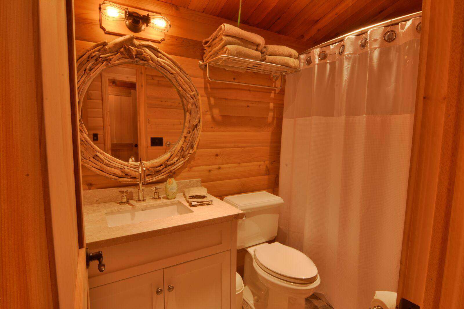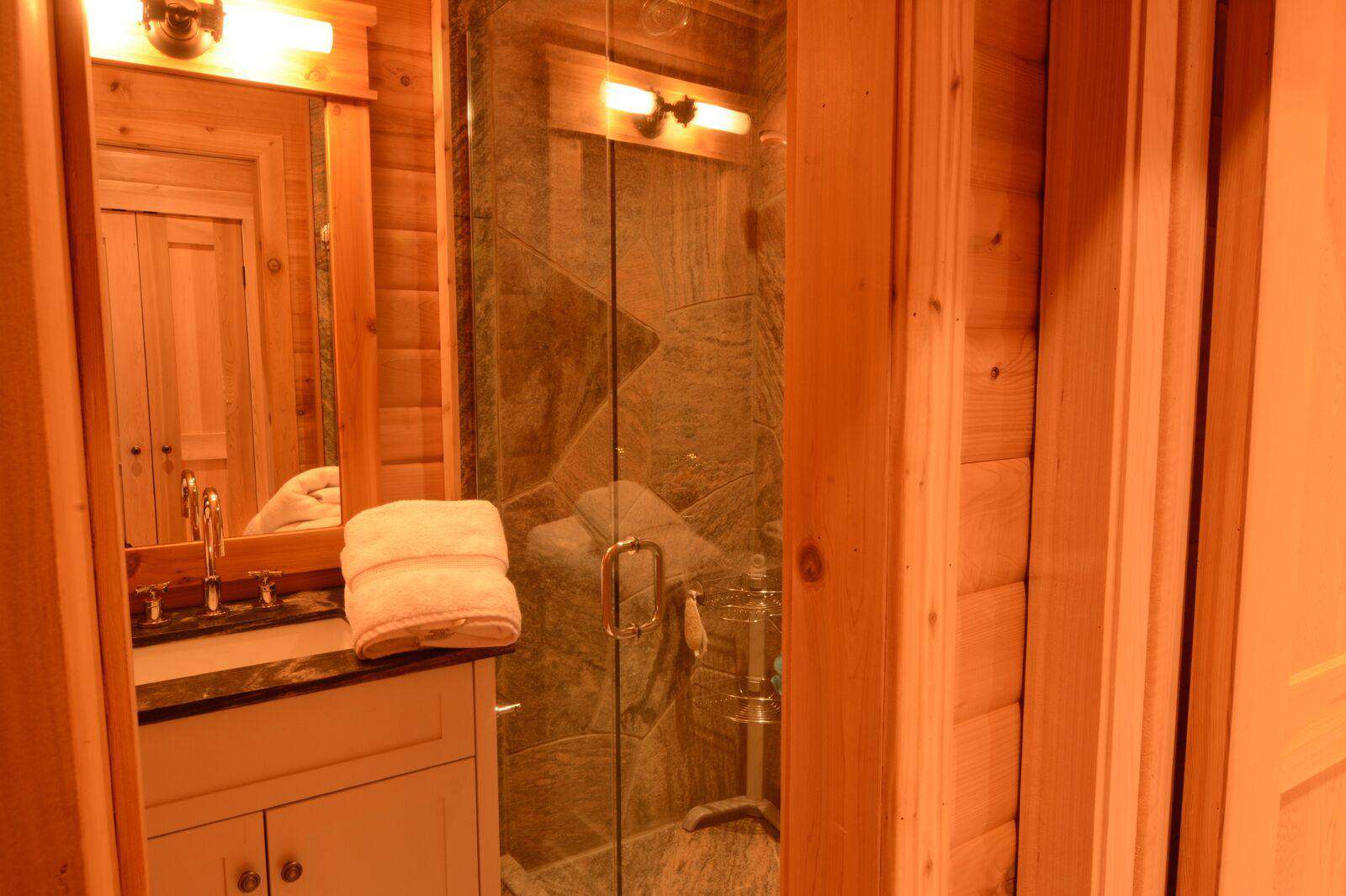 The main cottage has 5 bedrooms with 2 master king bedrooms each with 3 piece ensuite including glass showers. The master suites flank each end and in the main building there are 3 additional bedrooms - one double bedroom with a 2 piece ensuite, second room with a double log bunk beds and another queen bedroom with walkout to deck. The main floor bathroom has a toilet, sink, and shower/tub and additional glass shower and sink.